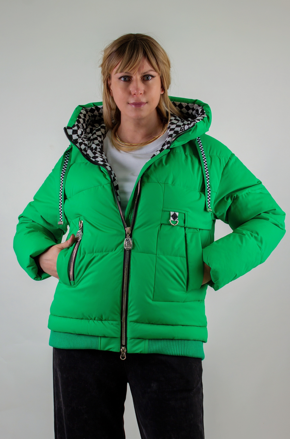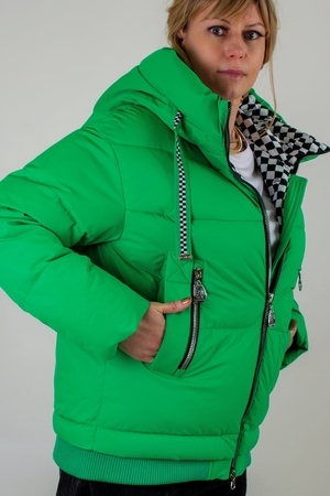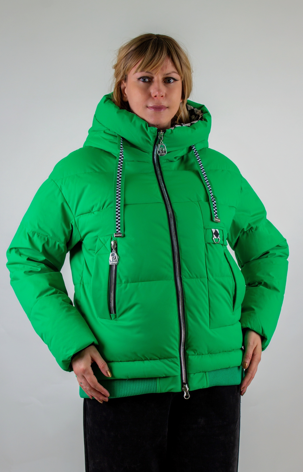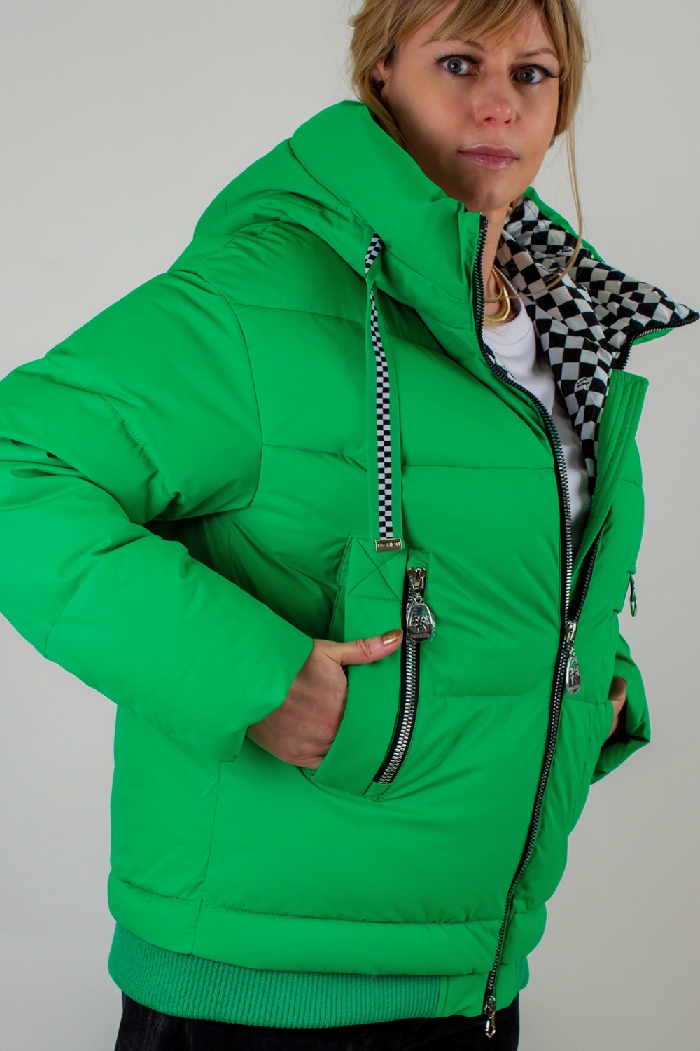 • Капюшон: объёмный, с регулировкой по глубине и окантовкой контрастным шнуром. Внутренняя отделка капюшона – оригинальный чёрно-белый шахматный принт, придающий модели дерзкий, игривый характер.