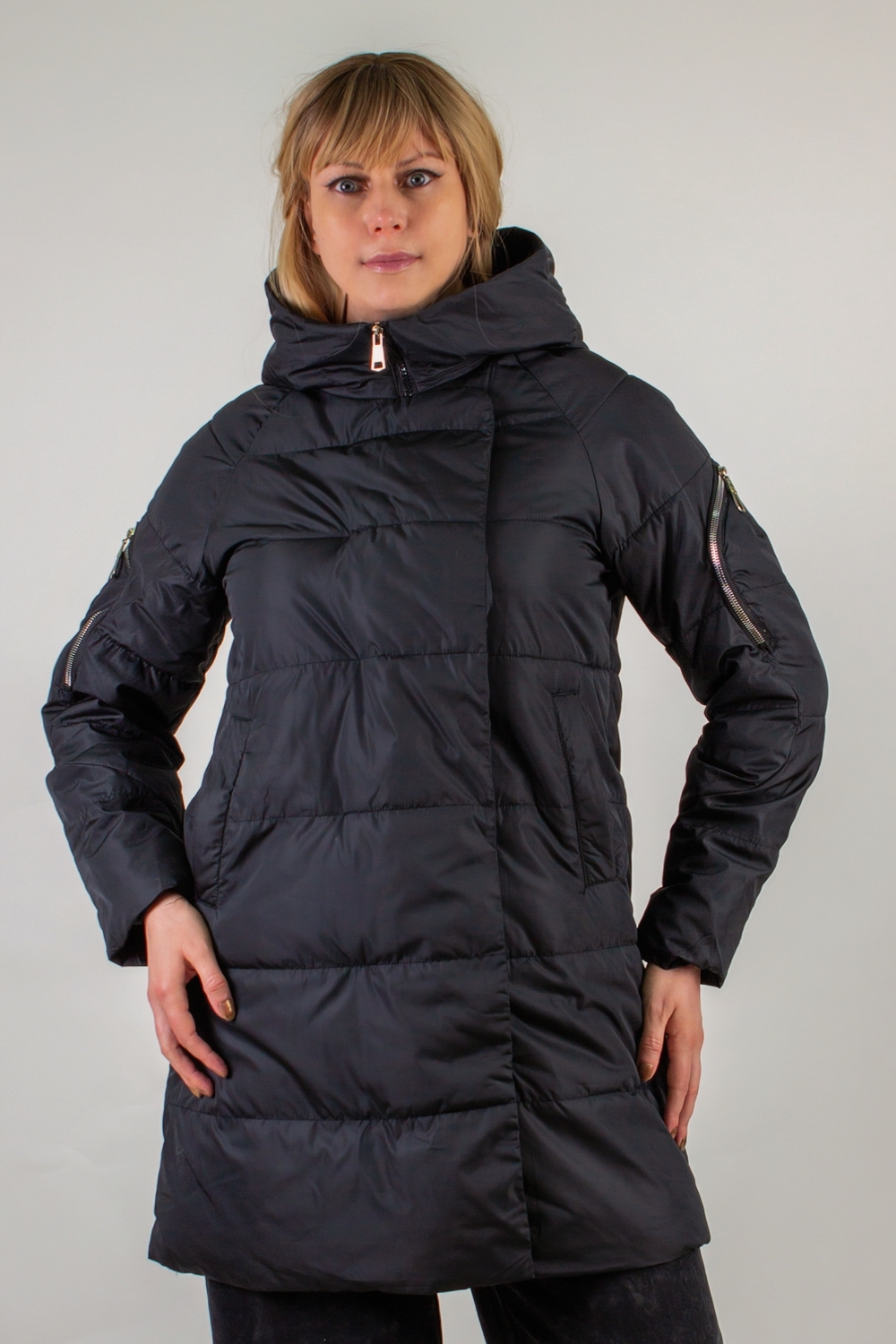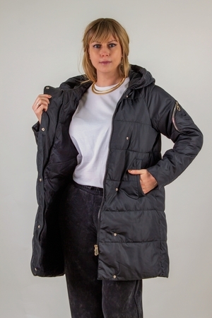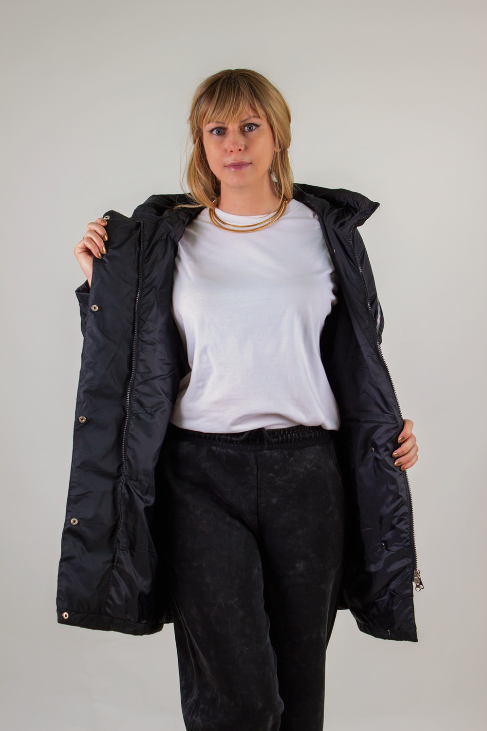 Горизонтальная простежка придает изделию визуальную легкость. Благодаря ей куртка сохраняет идеальную форму, не теряя элегантности, а наполнитель обеспечивает оптимальный уровень теплоизоляции без излишнего веса. Общая длина 88 см закрывает бедра, создавая стройный силуэт и надежно защищая низ спины от холода.