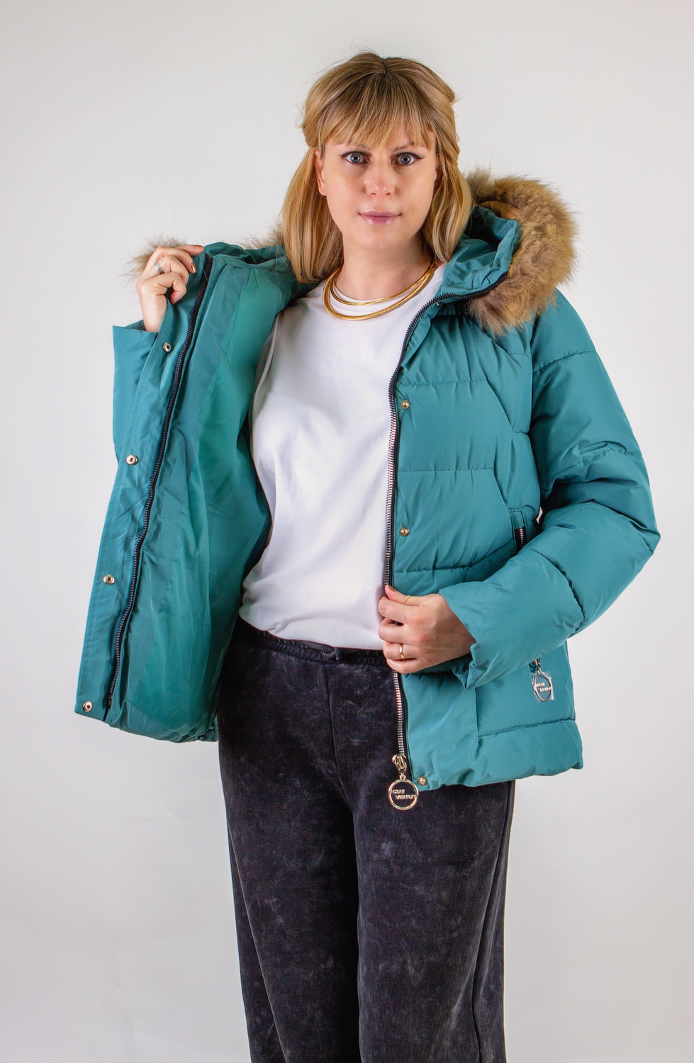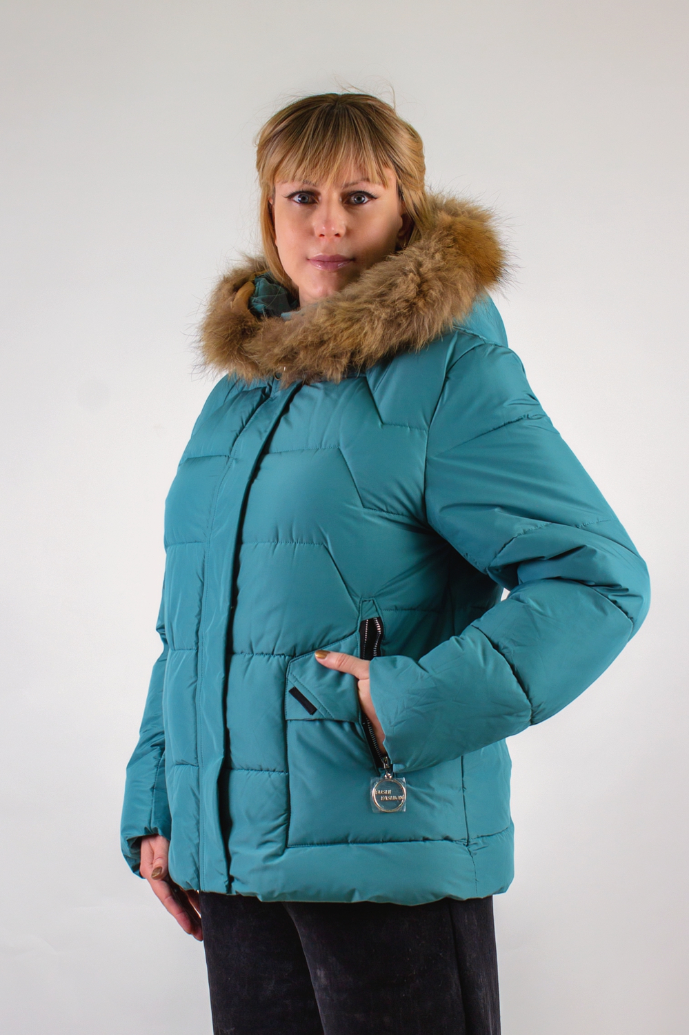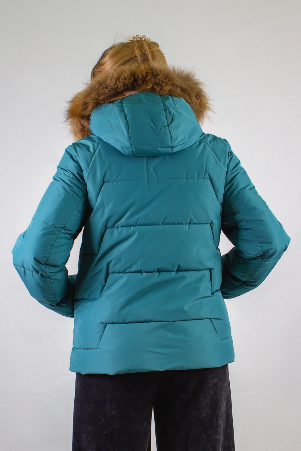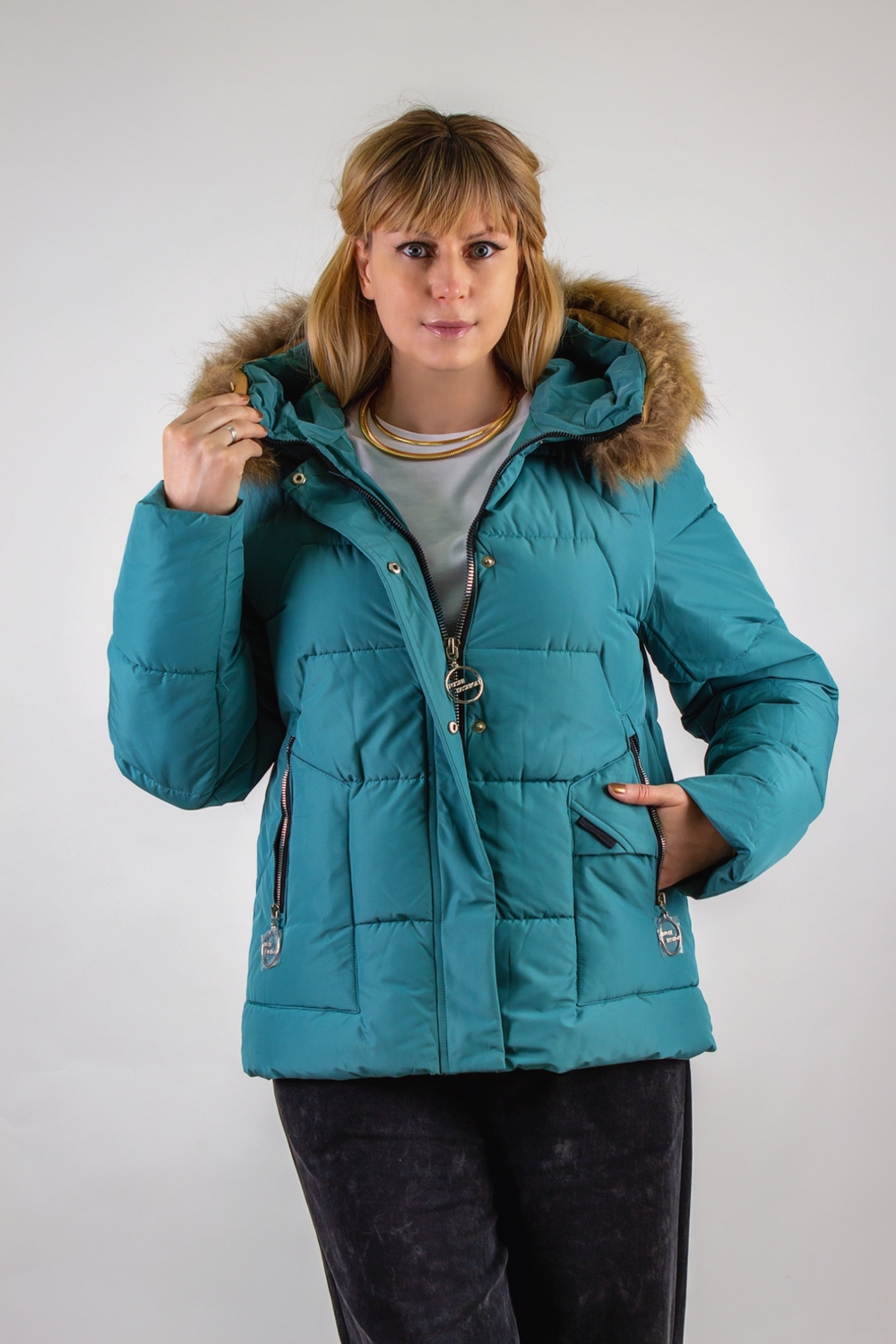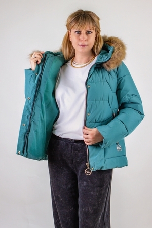 Капюшон с воротником-стойкой оформлен натуральным мехом – мягким и приятным на ощупь. Он надёжно закрывает шею и подбородок, создавая дополнительный барьер для холодного воздуха.