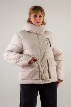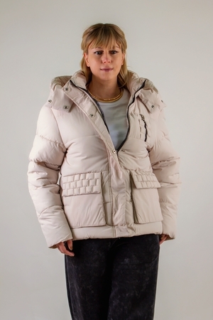 Удобная застёжка-молния закрыта дополнительной планкой на кнопках, что защищает от ветра и влаги, а также придаёт образу завершённость. Капюшон с воротником-стойкой фиксируется кнопками и обеспечивает надёжную защиту шеи и головы без необходимости использования шарфа. При необходимости капюшон легко снимается, превращая куртку в классический вариант без лишнего объёма.
