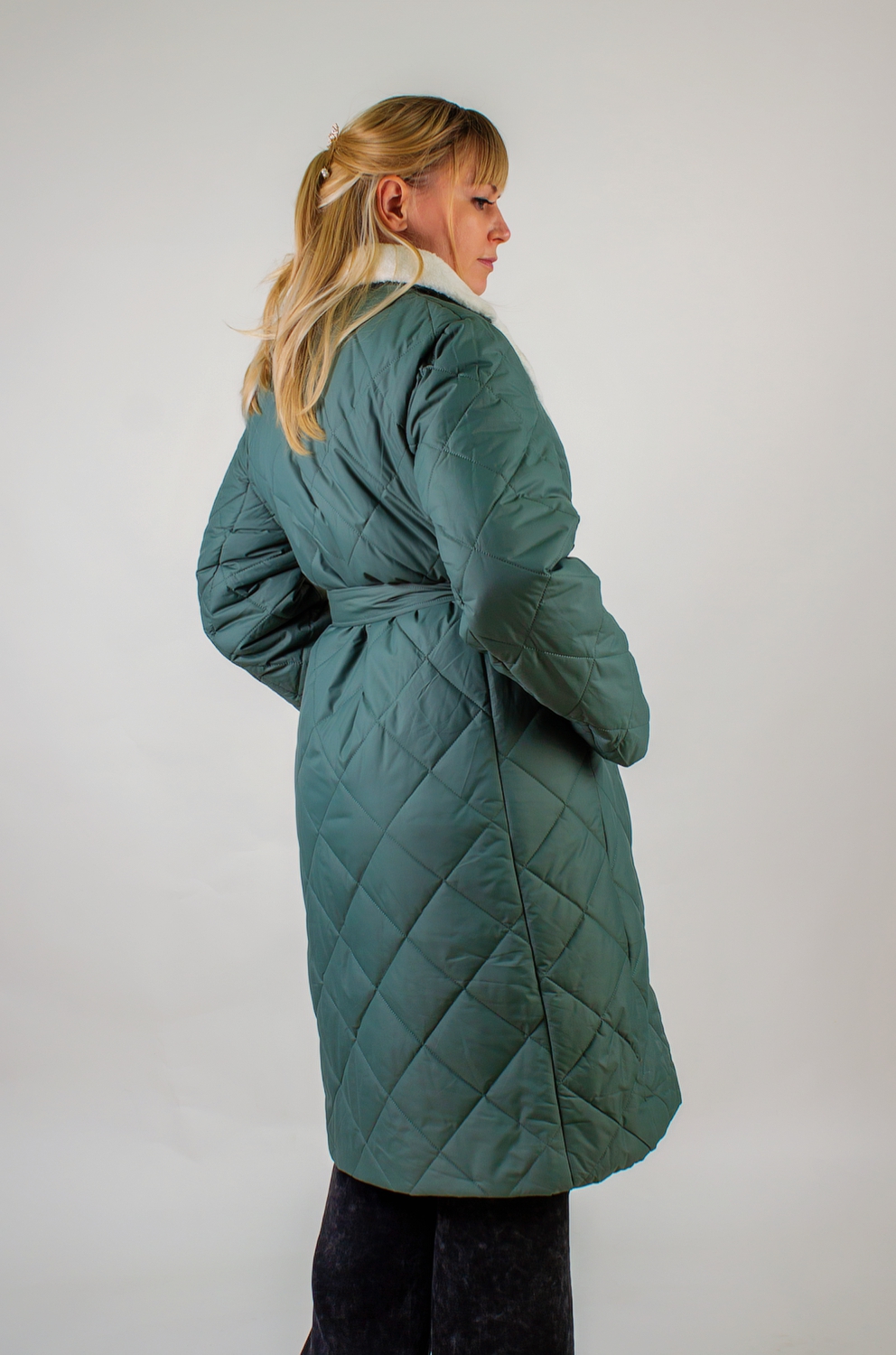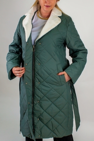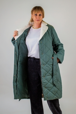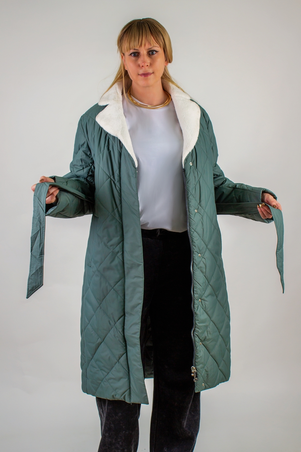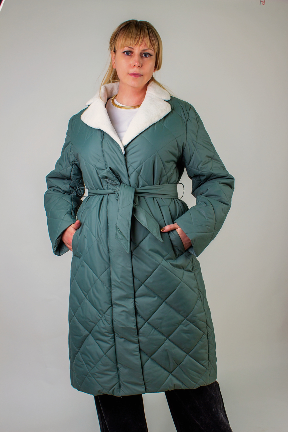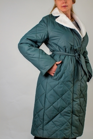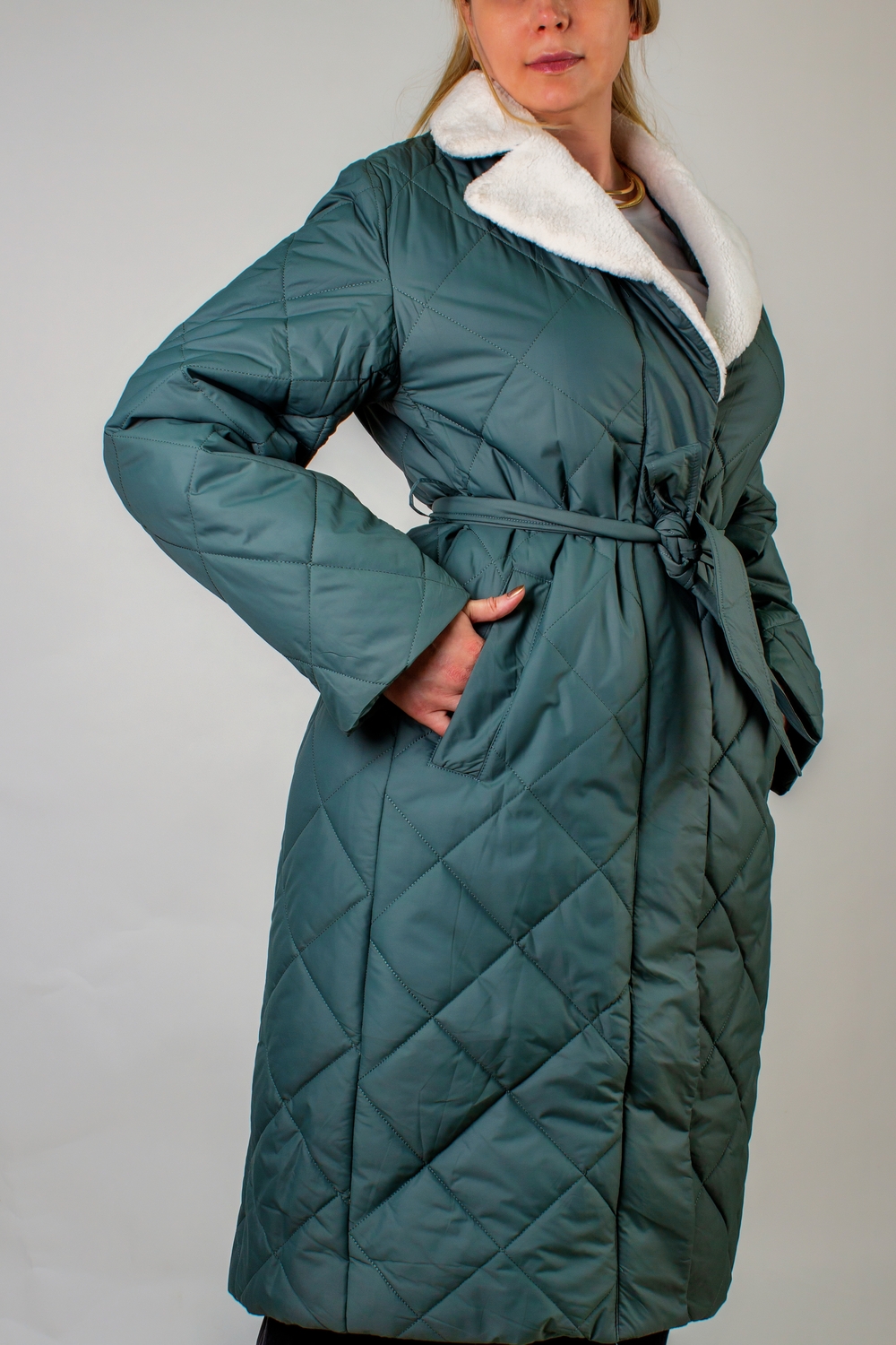 • Внутренний карман на молнии для телефона, кошелька и документов.• Эластичные трикотажные манжеты на рукавах, не пропускающие холодный воздух.                                                                                                                                                                               • Съёмный пояс из основной ткани, регулирующий посадку по фигуре и подчёркивающий талию. Стильный бирюзовый цвет делает куртку свежей и современной: он гармонично сочетается как с нейтральными, так и с яркими оттенками аксессуаров. Такая куртка-пальто станет идеальным решением для прогулок по зимнему городу, поездок и деловых встреч.