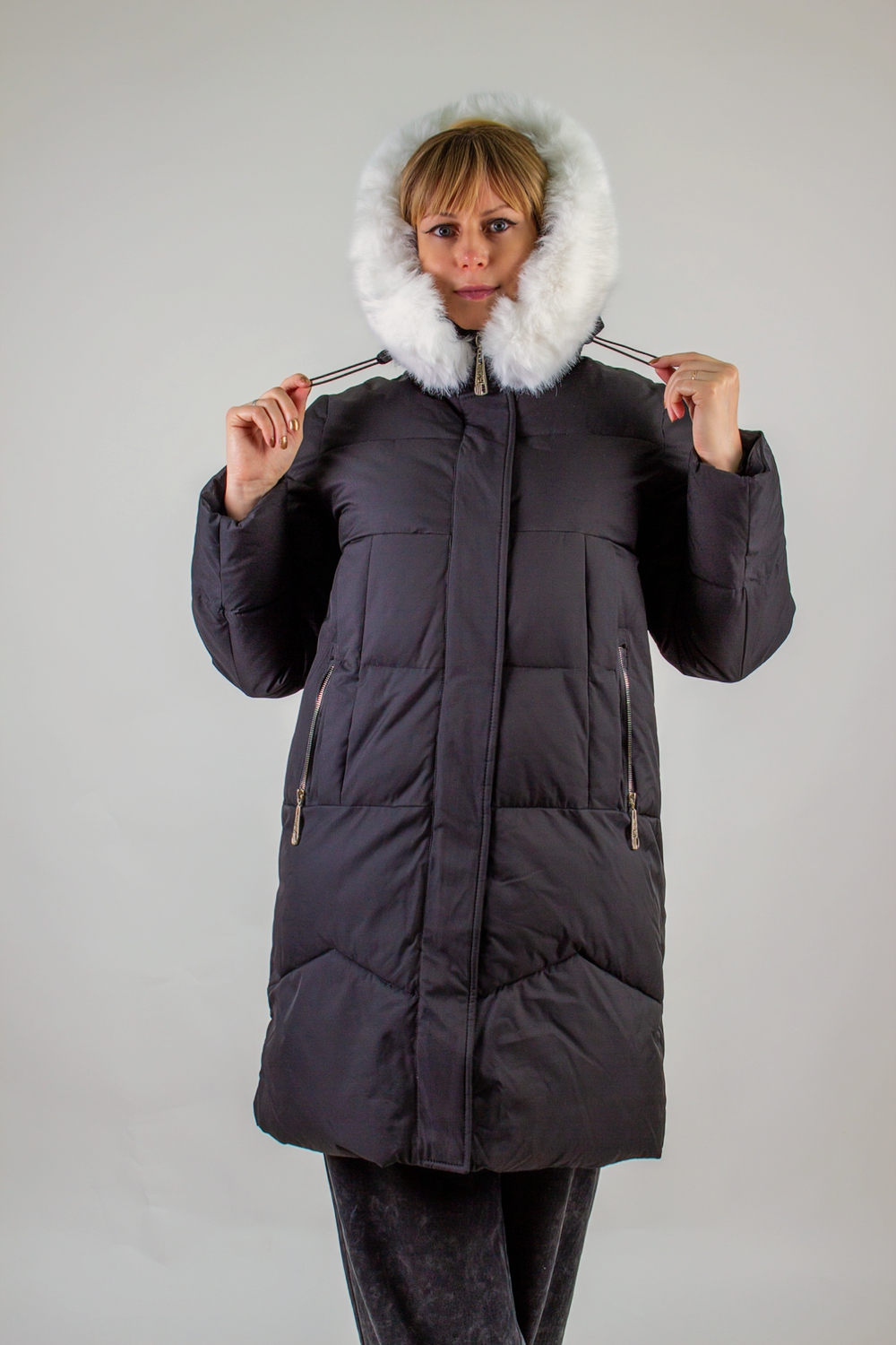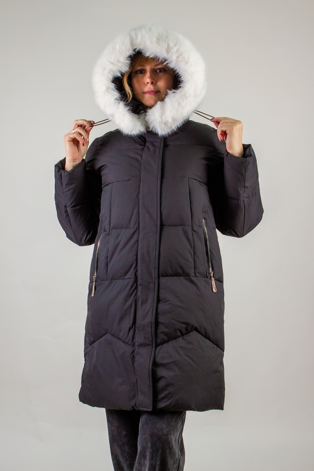 Капюшон с высоким воротником-стойкой на фиксаторах надежно удерживает тепло и защищает от непогоды. По контуру капюшона отстегивающаяся  аккуратная опушка из качественного искусственного меха белого цвета – стильный и практичный элемент, который можно при желании отстегнуть. Куртка застегивается на двухзамковую молнию, дополненную планкой с кнопками, что гарантирует защиту от продувания и сохраняет тепло внутри.