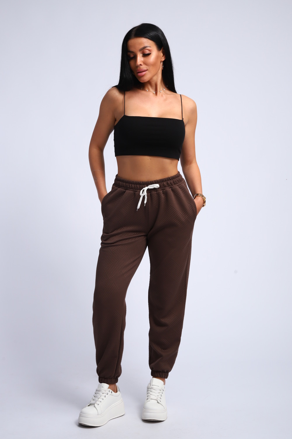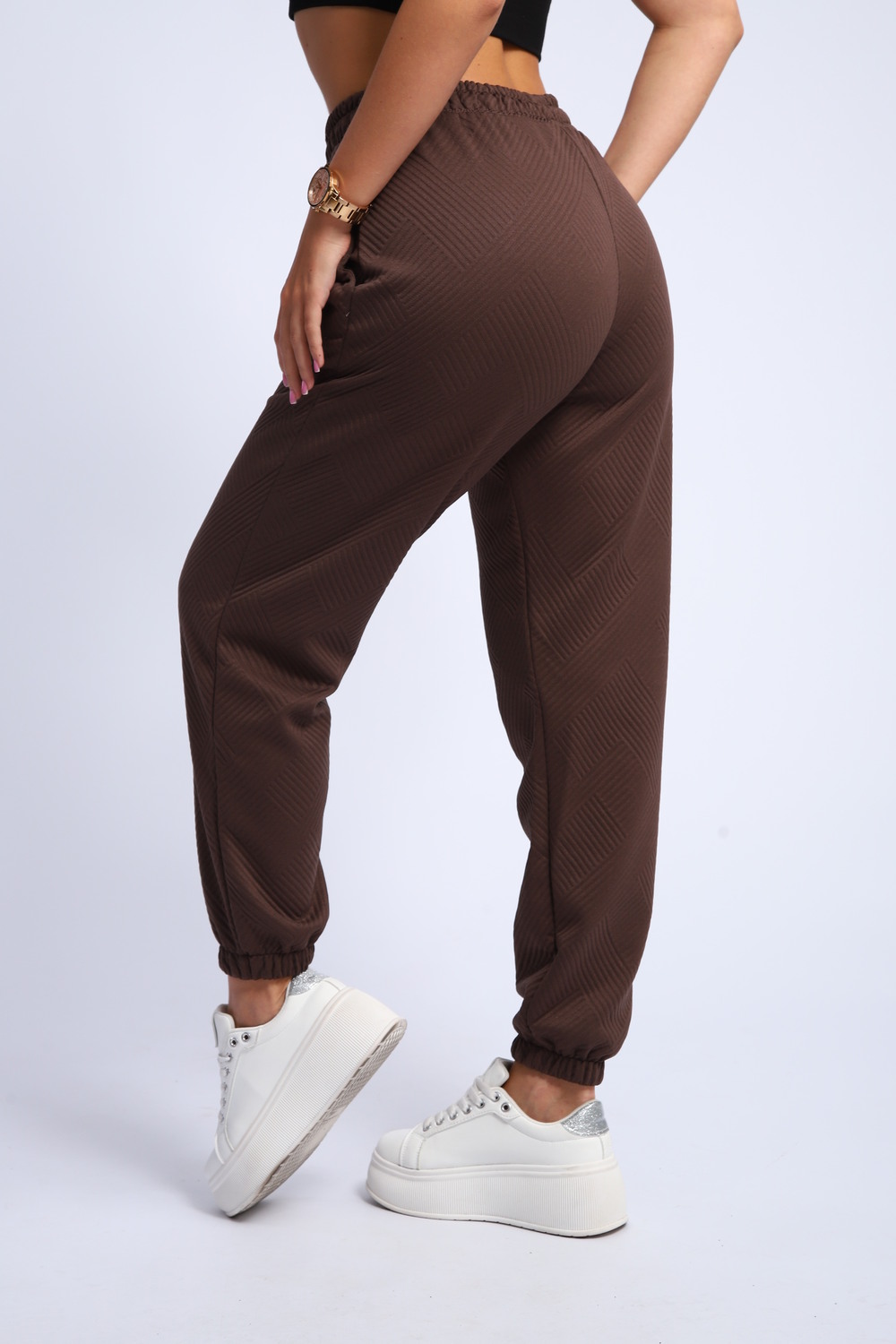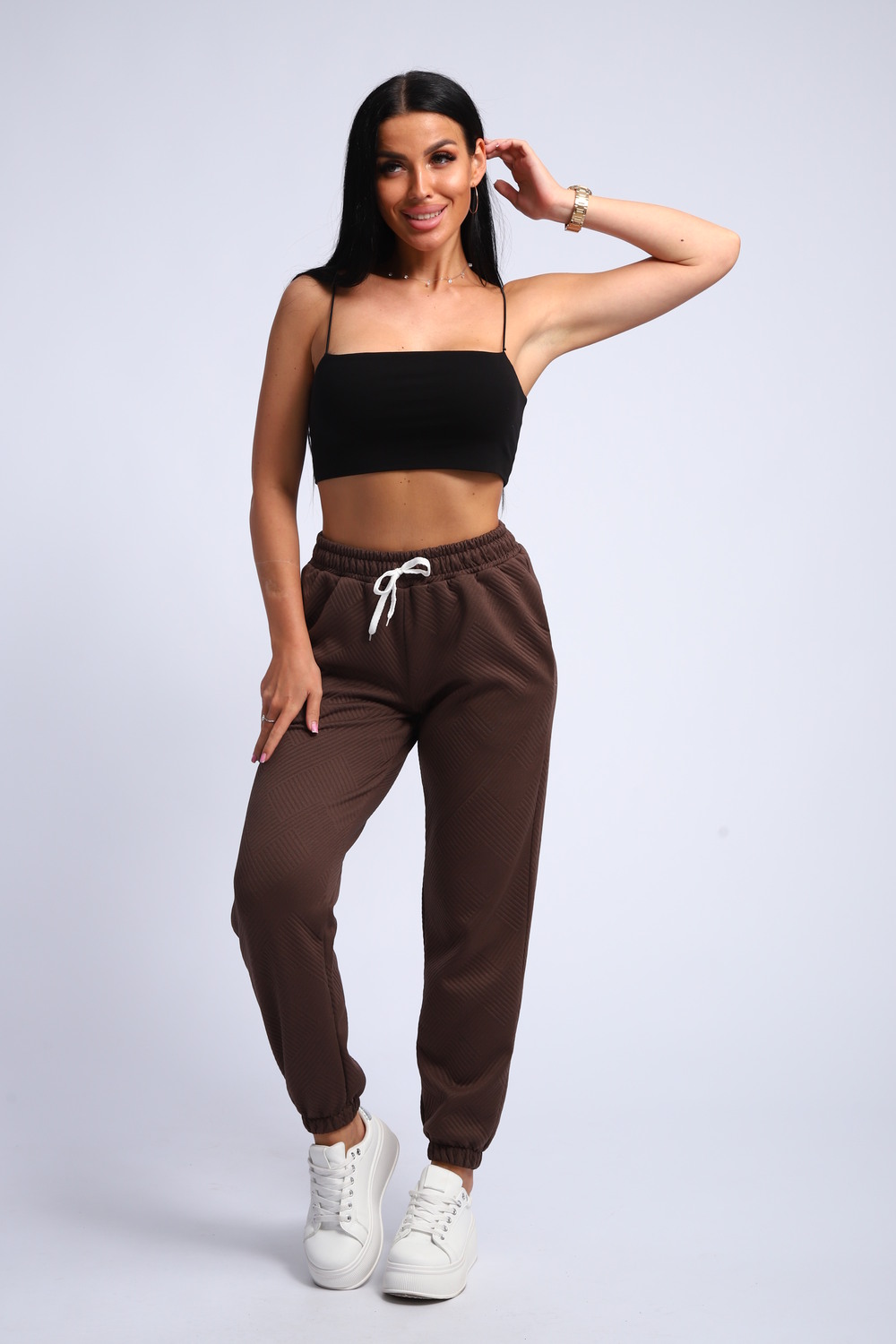 Ищете идеальные женские спортивные брюки, сочетающие удобство и актуальный дизайн? Наши брюки спортивного стиля с резинкой внизу и на поясе – это то, что вам нужно! Эти брюки – прекрасный выбор для занятий спортом, прогулок или создания расслабленного повседневного образа.