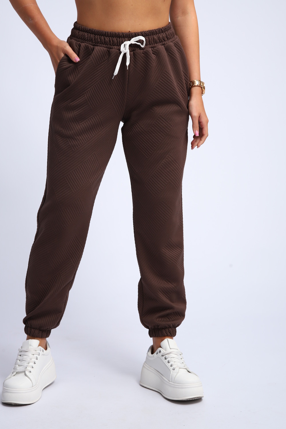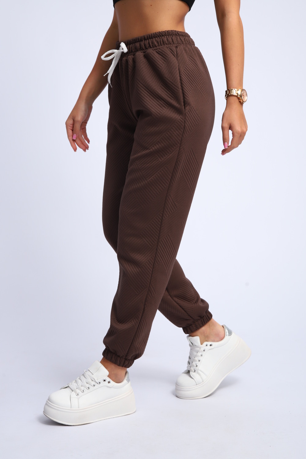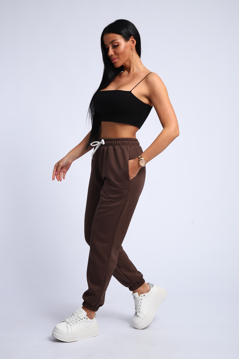 Ищете идеальные женские спортивные брюки, сочетающие удобство и актуальный дизайн? Наши брюки спортивного стиля с резинкой внизу и на поясе – это то, что вам нужно! Эти брюки – прекрасный выбор для занятий спортом, прогулок или создания расслабленного повседневного образа.