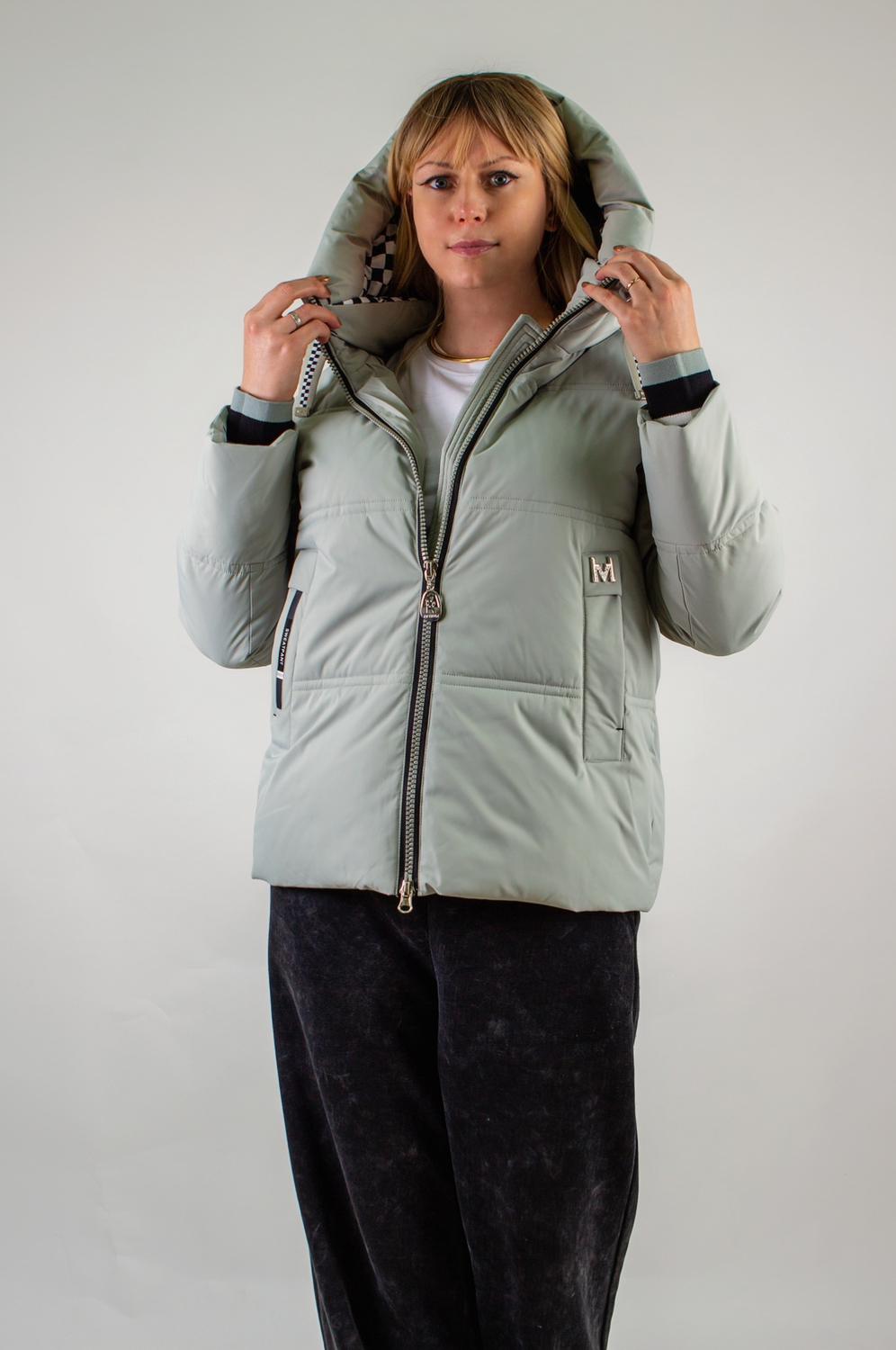Капюшон и манжеты отделаны контрастной черно-белой шахматной тканью, которая служит не только стильным акцентом, но и надежной защитой от ветра. Затягивающиеся шнурки на капюшоне и стойке-воротнике позволят плотно зафиксировать тепло в области шеи и головы.