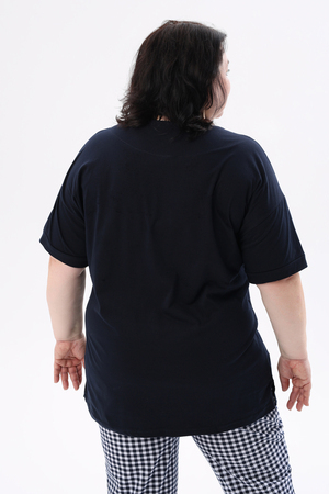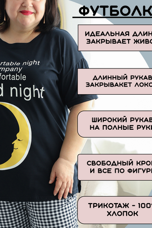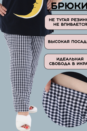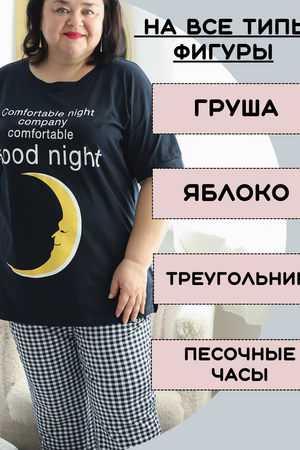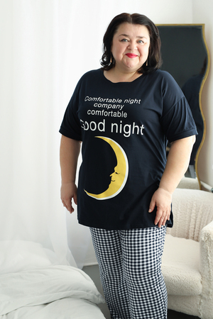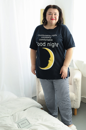 Пижама больших размеров выполнена в стильном тёмно-синем цвете с милым принтом «Good night» и клетчатыми брюками. Она одинаково удобна для сна, отдыха дома или даже для уютных домашних вечеров с близкими.