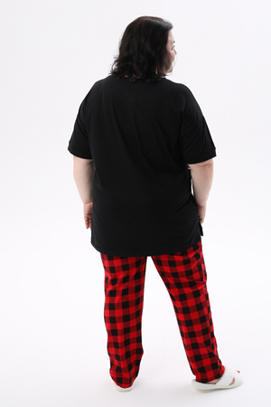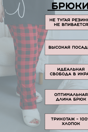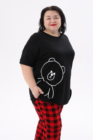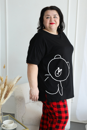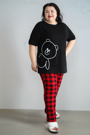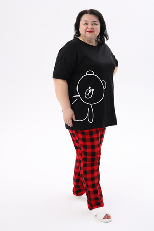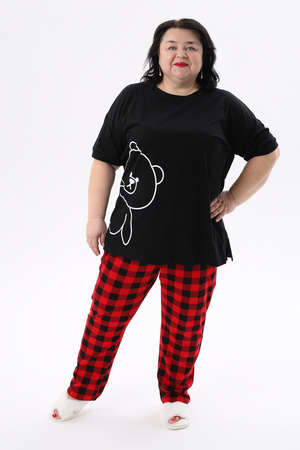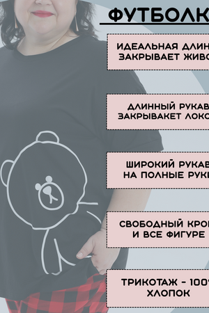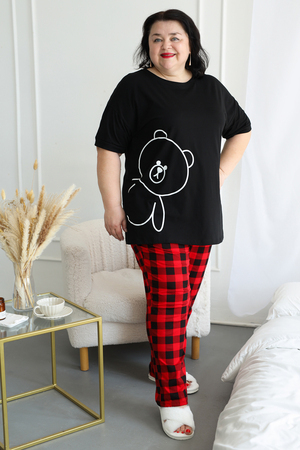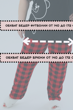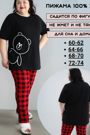Представляем вам уютный и стильный домашний комплект от ВРазмере, созданный специально для комфортного отдыха. Пижама женская больших размеров порадует вас своей практичностью и привлекательным дизайном.  Удлиненная футболка с милым принтом мишки и короткими рукавами  создана для максимального комфорта, а свободные брюки в красную клетку на удобной резинке обеспечат свободу движений.  Этот комплект станет идеальным выбором для женщин, ценящих уют и комфорт.  Натуральный трикотаж из 100% хлопка приятен к телу и позволяет коже дышать, что особенно важно для чувствительной кожи.  Пижама подходит для повседневного ношения дома, а также станет отличным подарком для любимых женщин.  Благодаря универсальному дизайну, пижама подойдет как для высоких, так и для невысоких женщин.  Стирка при температуре не более 40°C сохранит яркость красок и мягкость ткани.  Побалуйте себя комфортом и стилем с пижамой DomTex!