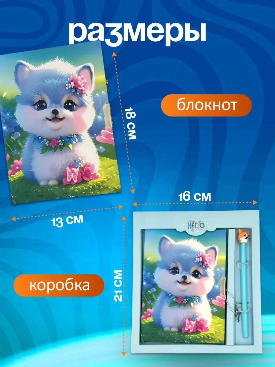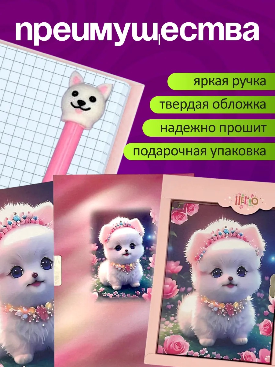 Блокнот подарочный с ручкой и замочком+2 ключика - отличный подарок ребенку. Блокнот с замком надежно сохранит секретики подростка. Записная книжка с ручкой в коробке - идеален для девочки. Блокнот с ручкой в коробке закрывается ключом, его удобно хранить в сумке или в шкафу. Блокнот с милой собачкой в толстой обложке прослужит долго. Яркий и привлекательный маленький блокнот для мальчиков и девочек мотивирует детей к учебе и творчеству. Компактный размер записной книжки позволяет носить в рюкзаке и в дорогу.