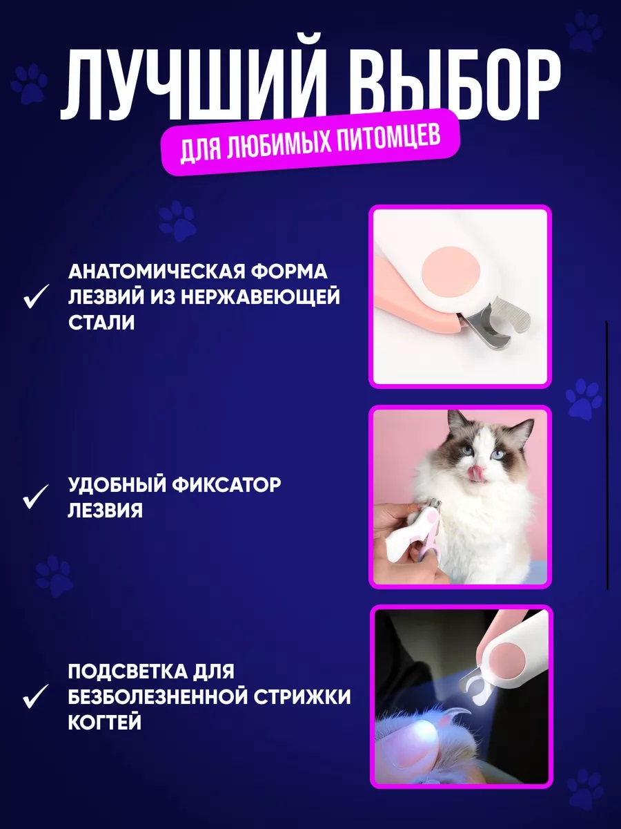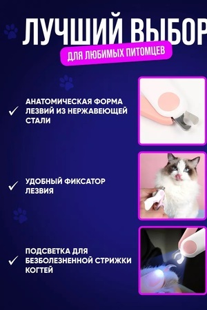 Когтерез для кошек и собак любых пород. Не расслаивает когти. Встроенная LED-подсветка позволяет безопасного стричь когти, в отличие от других когтерезов. Удобные ножницы для кошек и собак и прочих инструментов для груминга животных, а также царапки для кошек. Причины почему это последний когтерез, который вы купите: Острые лезвия изготовлены из нержавеющей стали и не тупятся спустя годы. Подсветка когтереза позволяет точно увидеть место среза и не повредить коготь питомца. Ножницы для когтей занимают мало места. Груминг и уход без боли. Без стресса. Ваша кошка и собака будут довольны этой игрушке.