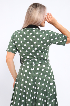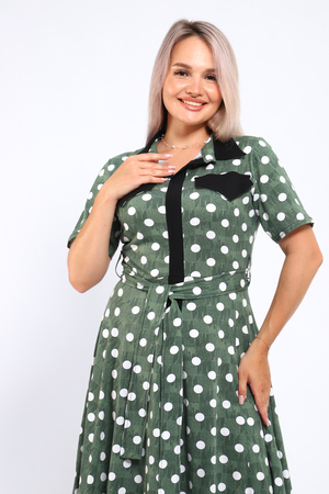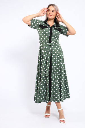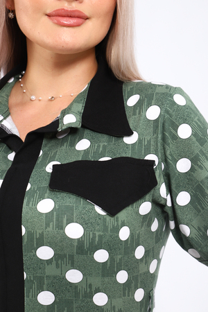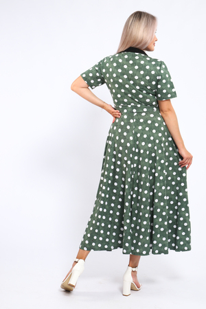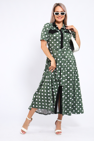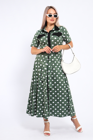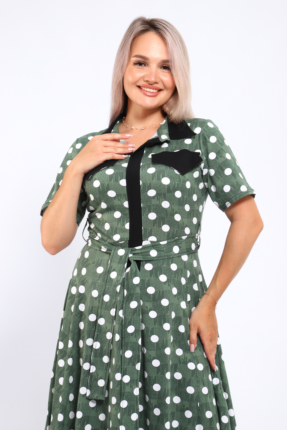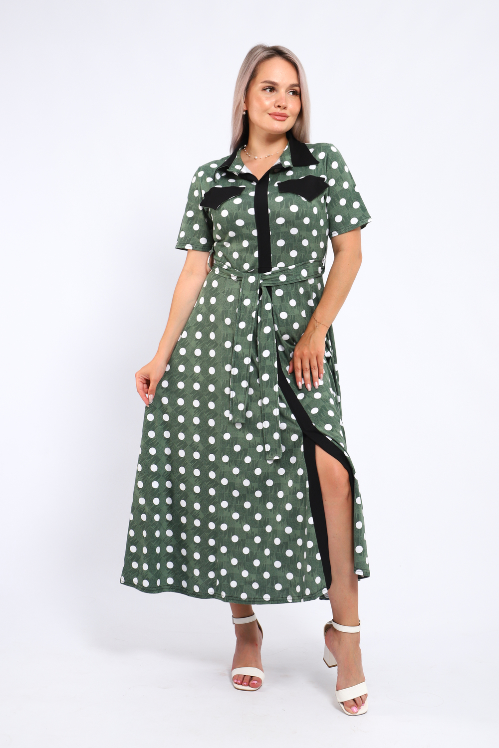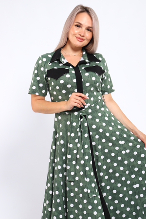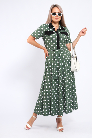 Платье, которое сочетает в себе комфорт и уникальный дизайн. Модель выполнена из мягкого материала, что делает её идеальной для повседневной носки. Свободный крой с расклешённой юбкой и акцент на талии с помощью пояса создают воздушный и женственный силуэт. Контрастное сочетание жёлтого и чёрного в гороховом принте — смелое и при этом очень гармоничное решение. Это платье — отличный выбор для прогулок, встреч с друзьями или офиса. Носите его с босоножками на каблуке для создания изысканного образа или с кедами для более расслабленного стиля.