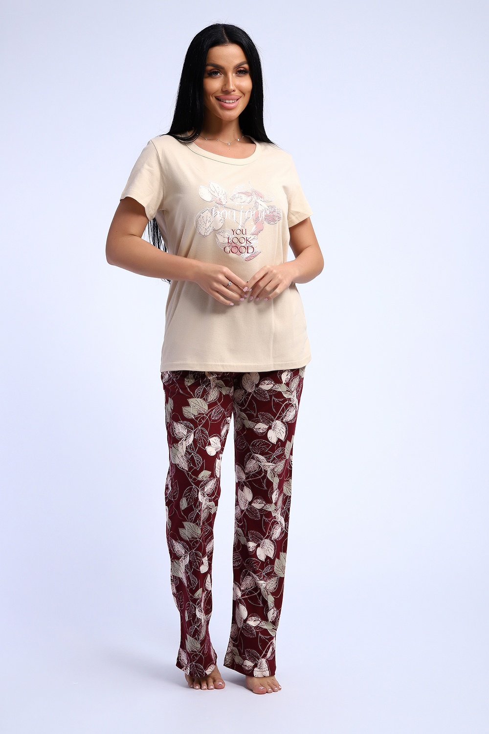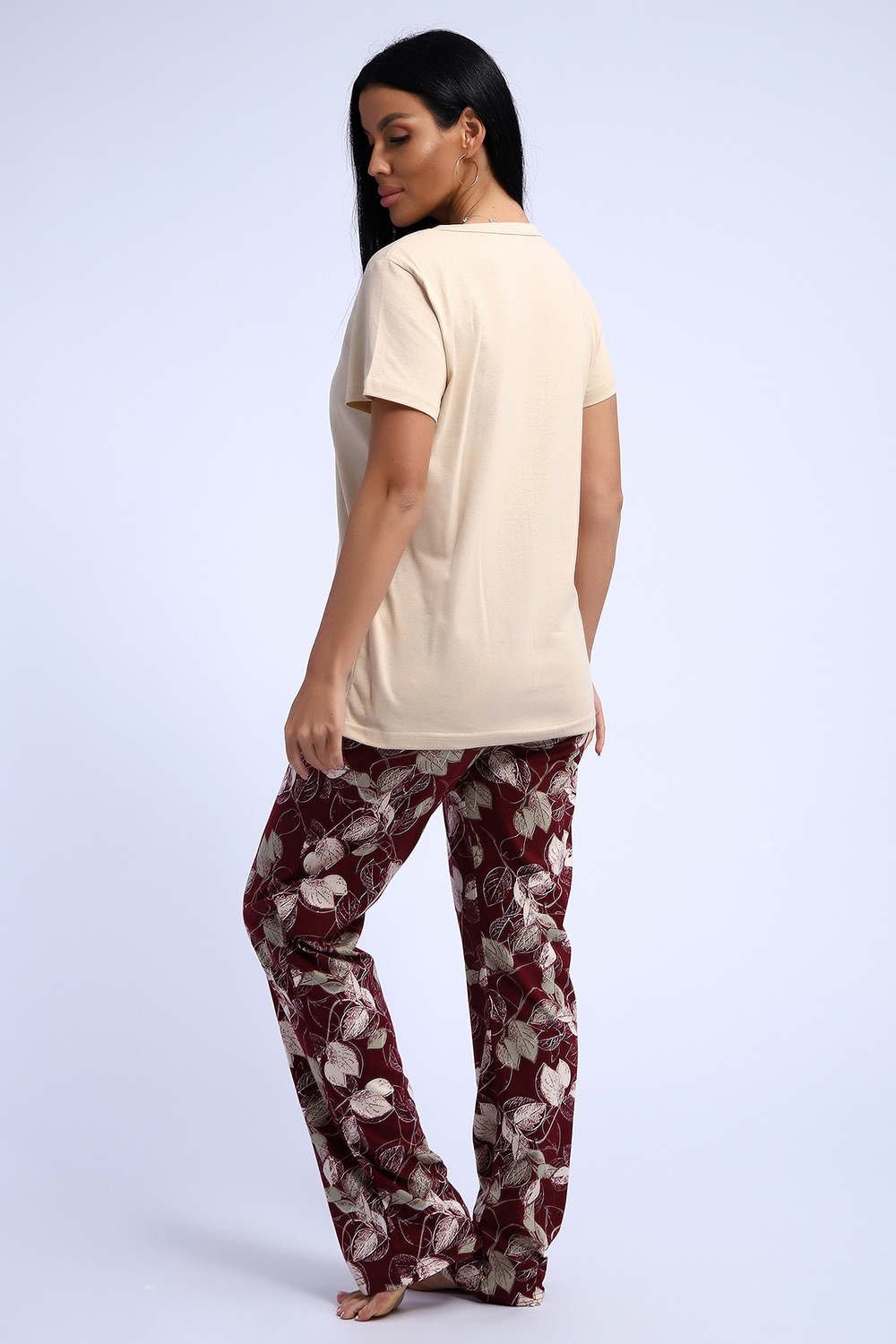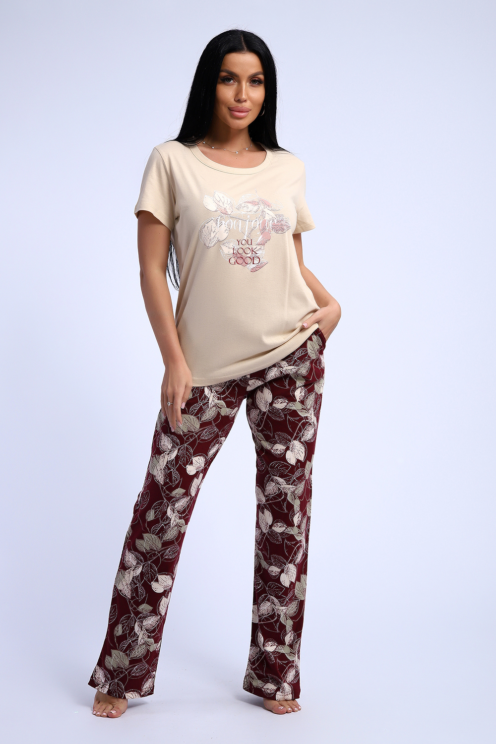 Комплект трикотажный футболка и брюки из натурального хлопка высокого качества. Размерный ряд с 48 до 66 размера. Футболка нежно-песочного цвета, брюки бордово-винного цвета с растительным рисунком, есть боковые карманы.
