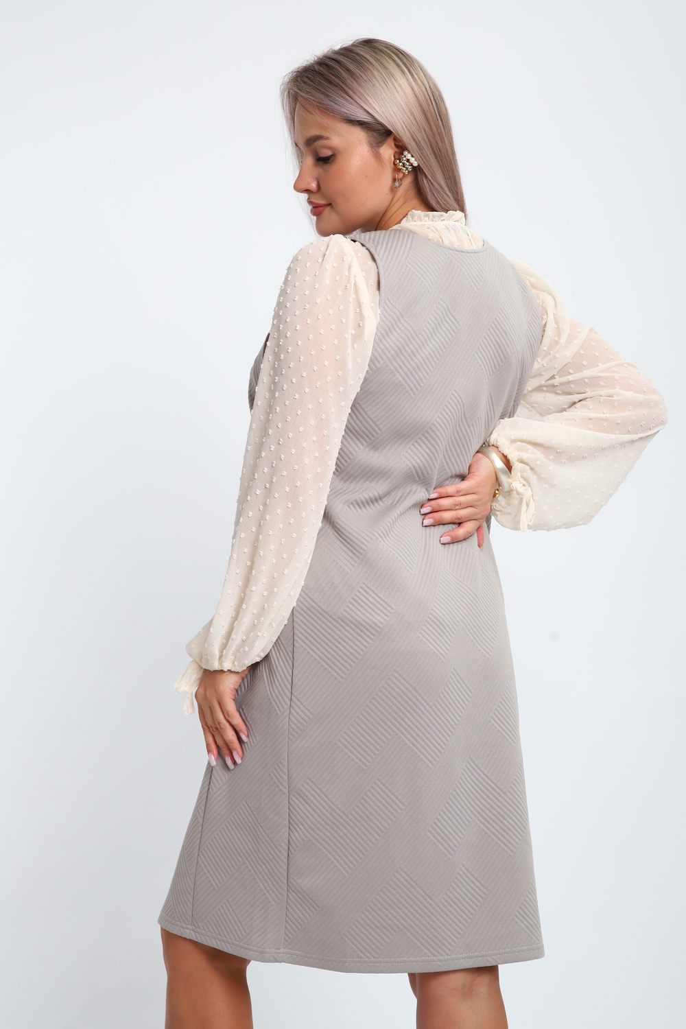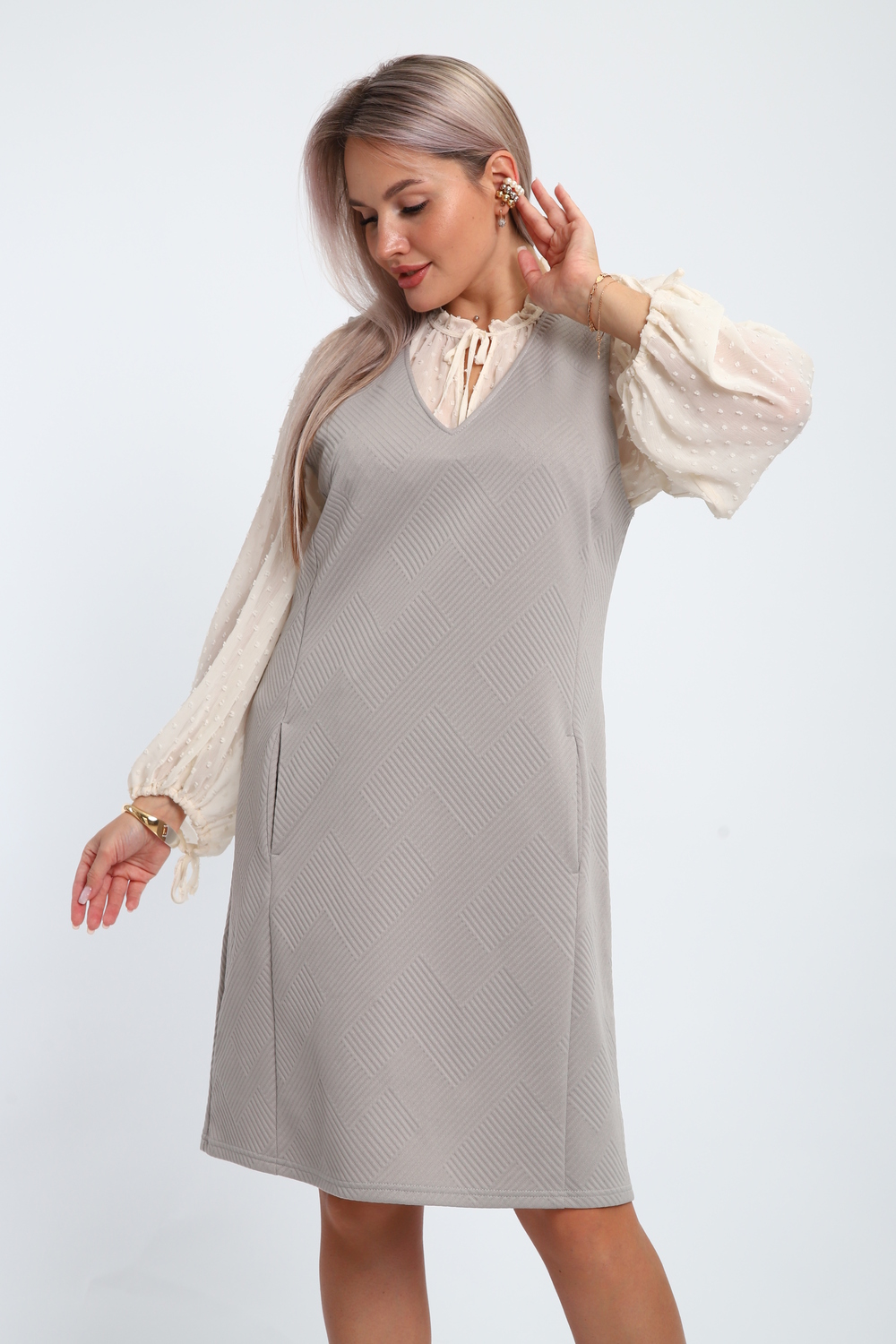Создайте свой неповторимый образ с помощью универсального сарафана, к которому можно подобрать разнообразные блузки, водолазки, свитшоты. Сарафан прямого кроя, слегка притален, благодаря отрезному бочку, аккуратная V-образная горловина обработана обтачкой, в швах притачивания бочков имеются внутренние карманы. Пройма достаточно глубокая, чтобы не стеснять рукав блузки, длина до середины колена.  Лаконичность деталей кроя подчеркивает стиль и элегантность изделия. Свободный крой сарафана и воздухопроницаемость ткани обеспечивают комфорт и свободу движения, что делает его идеальным для повседневного ношения. Модная геометрическая рельефная фактура ткани придает изделию стильный и современный образ. Базовые расцветки сарафана помогут с легкостью подобрать к нему пару.  На работе, в офисе, на прогулке, на празднике вы будете чувствовать себя комфортно и уверенно.