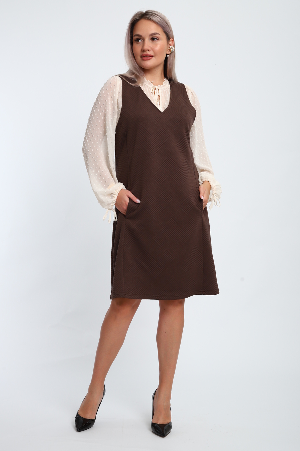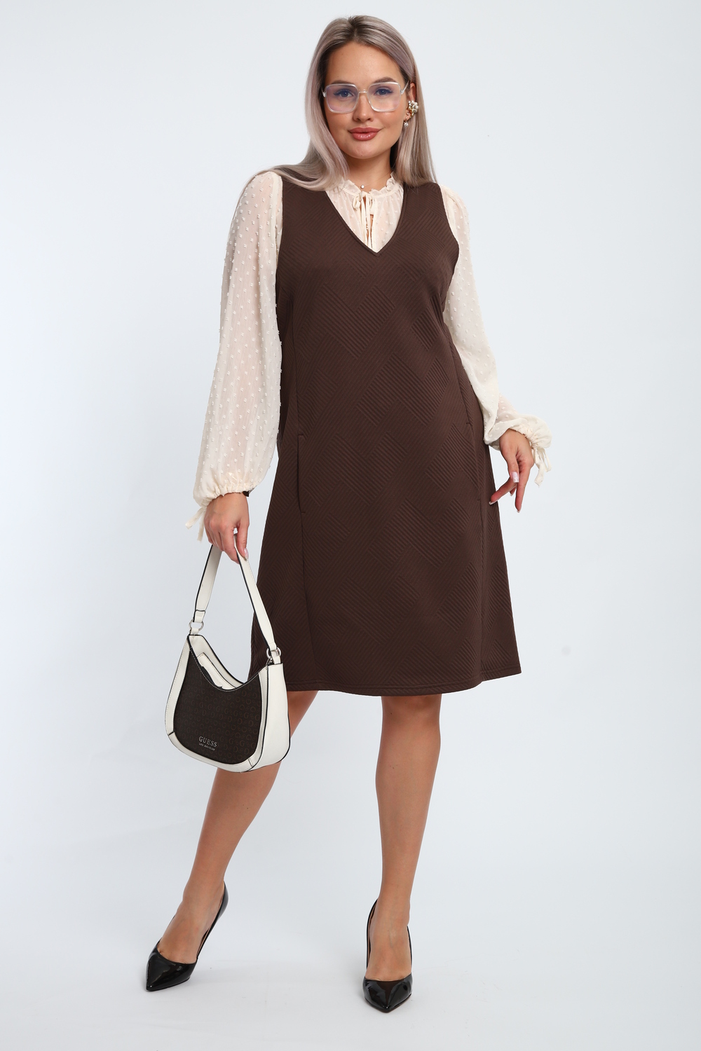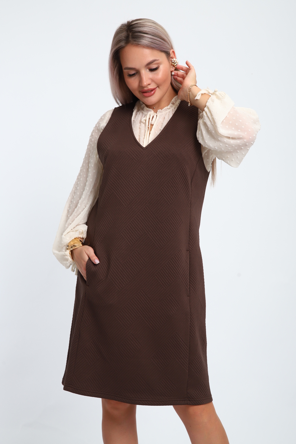 Создайте свой неповторимый образ с помощью универсального сарафана, к которому можно подобрать разнообразные блузки, водолазки, свитшоты. Сарафан прямого кроя, слегка притален, благодаря отрезному бочку, аккуратная V-образная горловина обработана обтачкой, в швах притачивания бочков имеются внутренние карманы. Пройма достаточно глубокая, чтобы не стеснять рукав блузки, длина до середины колена.  Лаконичность деталей кроя подчеркивает стиль и элегантность изделия. Свободный крой сарафана и воздухопроницаемость ткани обеспечивают комфорт и свободу движения, что делает его идеальным для повседневного ношения. Модная геометрическая рельефная фактура ткани придает изделию стильный и современный образ. Базовые расцветки сарафана помогут с легкостью подобрать к нему пару.  На работе, в офисе, на прогулке, на празднике вы будете чувствовать себя комфортно и уверенно.