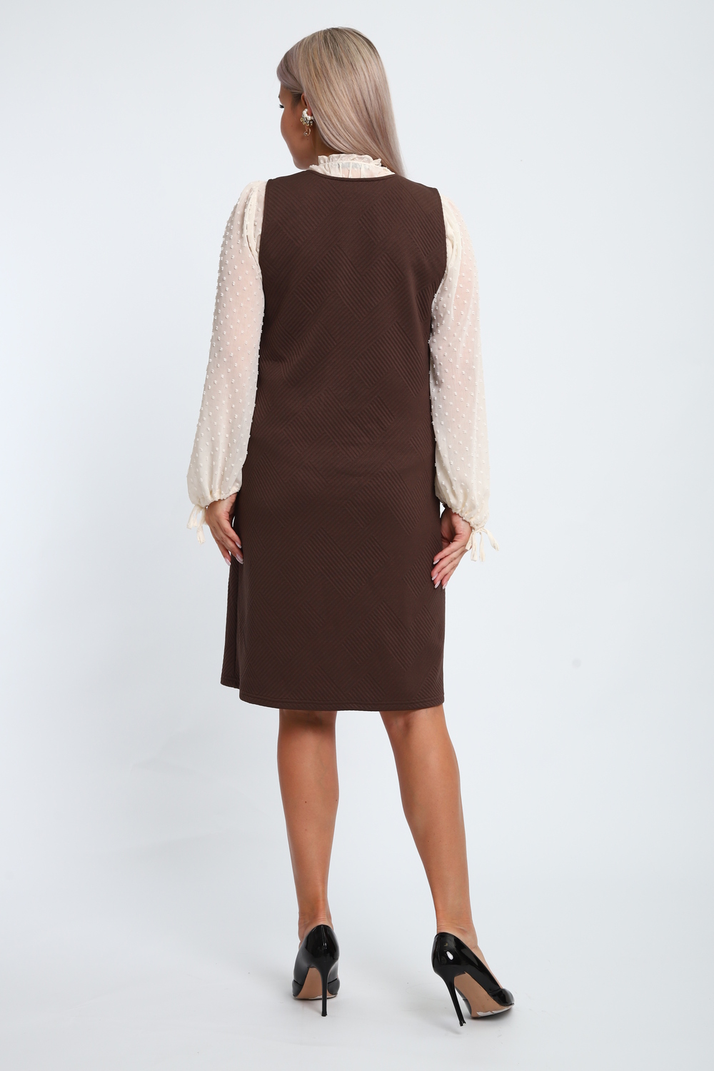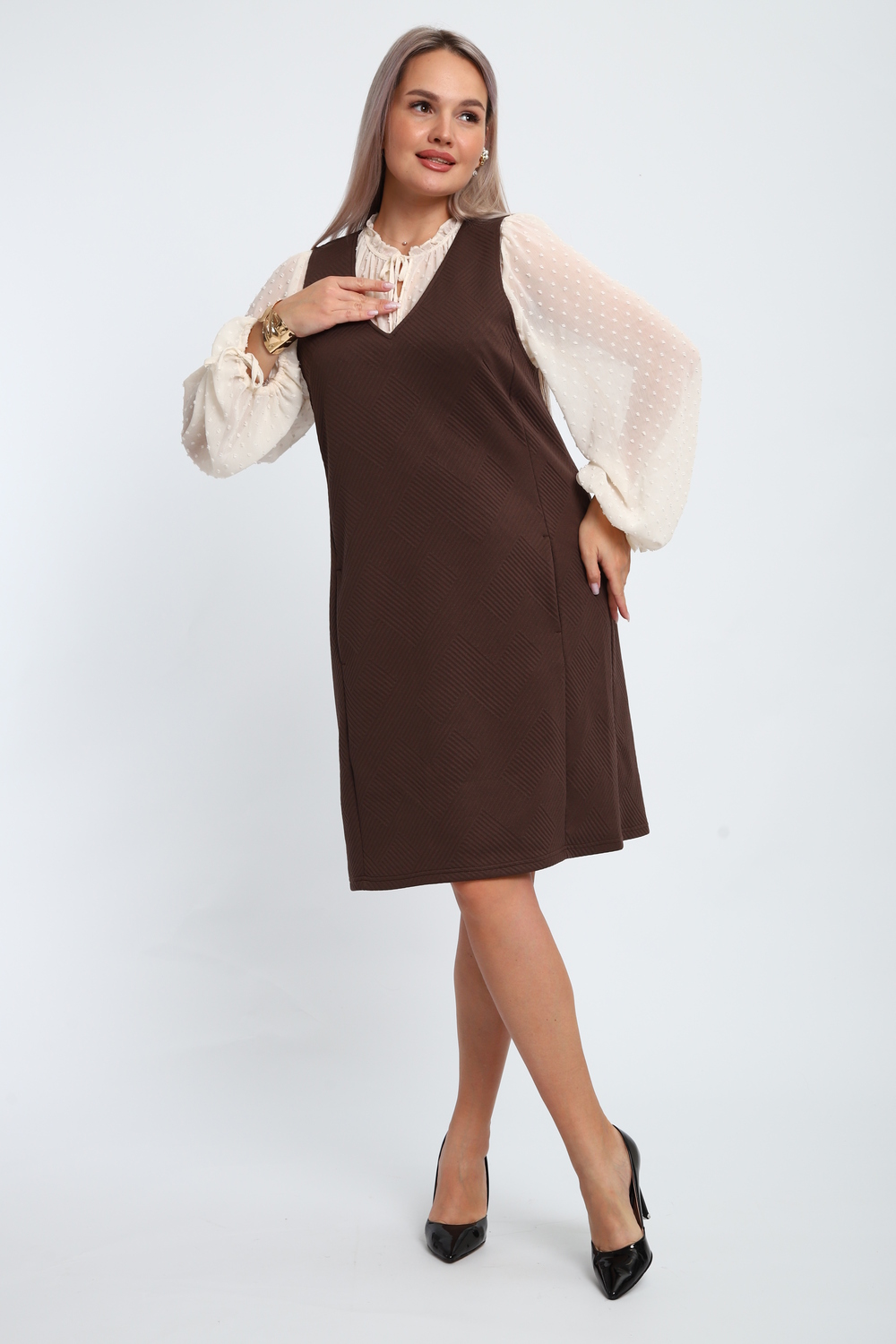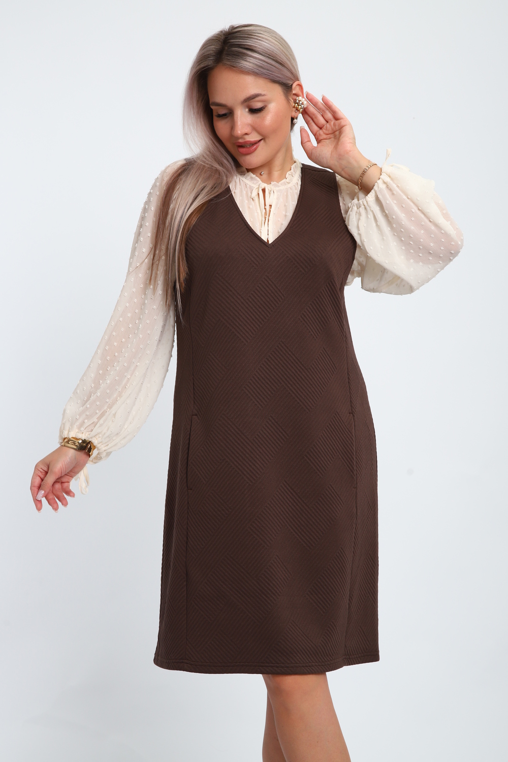 Создайте свой неповторимый образ с помощью универсального сарафана, к которому можно подобрать разнообразные блузки, водолазки, свитшоты. Сарафан прямого кроя, слегка притален, благодаря отрезному бочку, аккуратная V-образная горловина обработана обтачкой, в швах притачивания бочков имеются внутренние карманы. Пройма достаточно глубокая, чтобы не стеснять рукав блузки, длина до середины колена.  Лаконичность деталей кроя подчеркивает стиль и элегантность изделия. Свободный крой сарафана и воздухопроницаемость ткани обеспечивают комфорт и свободу движения, что делает его идеальным для повседневного ношения. Модная геометрическая рельефная фактура ткани придает изделию стильный и современный образ. Базовые расцветки сарафана помогут с легкостью подобрать к нему пару.  На работе, в офисе, на прогулке, на празднике вы будете чувствовать себя комфортно и уверенно.