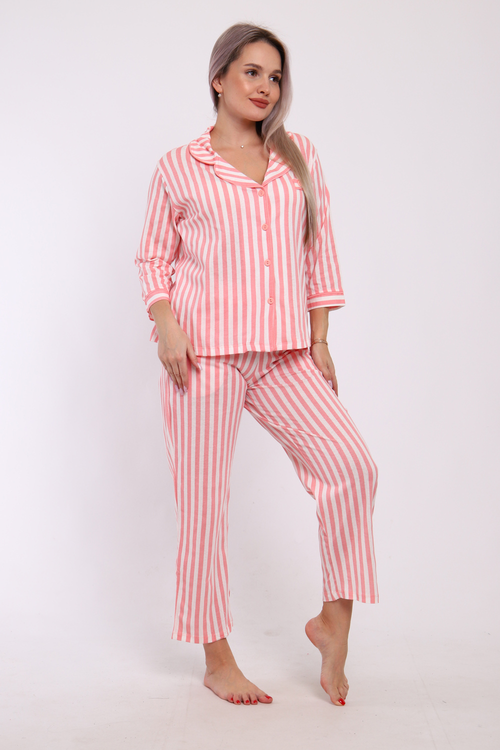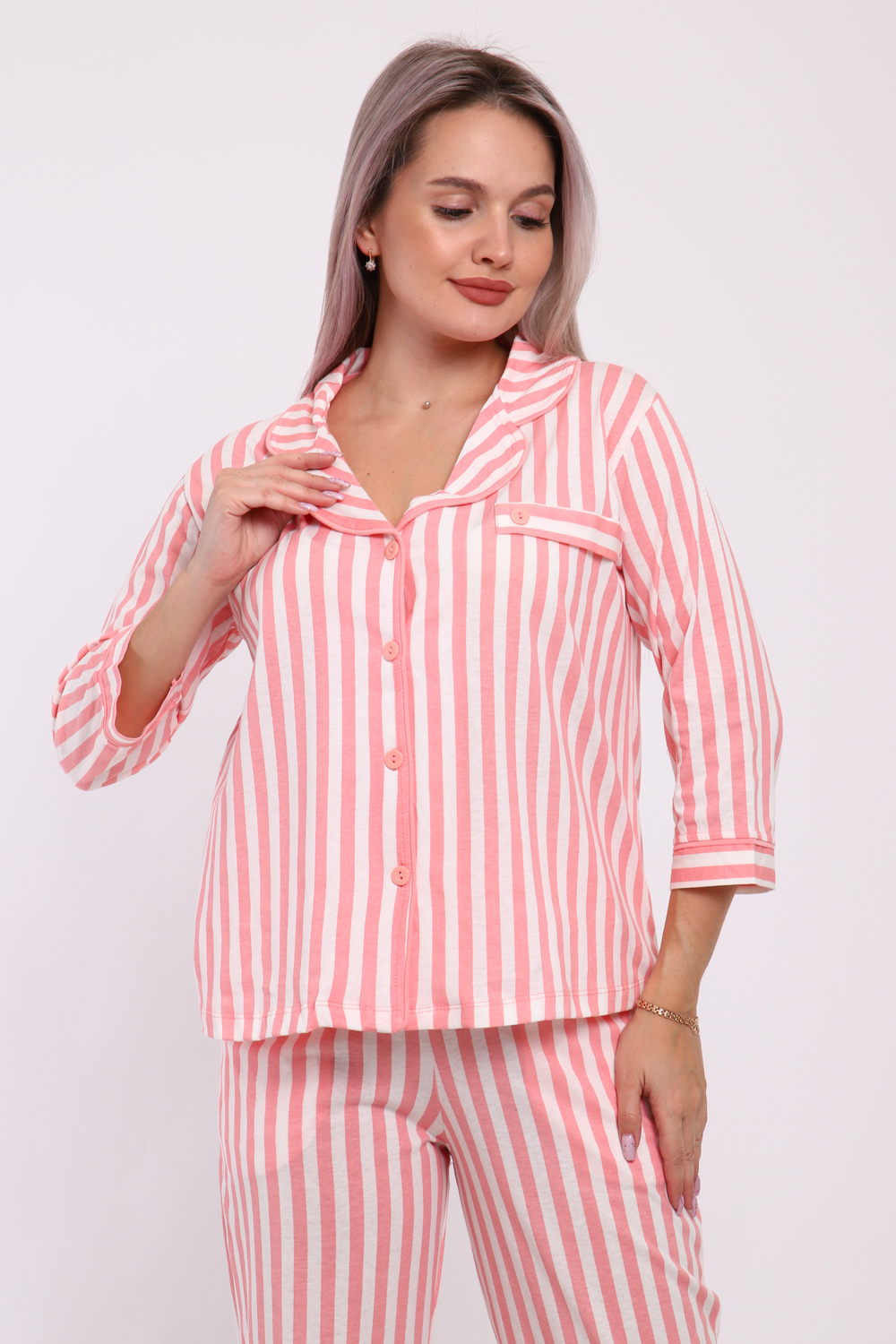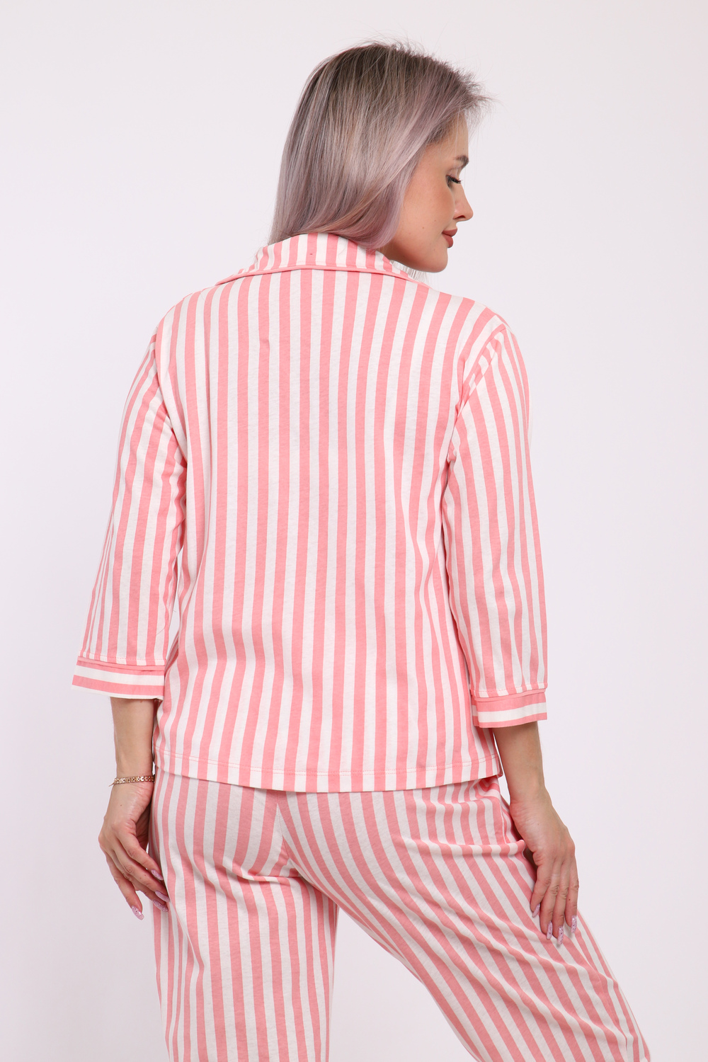 Пижама женская с брюками. Рубашка прямого, свободного кроя на пуговицах с имитацией кармана на груди. Воротник фигурный. Кроя полочки, рукав и воротник обработан внутренней окантовкой. Брюки с карманами, длина по щиколотку.