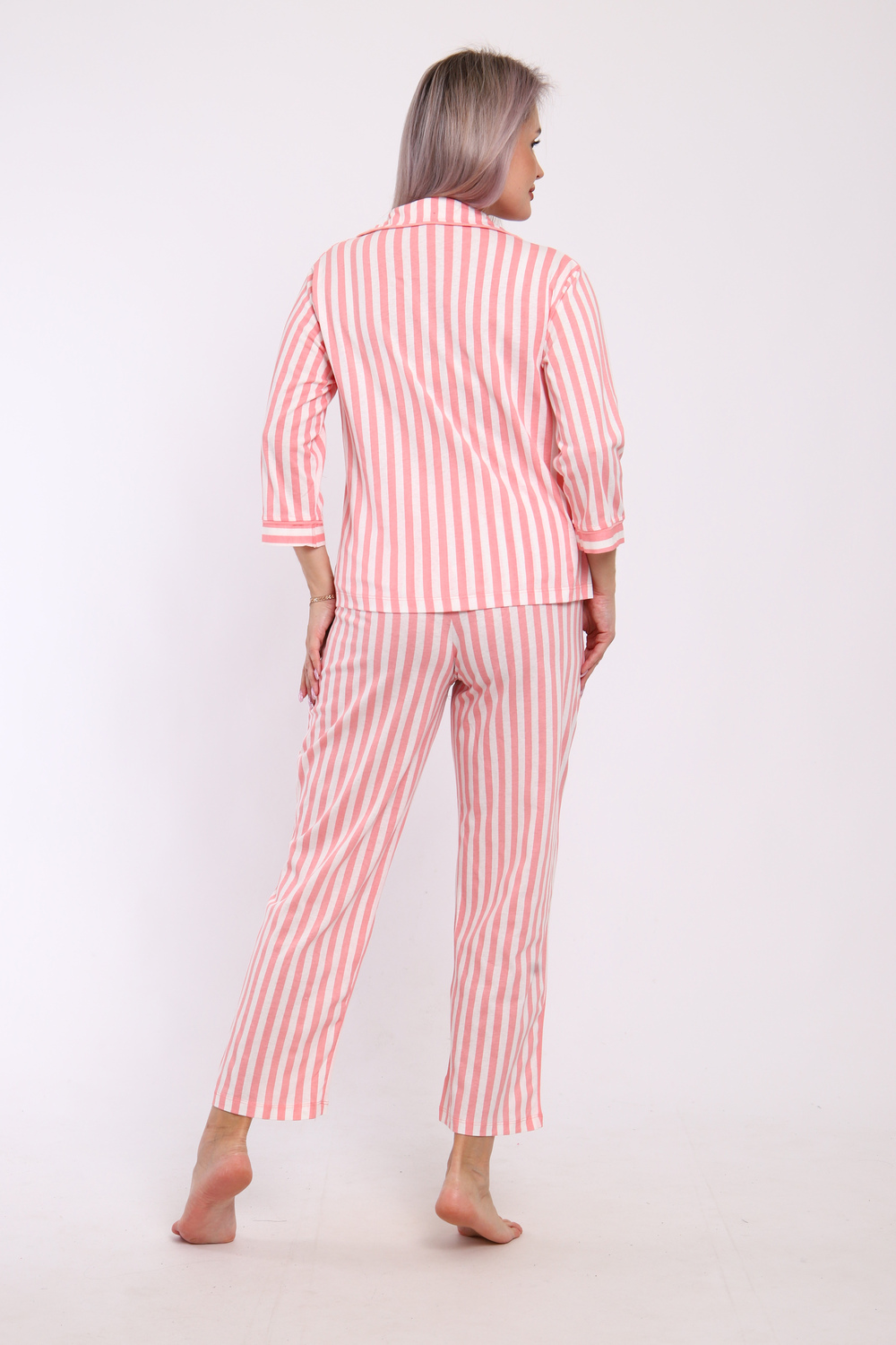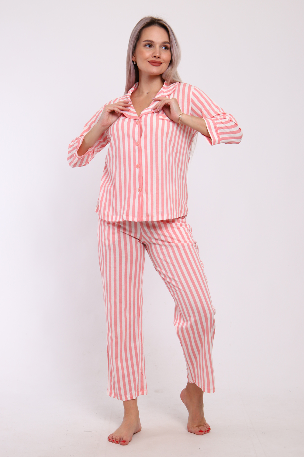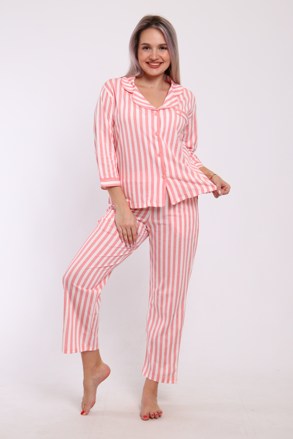 Пижама женская с брюками. Рубашка прямого, свободного кроя на пуговицах с имитацией кармана на груди. Воротник фигурный. Кроя полочки, рукав и воротник обработан внутренней окантовкой. Брюки с карманами, длина по щиколотку.