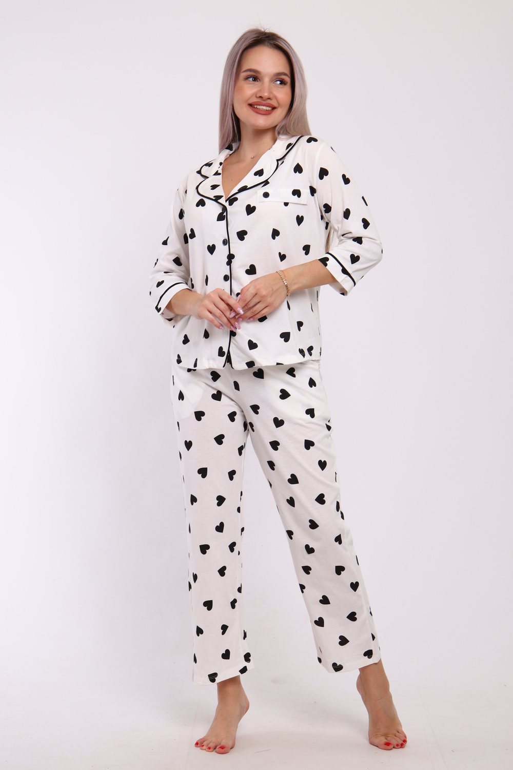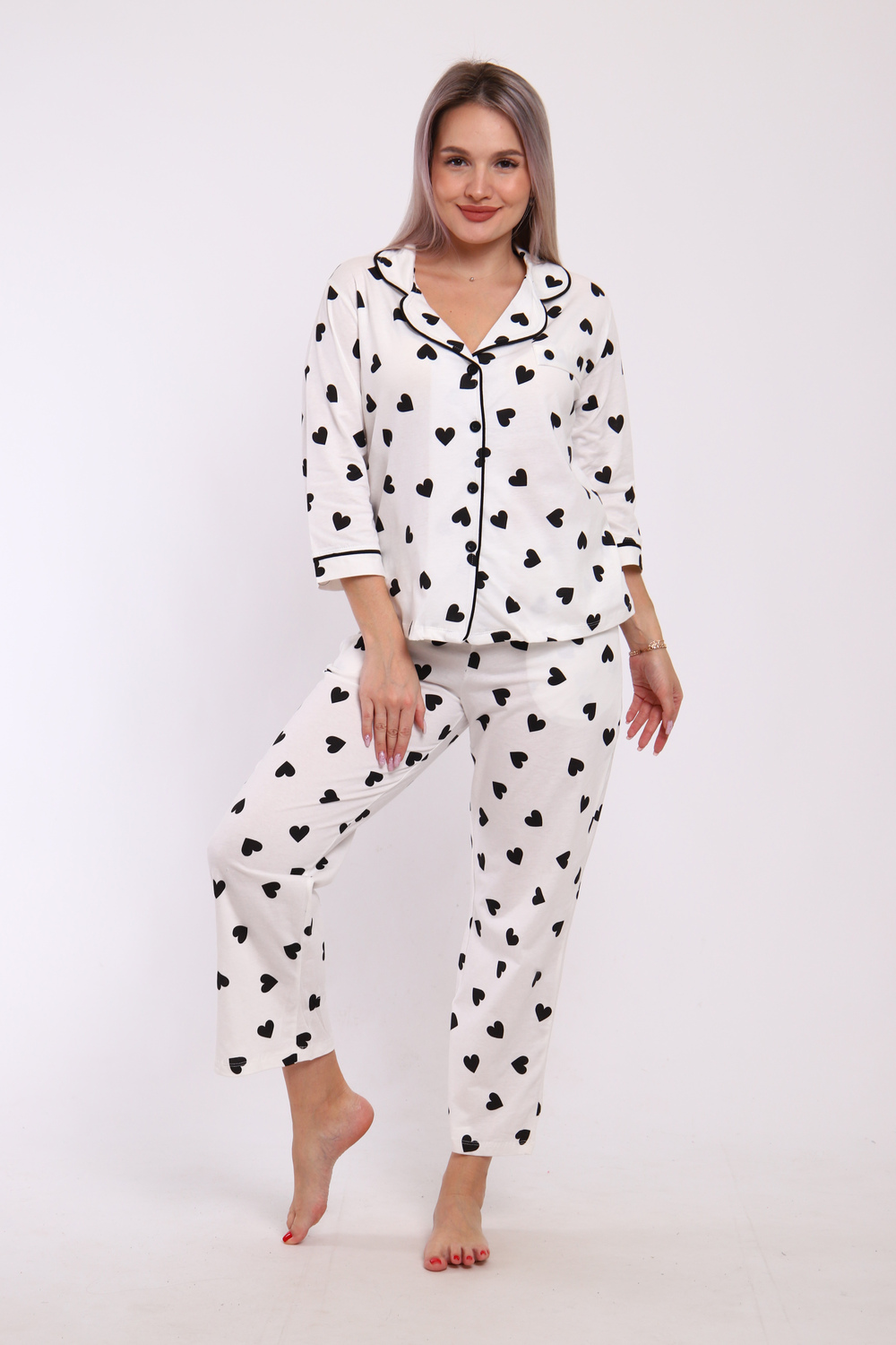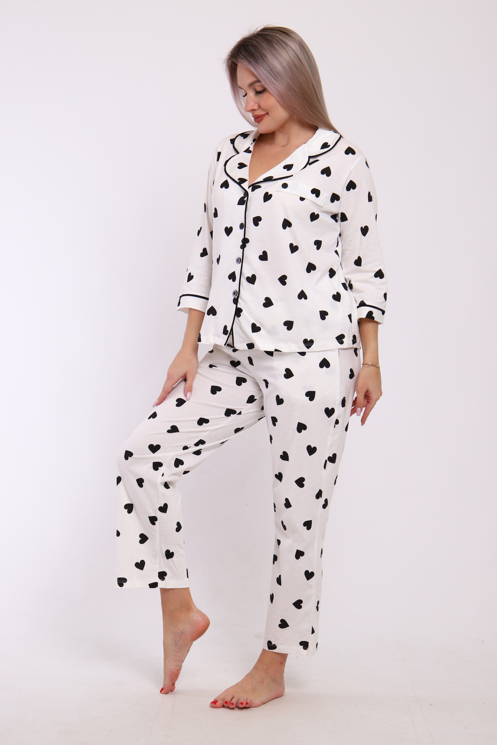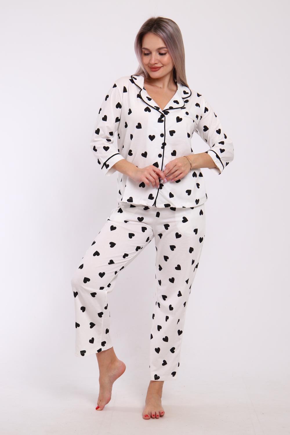 Пижама женская с брюками. Рубашка прямого, свободного кроя на пуговицах с имитацией кармана на груди. Воротник фигурный. Кроя полочки, рукав и воротник обработан внутренней окантовкой. Брюки с карманами, длина по щиколотку.