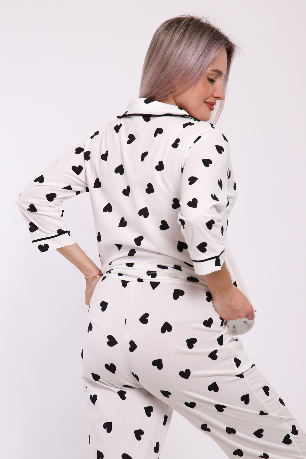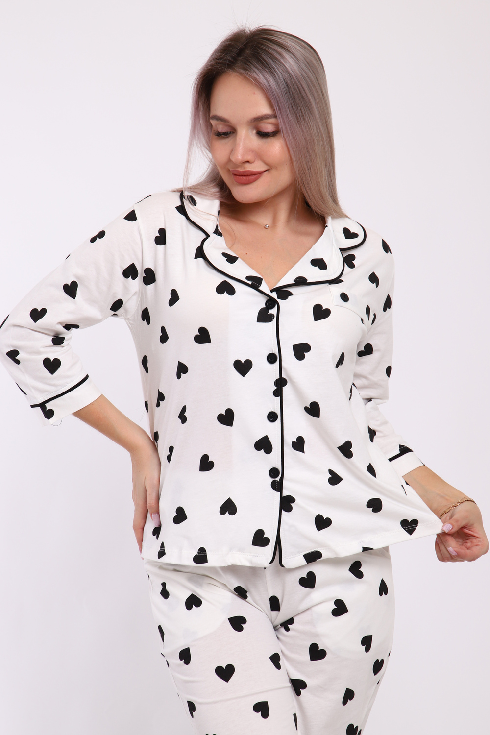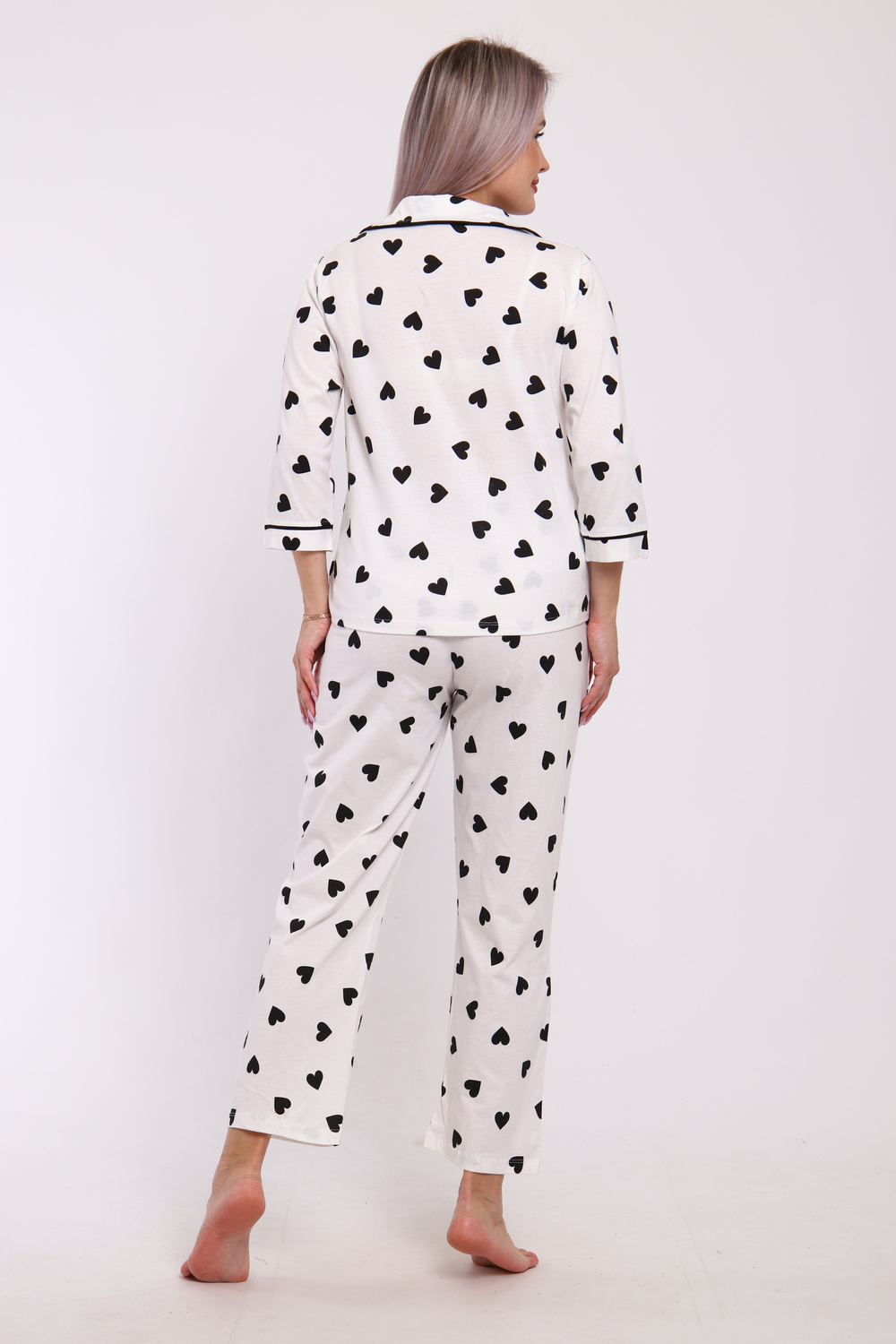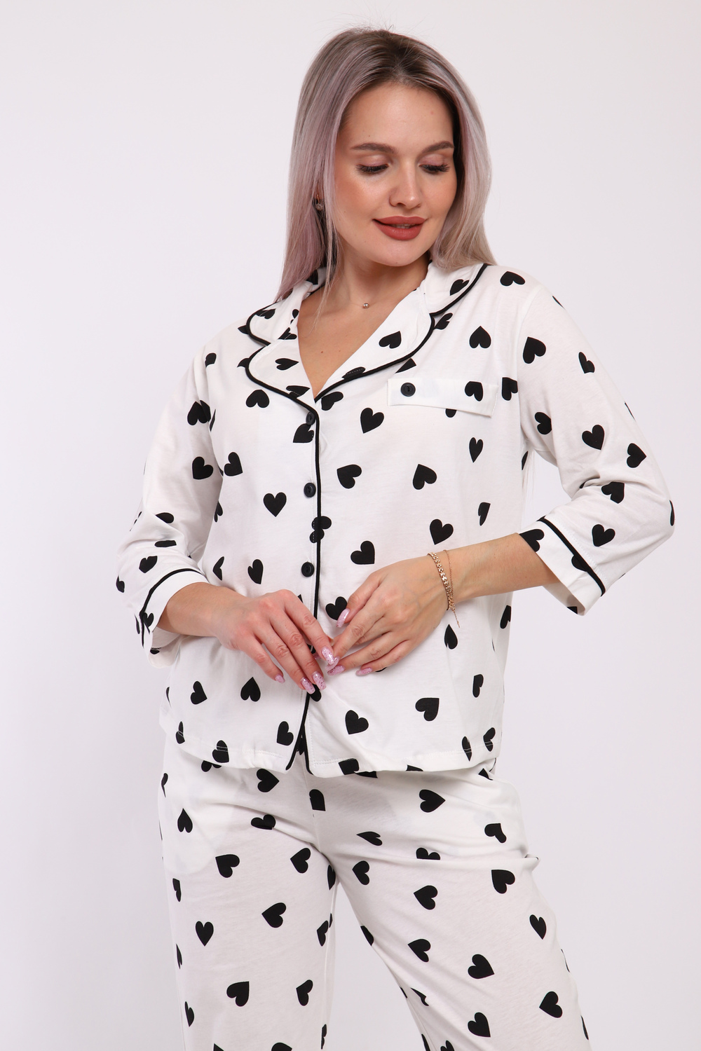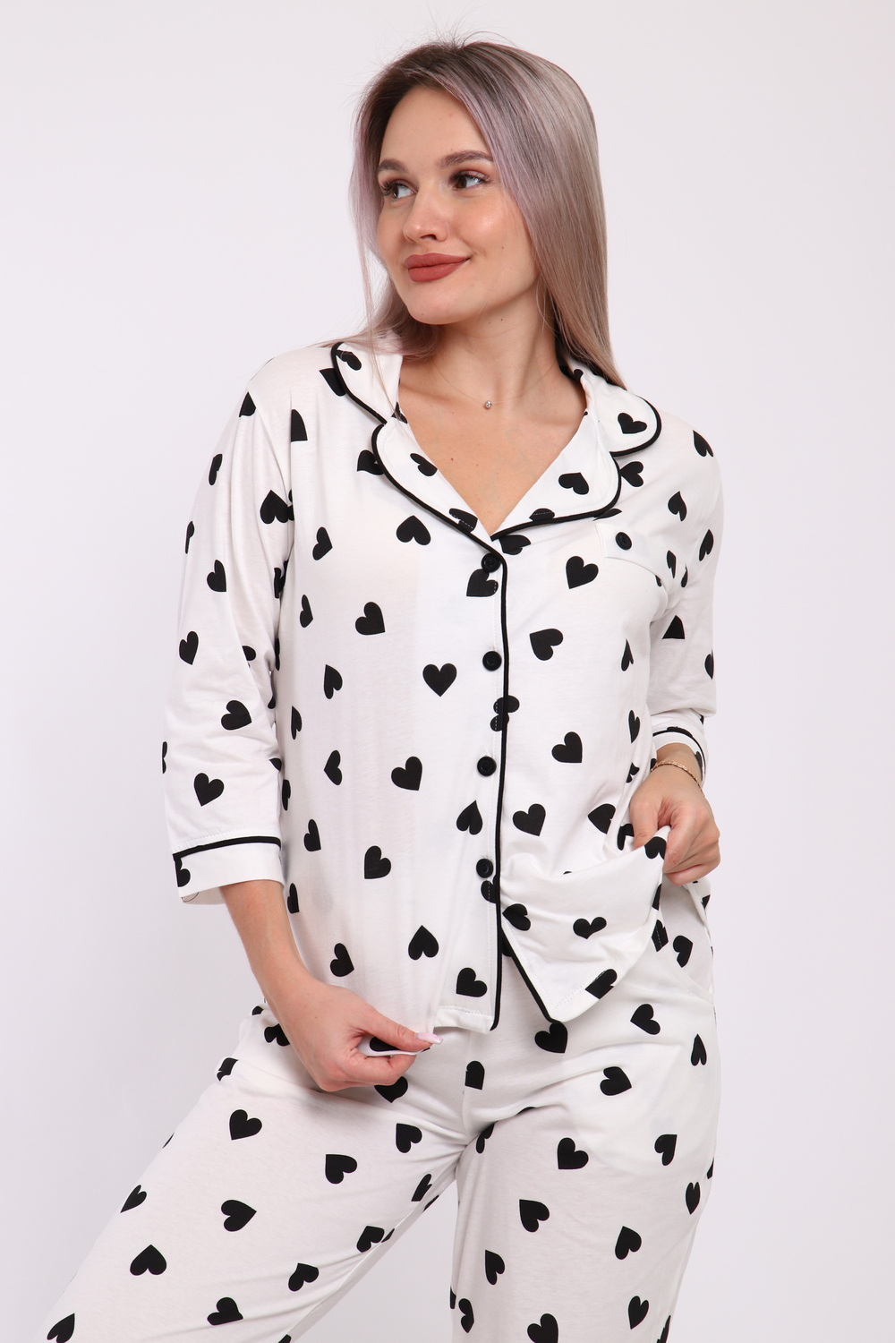 Пижама женская с брюками. Рубашка прямого, свободного кроя на пуговицах с имитацией кармана на груди. Воротник фигурный. Кроя полочки, рукав и воротник обработан внутренней окантовкой. Брюки с карманами, длина по щиколотку.