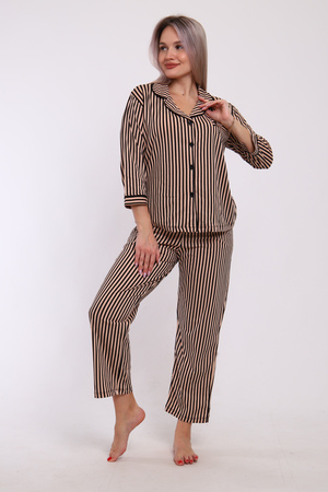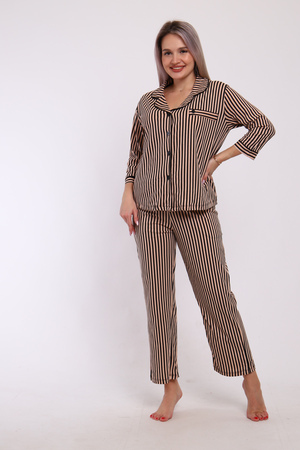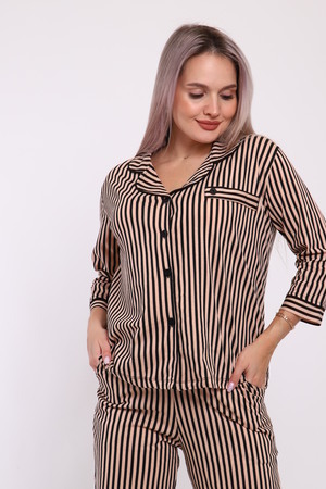 Пижама женская с брюками. Рубашка прямого, свободного кроя на пуговицах с имитацией кармана на груди. Воротник фигурный. Кроя полочки, рукав и воротник обработан внутренней окантовкой. Брюки с карманами, длина по щиколотку.
