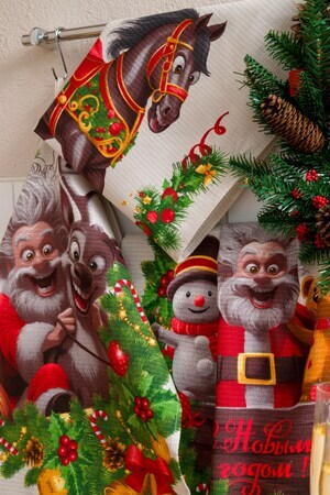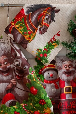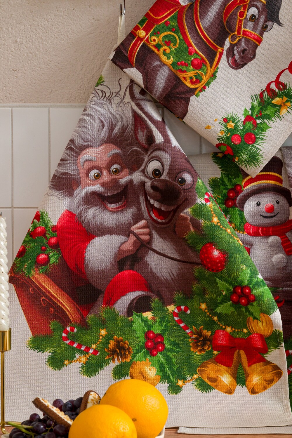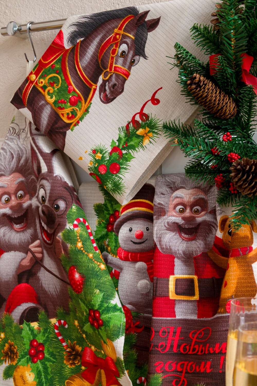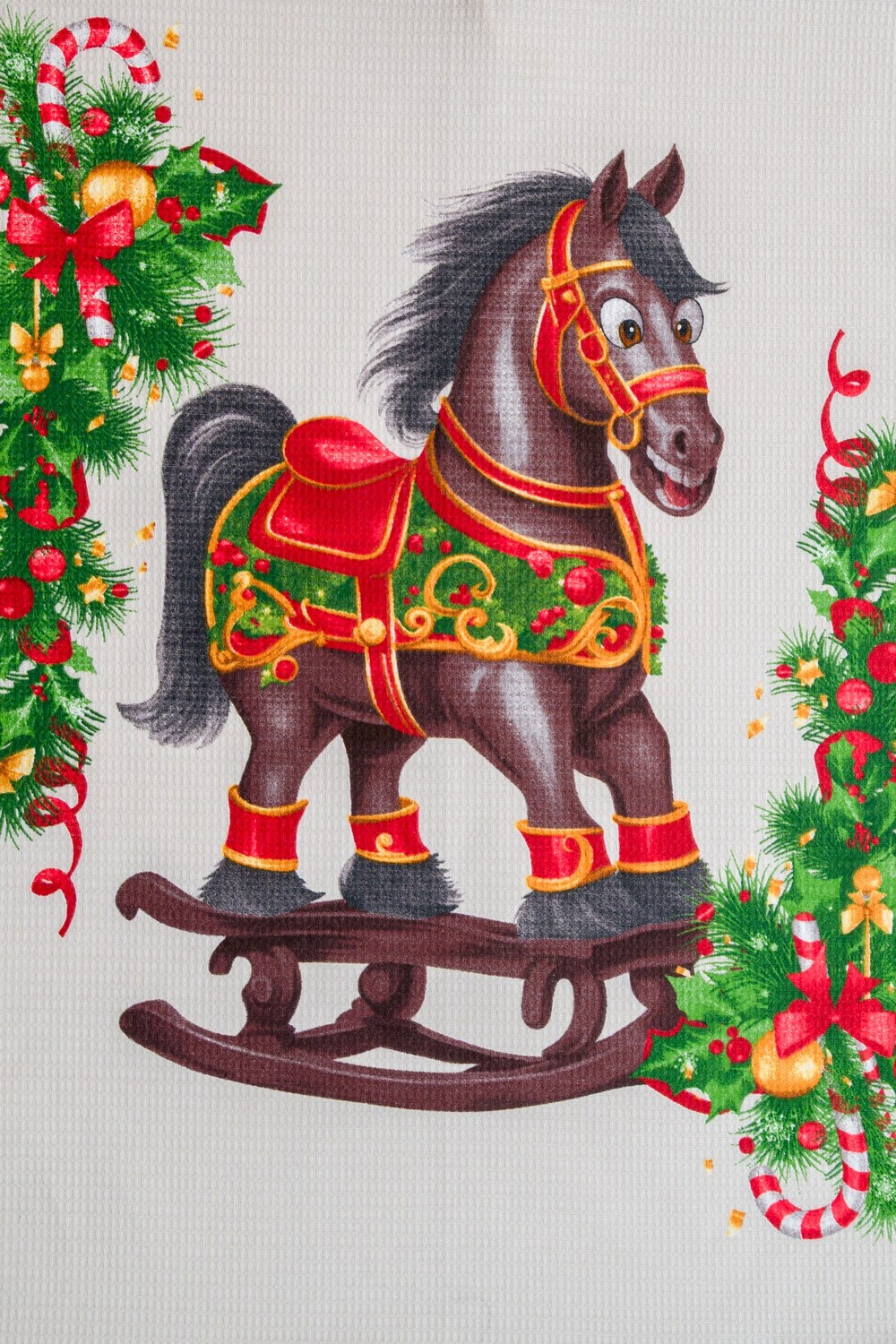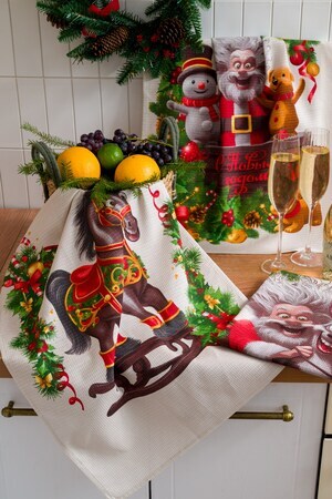Нежный бежевый цвет полотенец идеально впишется в любой интерьер кухни, а веселый новогодний дизайн с изображением смешных лошадок и Деда Мороза подарит хорошее настроение во время приготовления любимых блюд.
