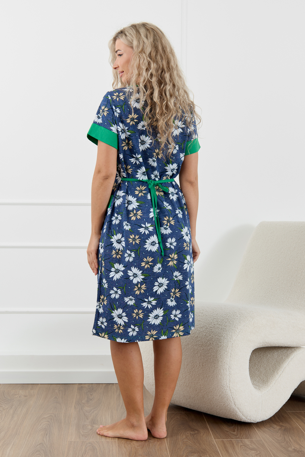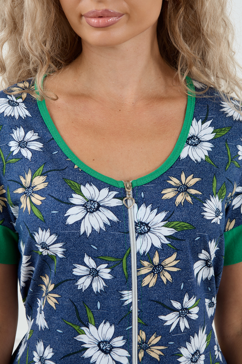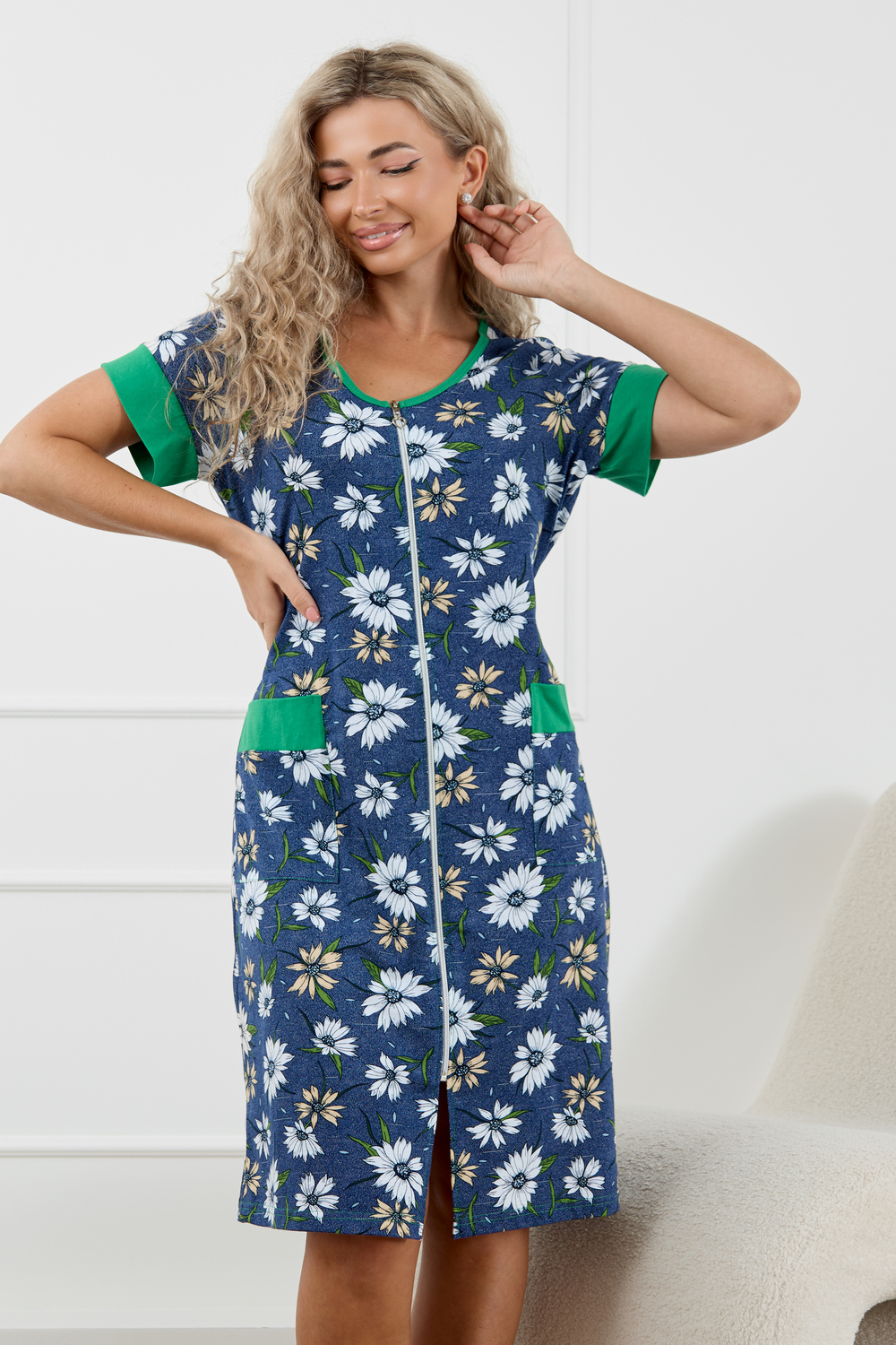 Женский халатик на молнии – самая распространенная и универсальная одежда для домашнего отдыха и хозяйственных хлопот. После трудного рабочего дня, приходя домой, первым делом хочется переодеться. И данная модель это идеальный вариант среди представительниц прекрасной половины человечества. Модель выполнена из 100% хлопчатобумажной ткани. Халат так же дополняет яркая отделка по рукавам и карманам. А пояс на линии талии поможет легко смоделировать женственный силуэт и при этом Вы будете чувствовать себя легко и непринуждённо. Данная модель прекрасно подойдёт для дома, дачи и отдыха, создавая по-настоящему яркий образ и хорошее настроение! Рост модели на фото 165см.