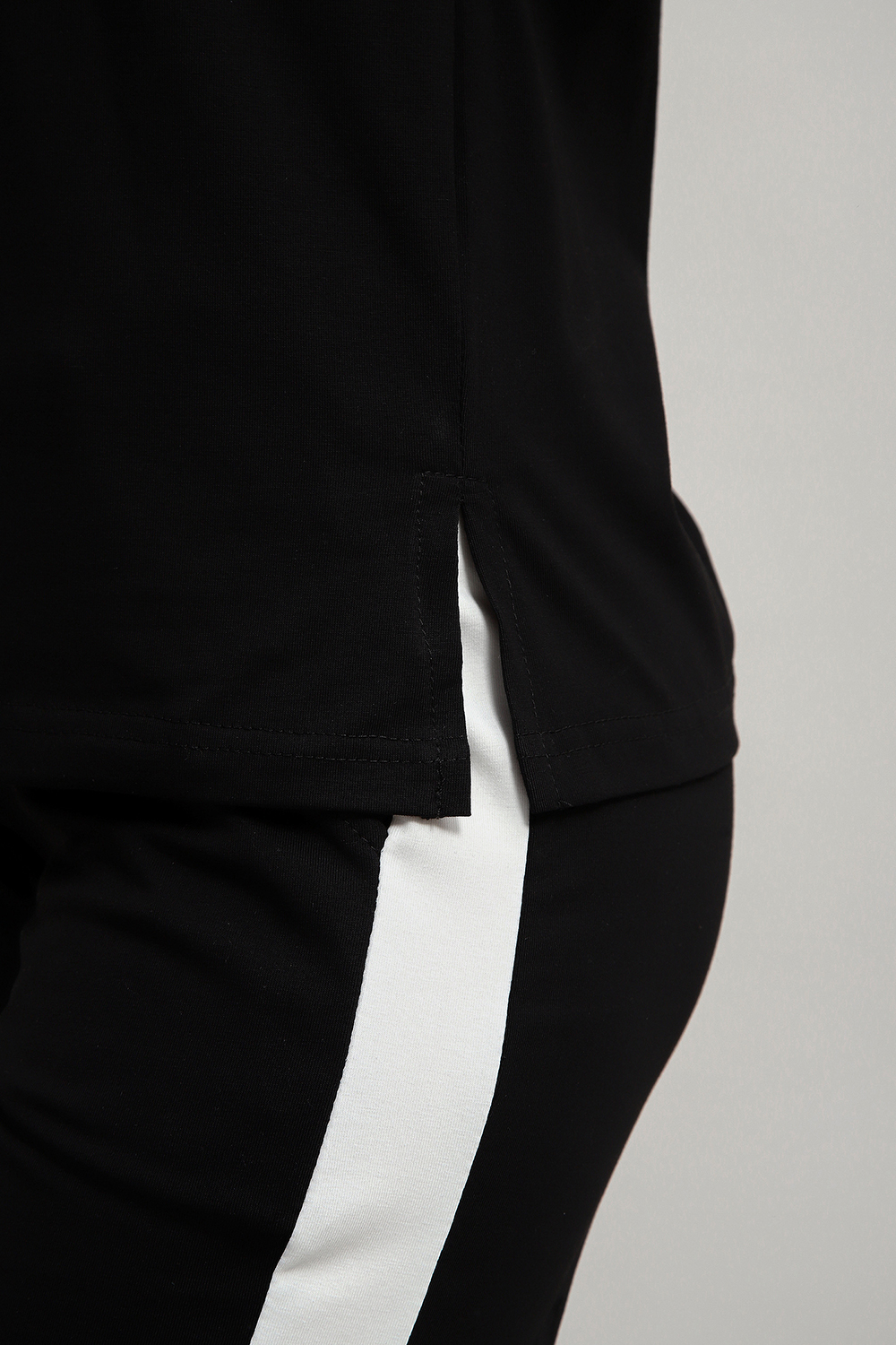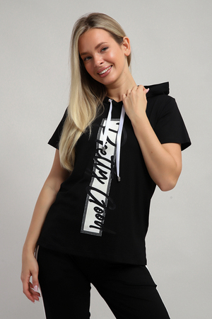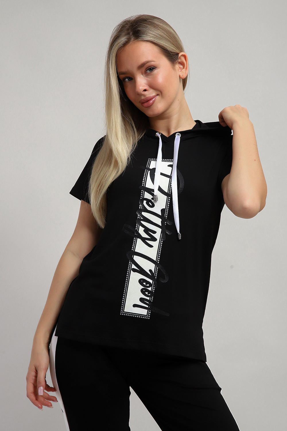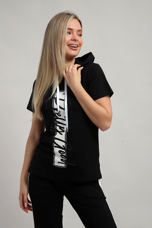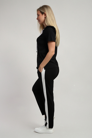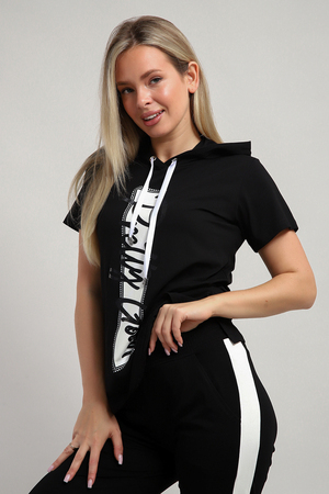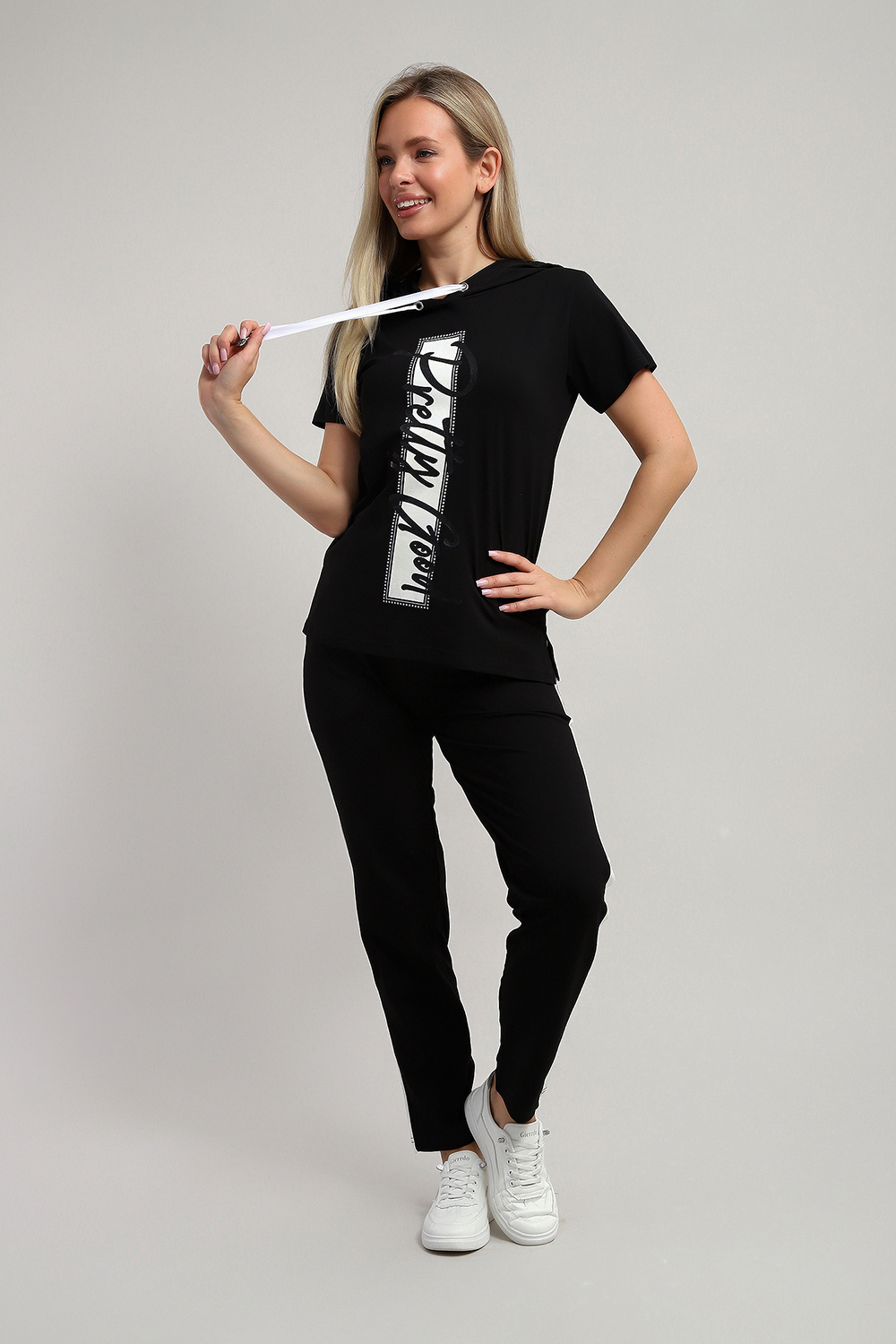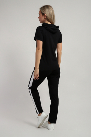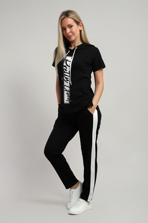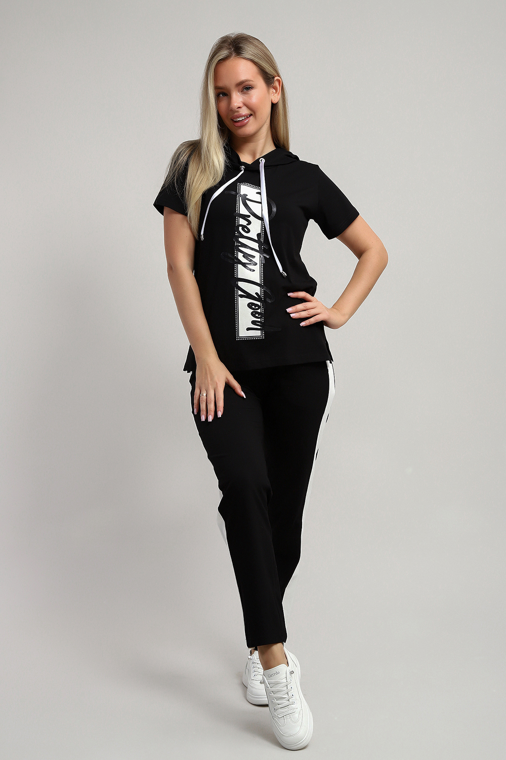 Стильный женский костюм из легкой дышащей ткани. Сшит из мягкого трикотажного полотна высокого качества. Основной изюминкой костюма является яркий принт на полочке кофты, расположенный вертикально и контрастирующий с общим фоном. Кроме того, на кофте имеется капюшон, объем которого регулируется тонкой лентой. Этот универсальный и практичный повседневный костюм в спортивном стиле будет удобным и комфортным во многих ситуациях. Комплект отлично подойдет для спорта, бега или танцев. Брюки свободные с яркими лампасами, двумя боковыми карманами, на широком поясе с резинкой. Каждую вещь вполне можно использовать по отдельности. Комплект отлично подойдет для женщин любого возраста и поможет хозяйке выглядеть стильно, при этом даря чувство комфорта!