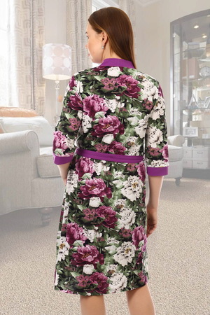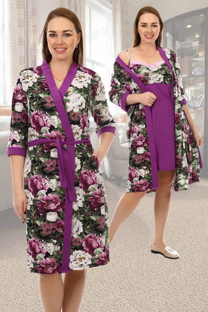 Халат запашной с рукавами 3/4. Сорочка на тонких бретелях с подрезом под грудью, на детали кокетки кружево и бантик. По центру кокетки сборка