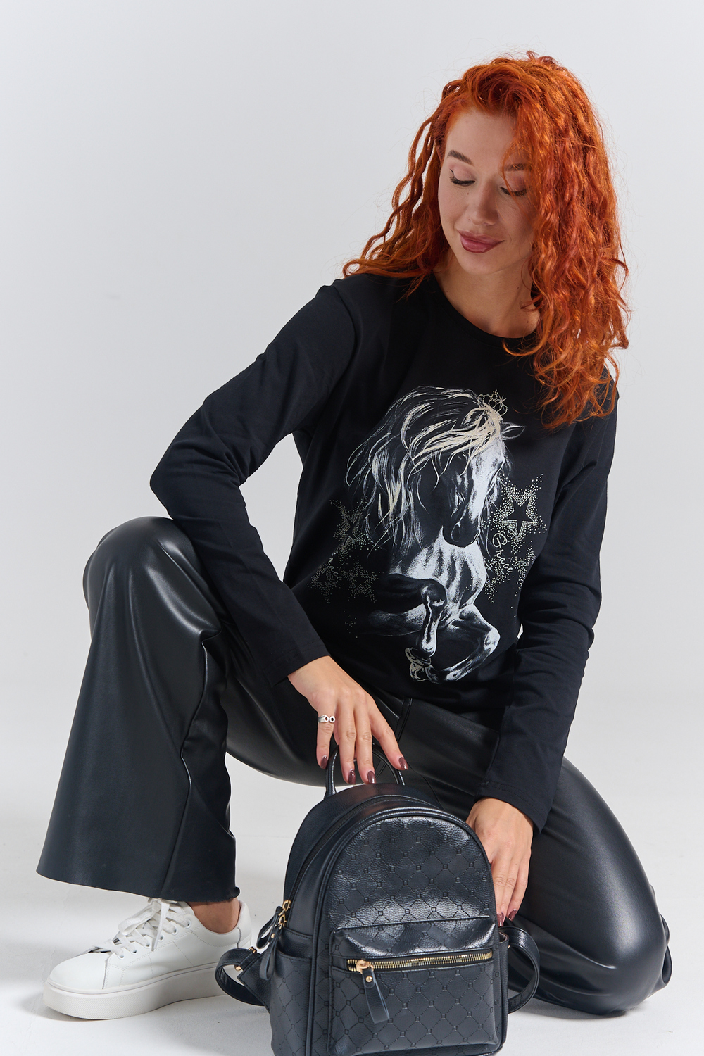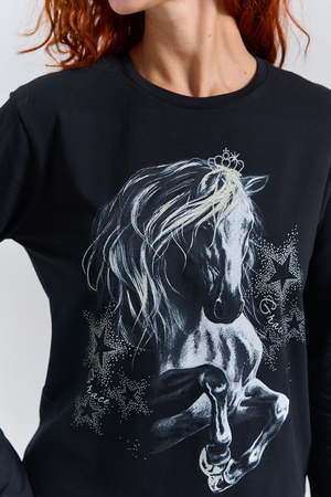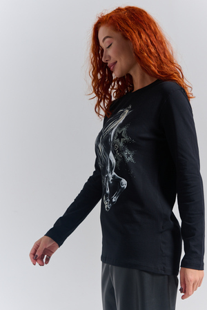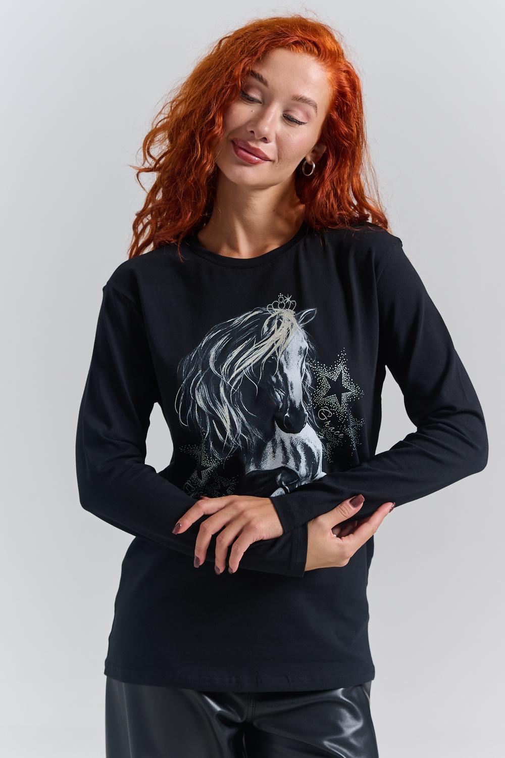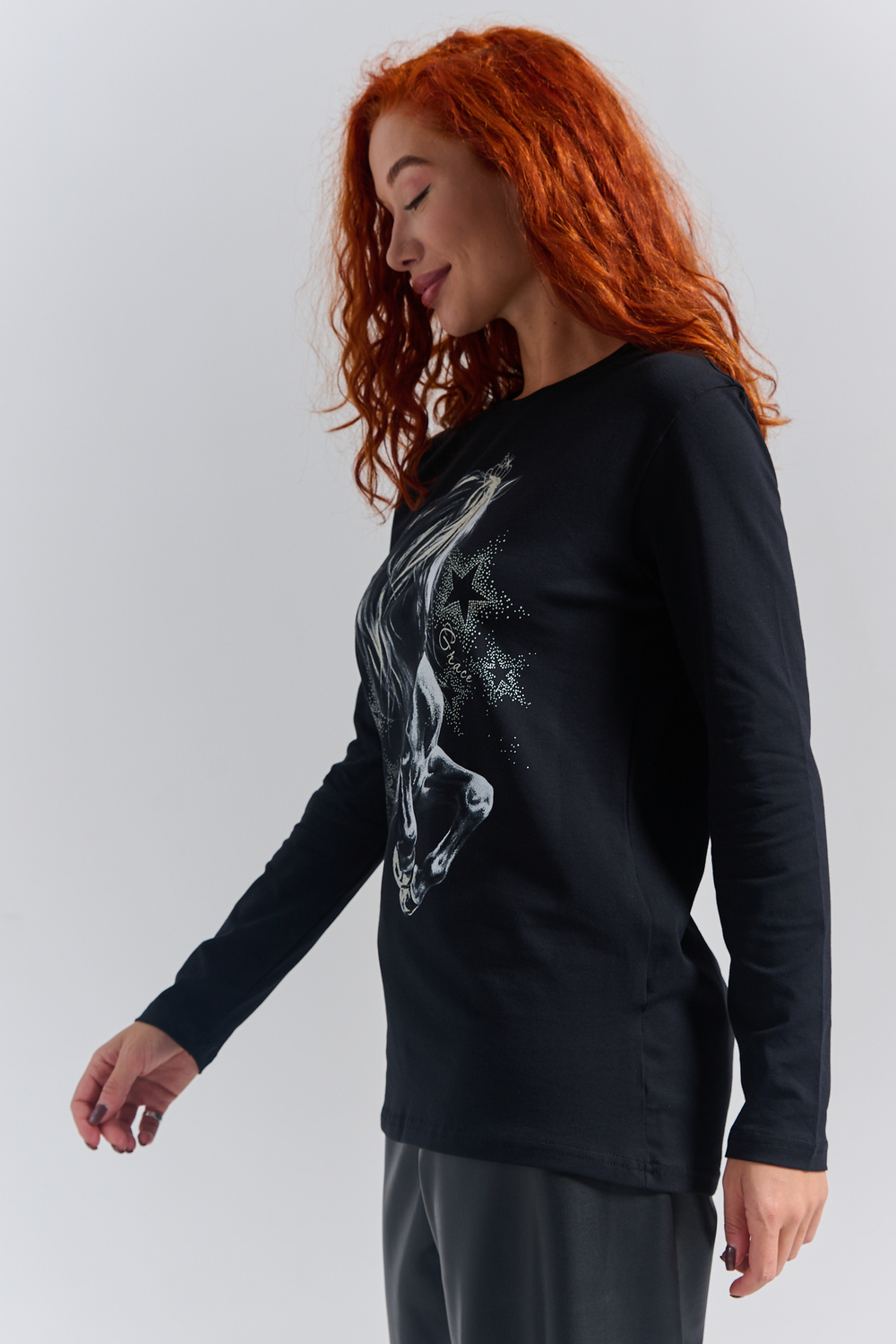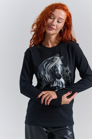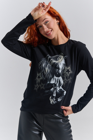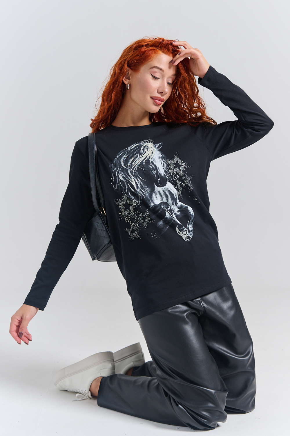 Покупатель на Ozon10.11.2025 в 20:59Лонгслив хороший, ткань лёгкая, как у футболки, не плотная, на мой рост 172 рукава и сам лонгслив всë таки длинноват, хотесь бы покороче. но оставила, лошадка красивая