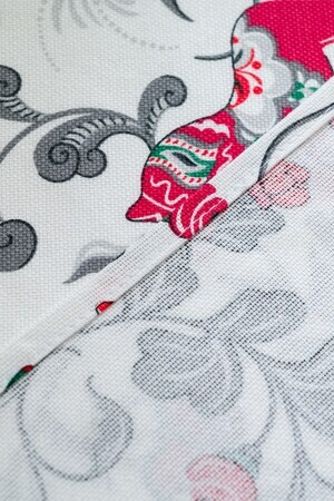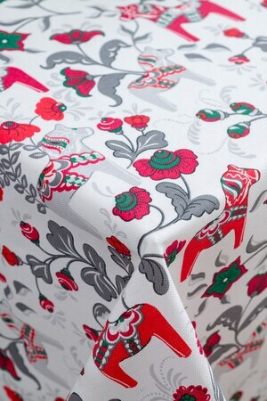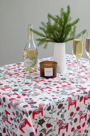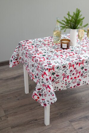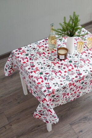Уникальный дизайн: Скатерть выполнена в традиционном стиле Городецкой росписи. Белый фон украшен яркими красными лошадками, символами наступающего 2026 года, и зимними атрибутами, создающими атмосферу праздника и радости.