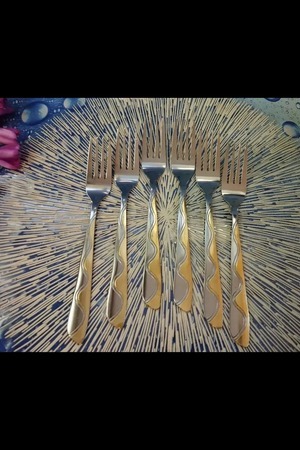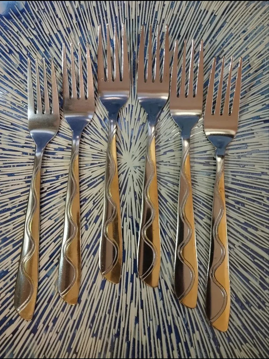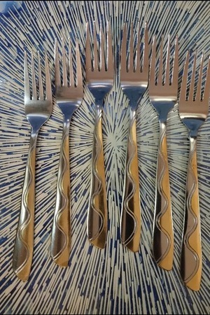 Набор из 6-ти столовых приборов отличаются антикоррозийными свойствами и высокой устойчивостью к кислотам и щелочи. Набор вилок выполнен из высококачественной нержавеющей стали, которая проходит тщательный контроль. Такая сталь не изменяет вкус и цвет пищи и не выделяет вредные вещества. Ручки столовых приборов украшены красивым стильным узором под золото. Стильный набор столовых приборов станет настоящим украшением любого праздничного или обеденного стола. Внимание! Перед первым применением тщательно промойте приборы для сервировки мягкой губкой с моющим средством.