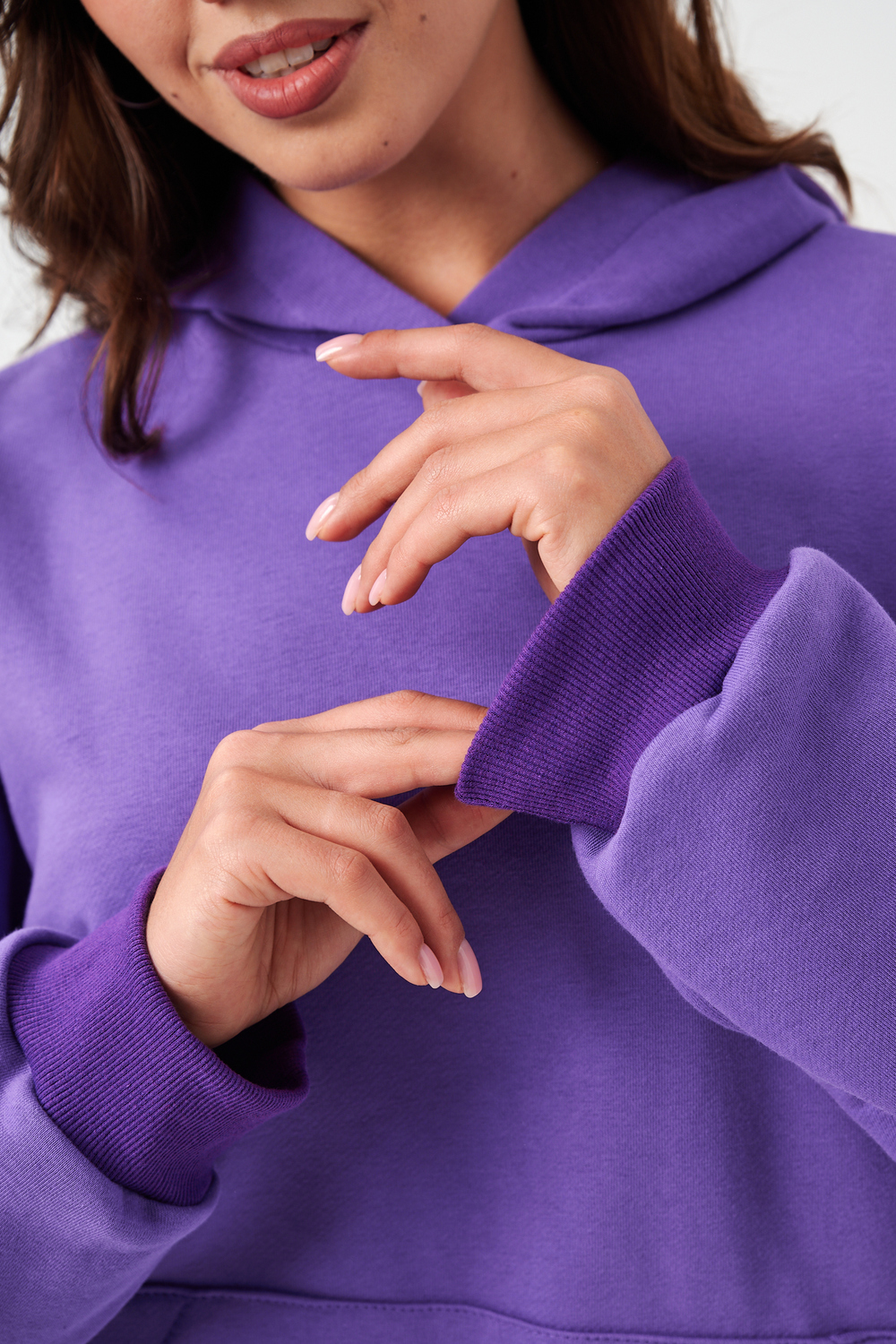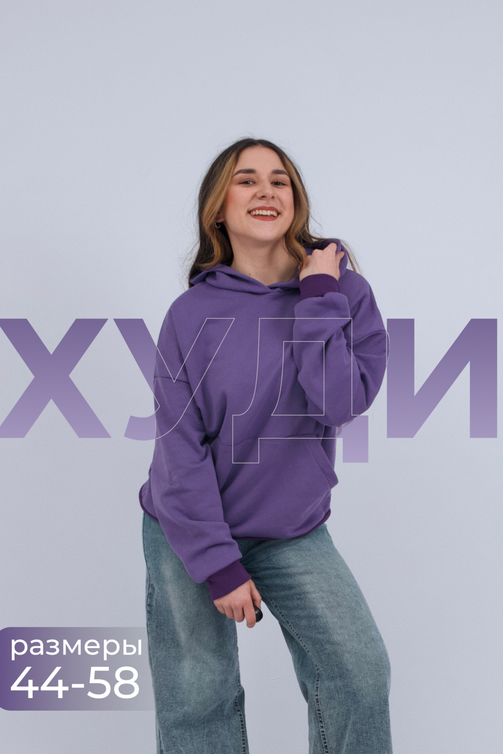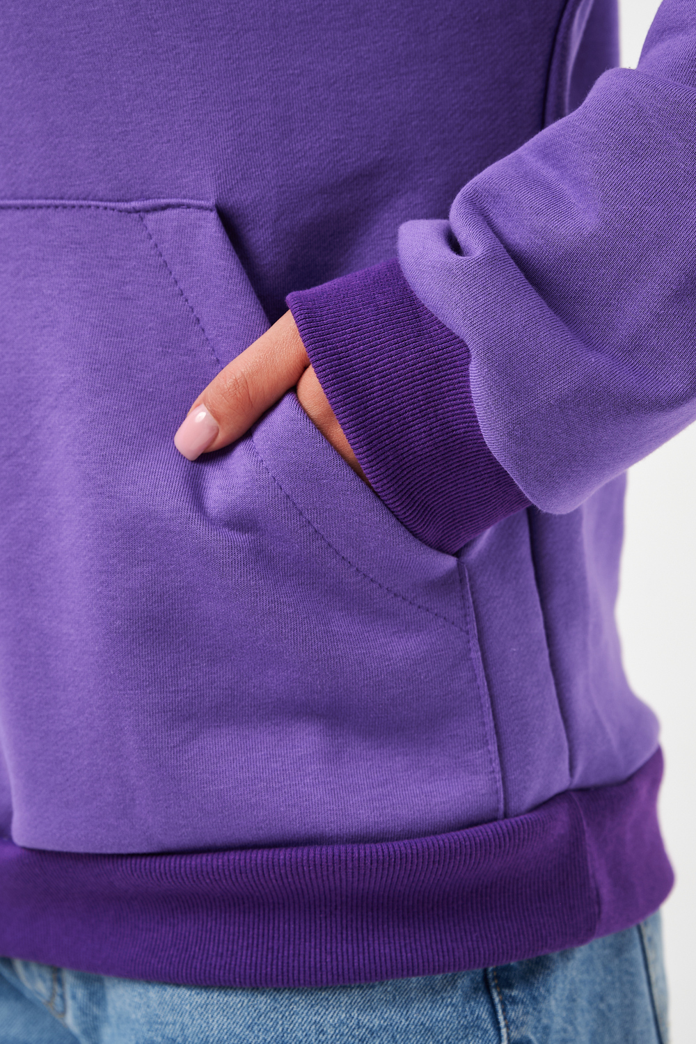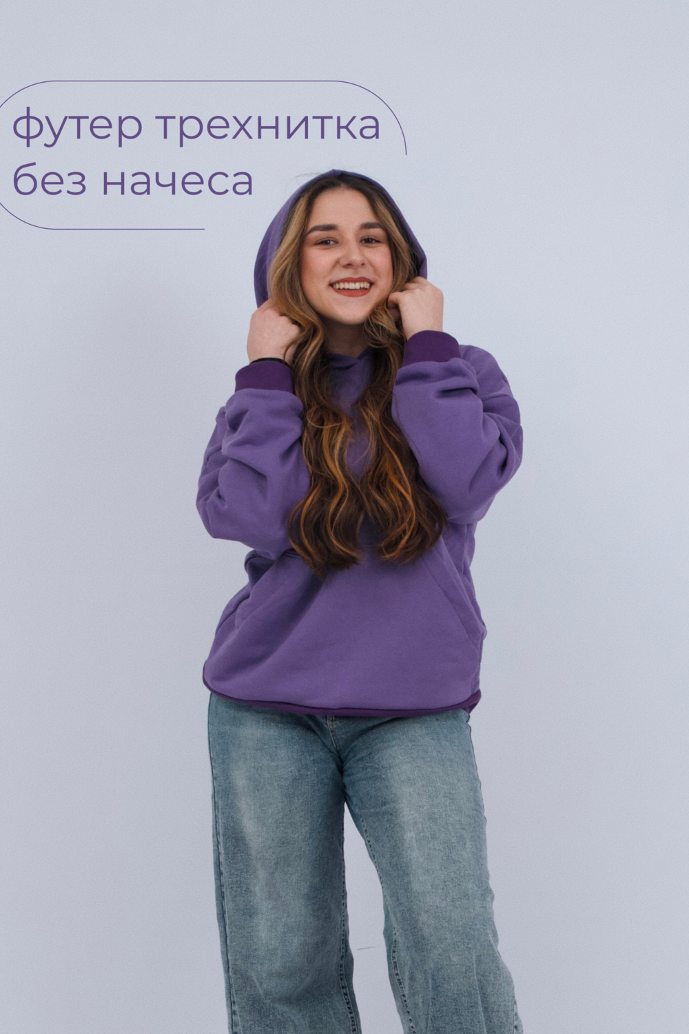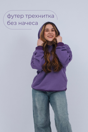 Толстовка без начеса выполнена из футера 2-хнитки. С карманом кенгуру и капюшоном. Рукава на манжете.