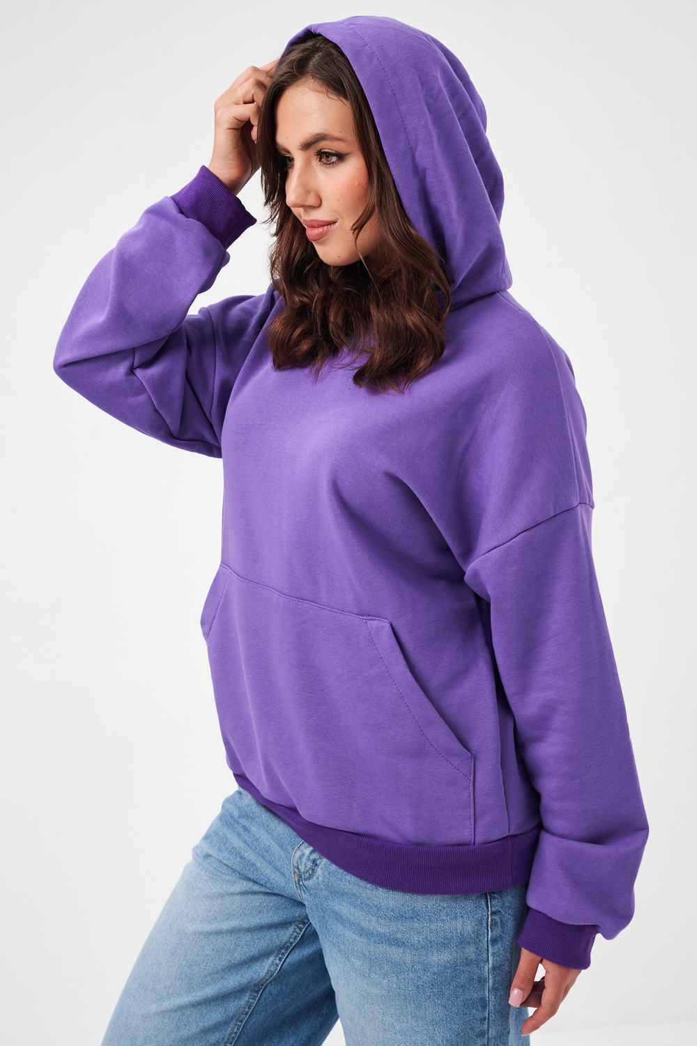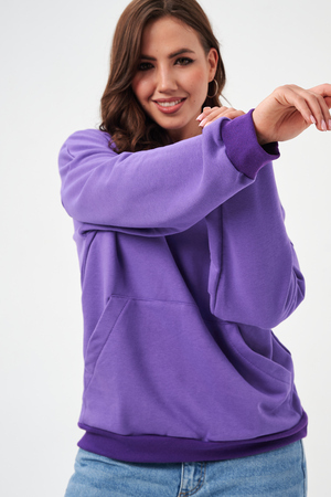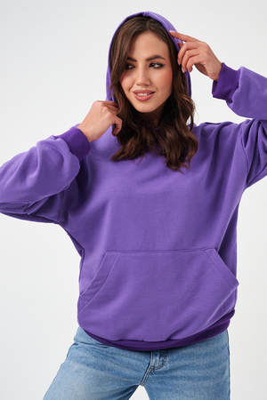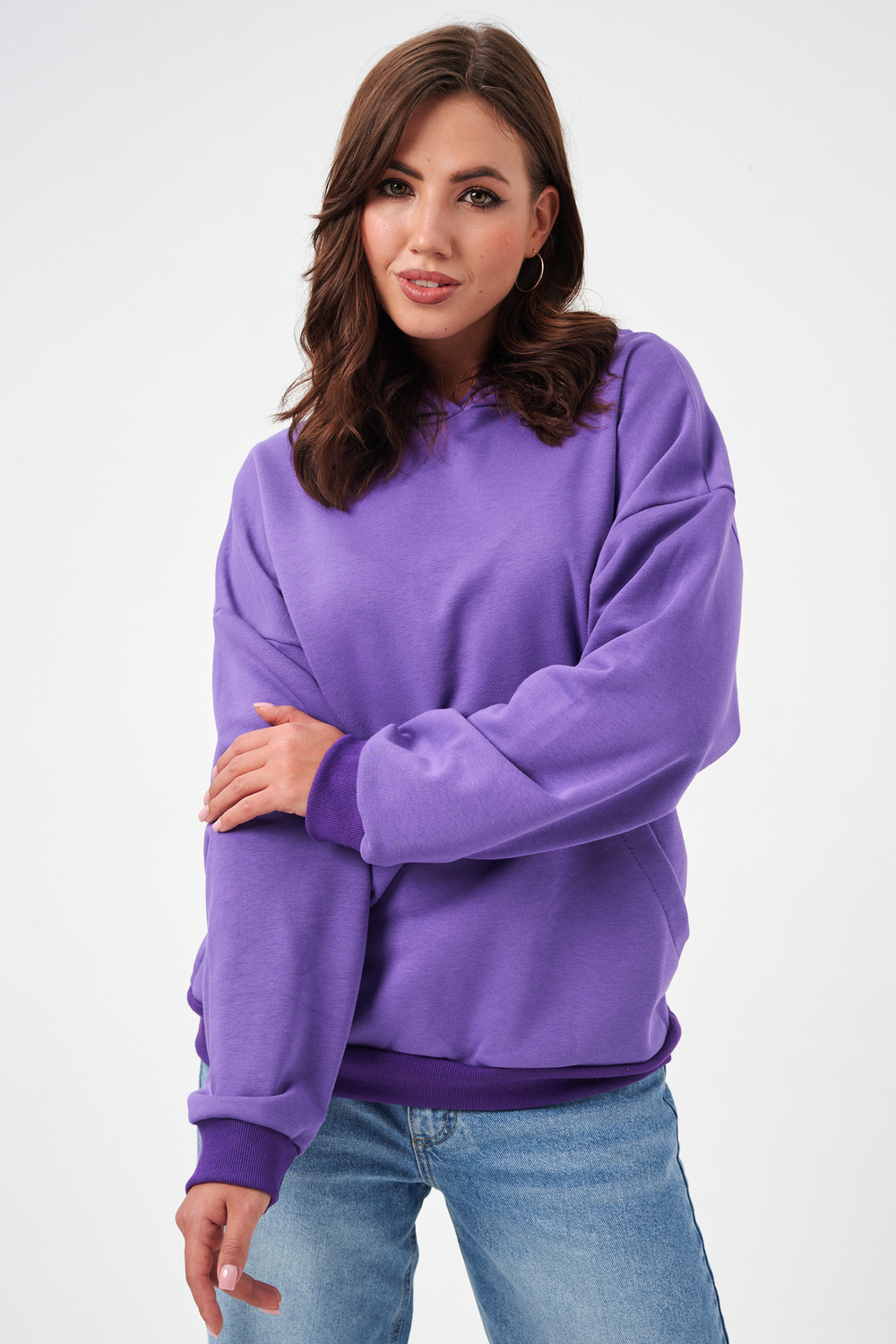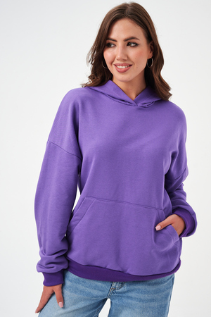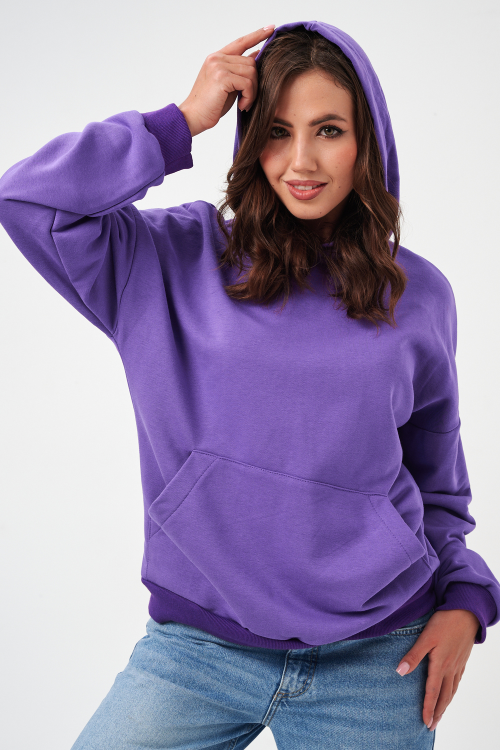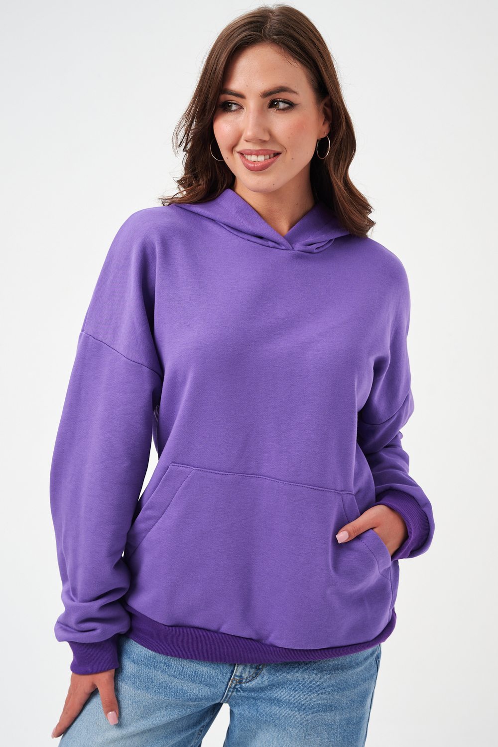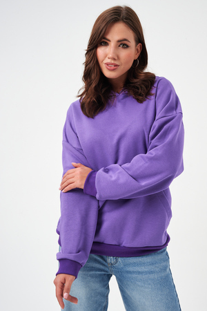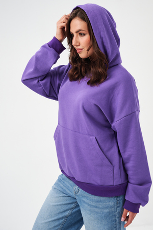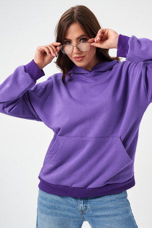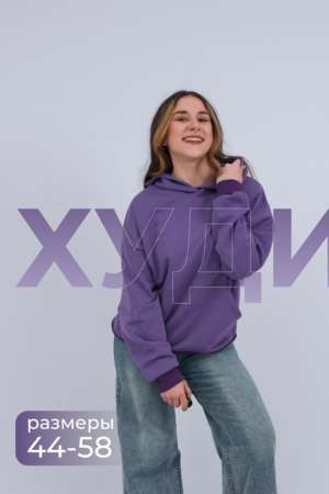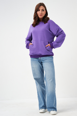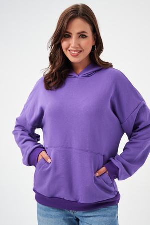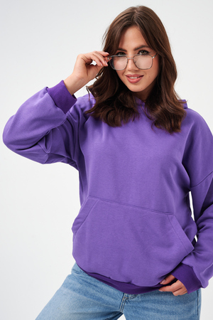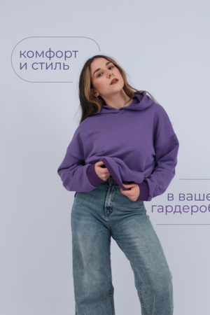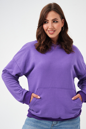 свободная толстовка с спущенной линией плеча, и накладным карманом-кенгуру. Изготовлена из хлопкового трикотажа футера 2-х нитки без начёса.