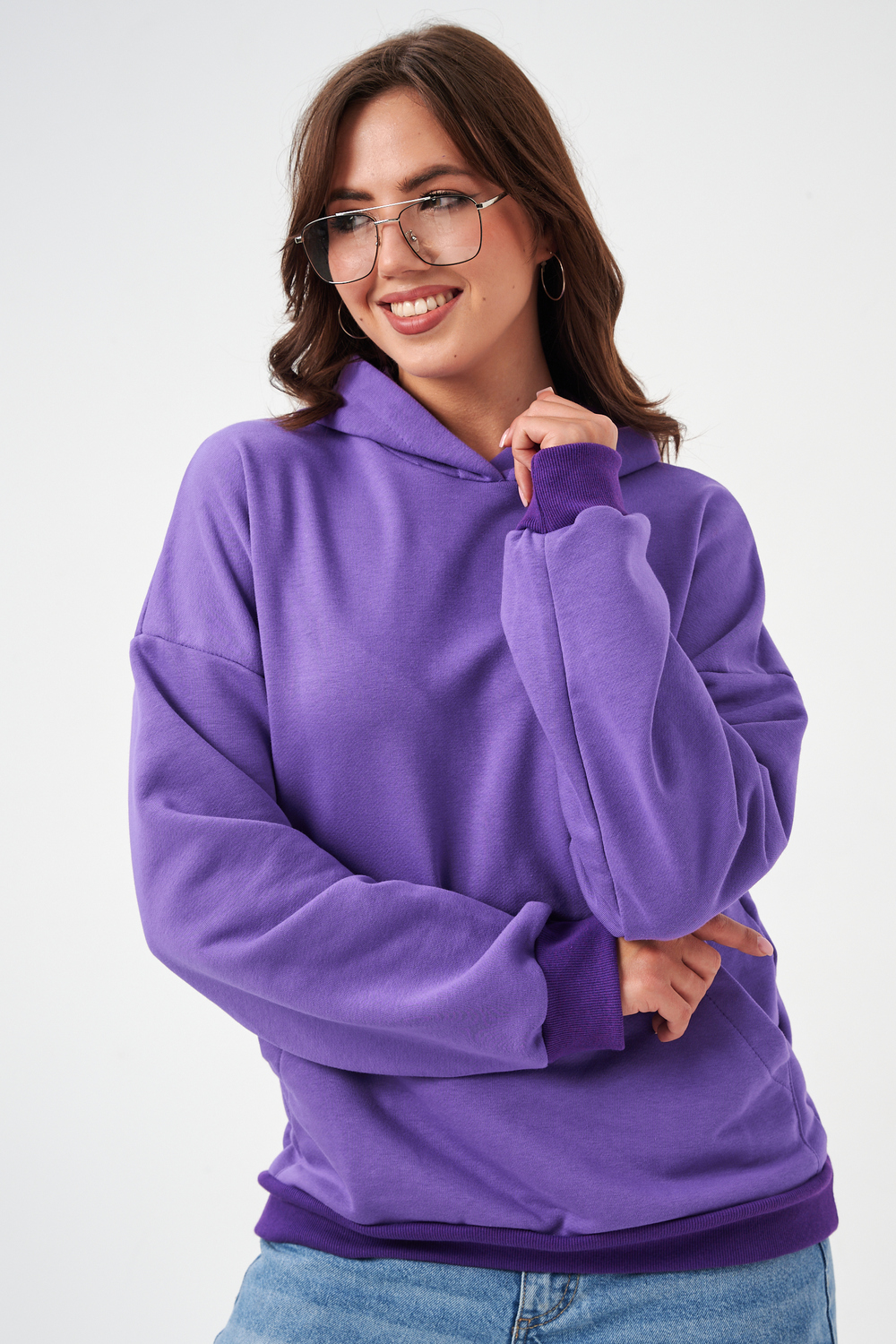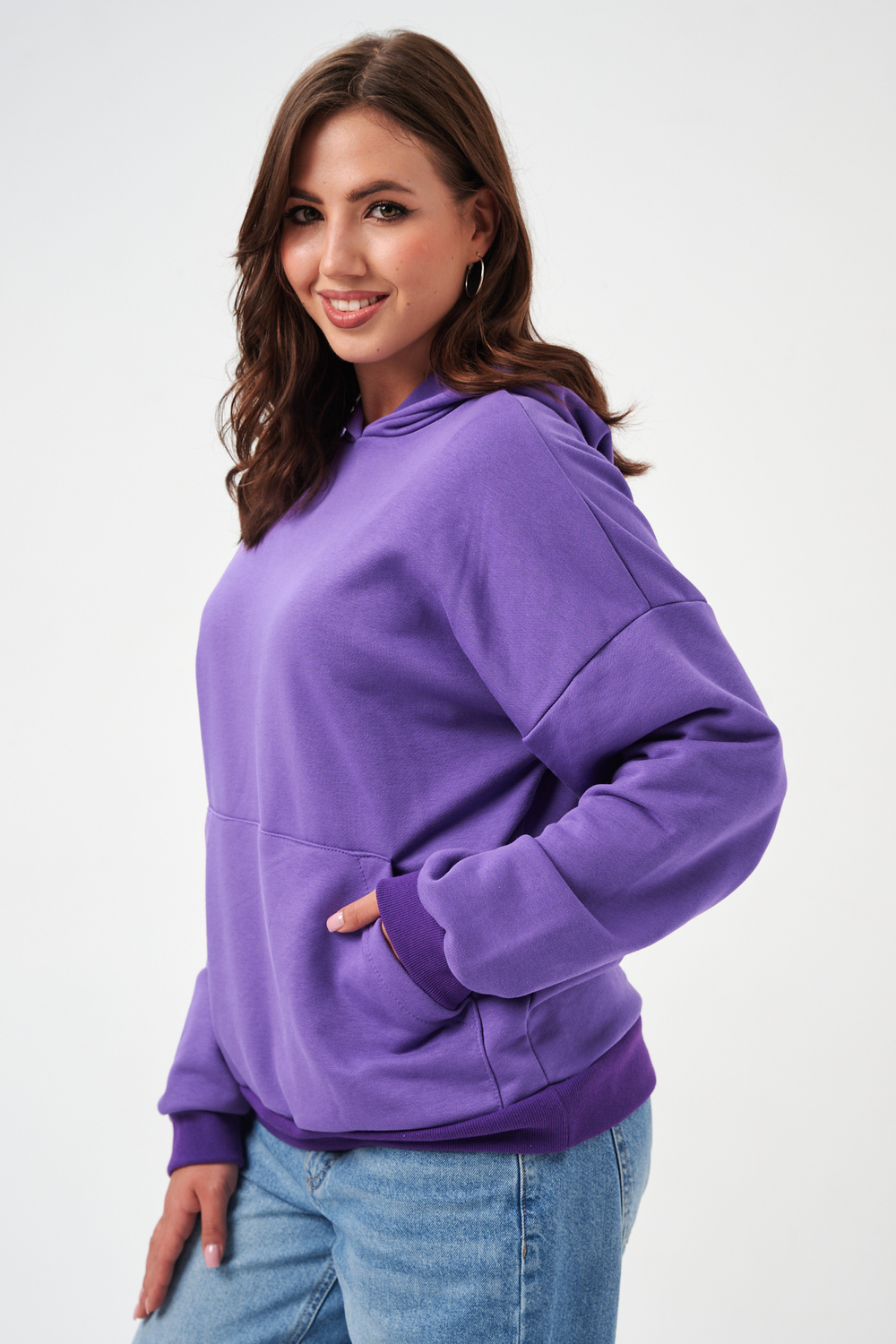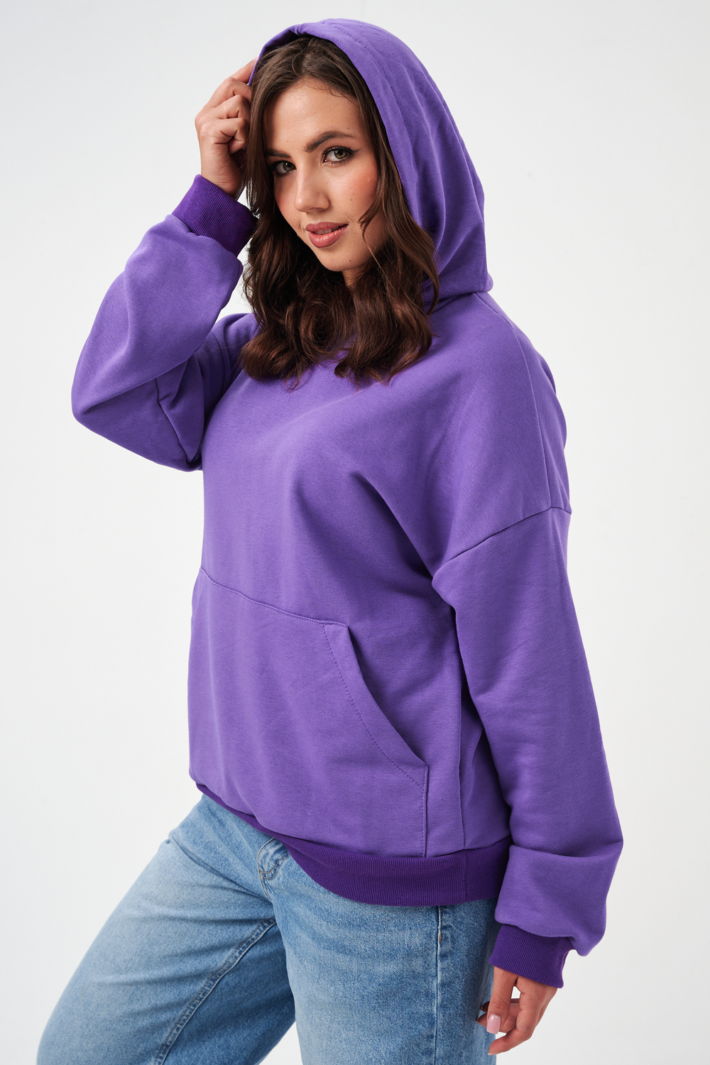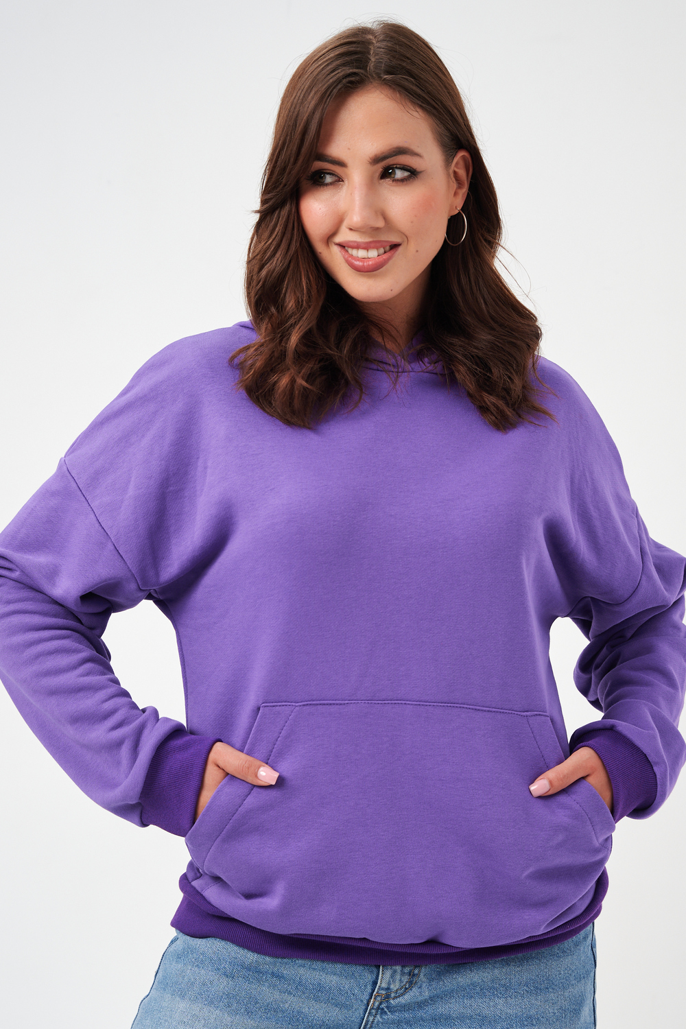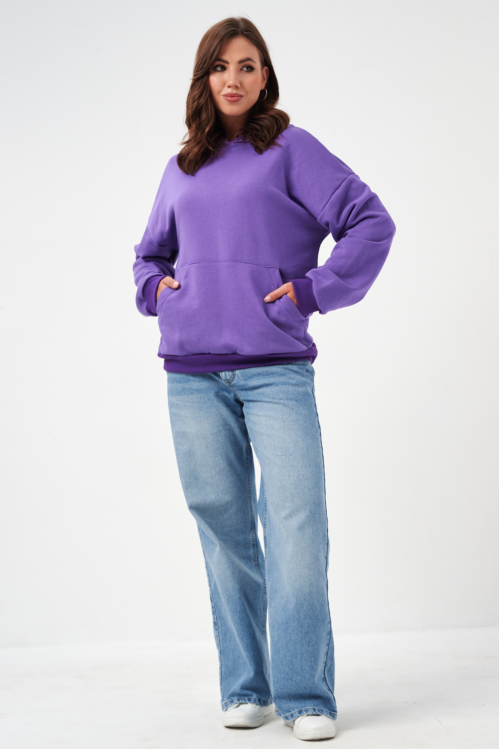 свободная толстовка с спущенной линией плеча, и накладным карманом-кенгуру. Изготовлена из хлопкового трикотажа футера 2-х нитки без начёса.