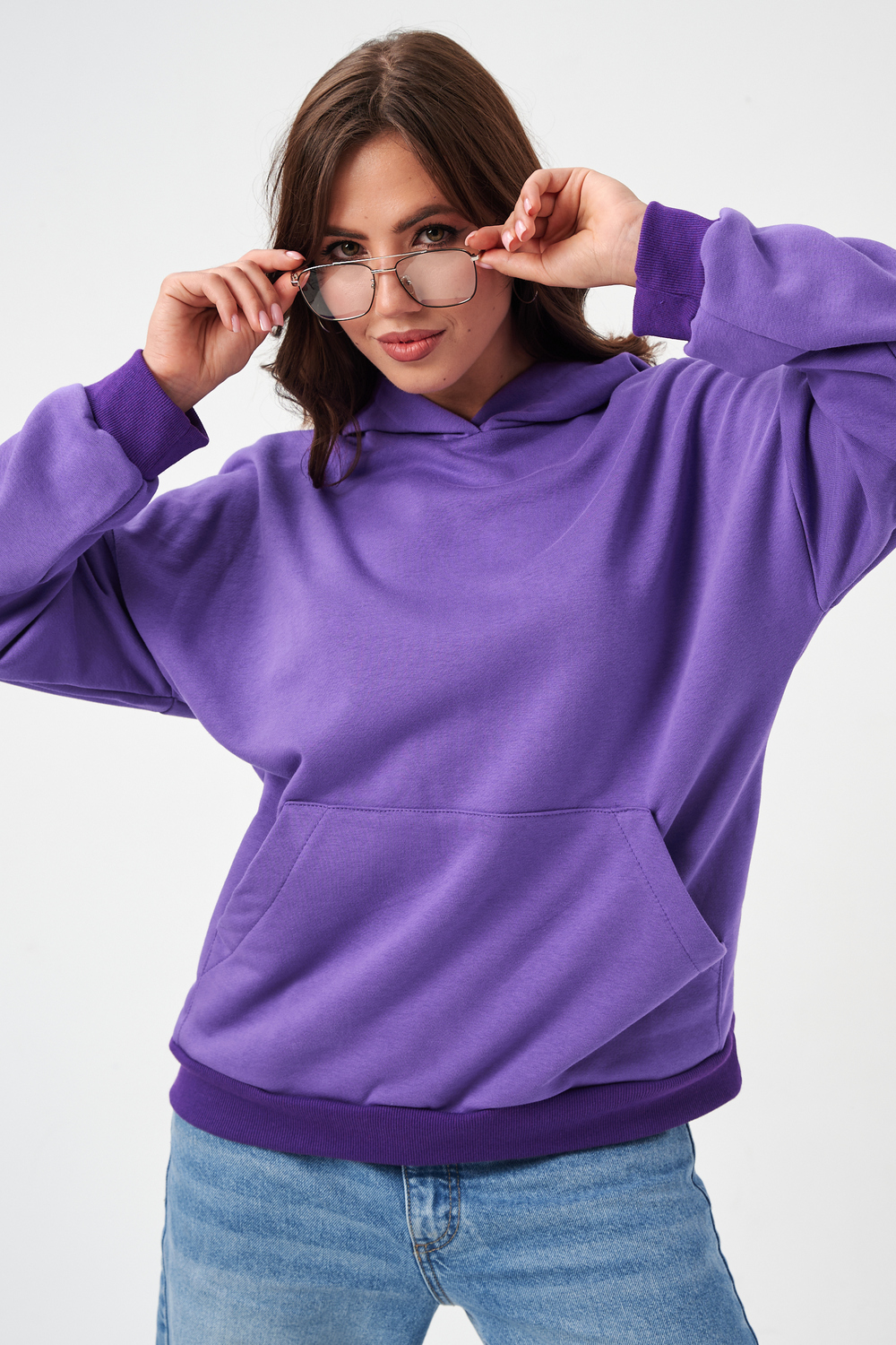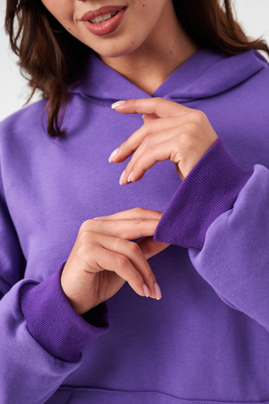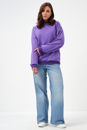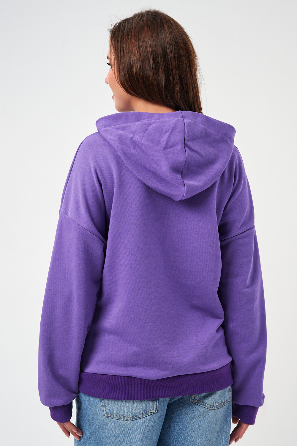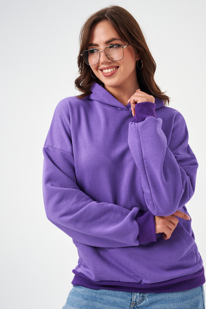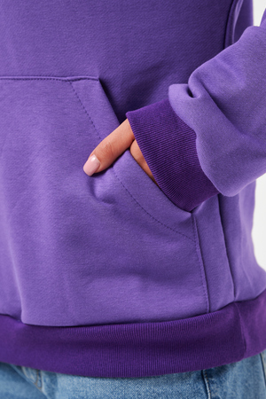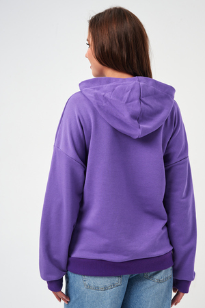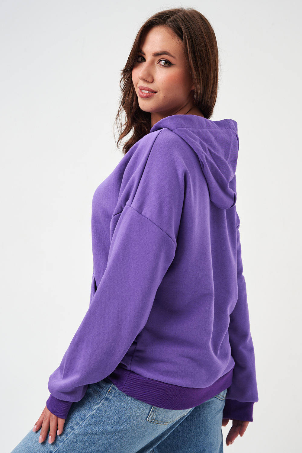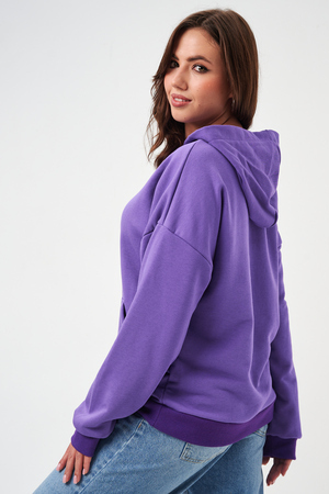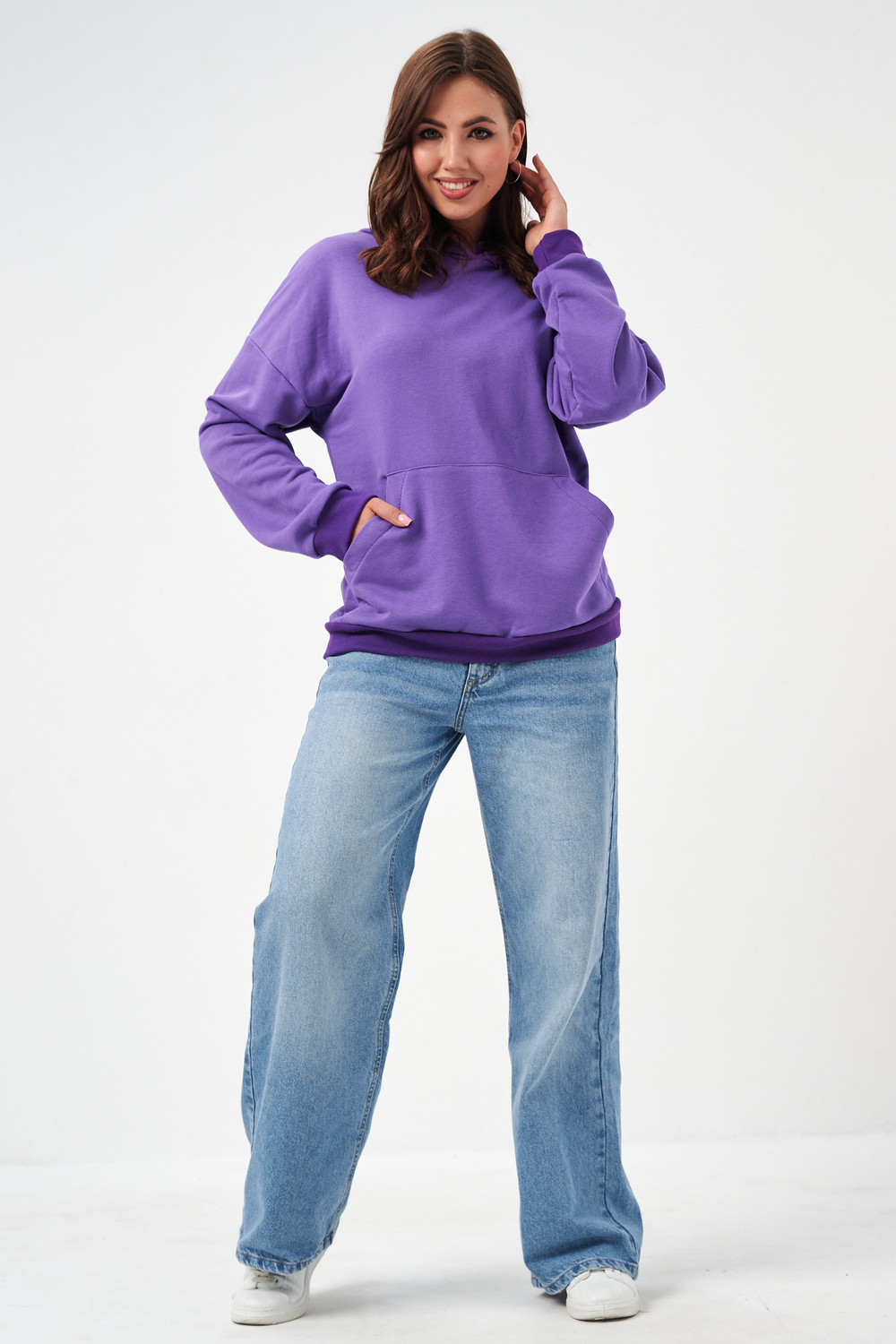 свободная толстовка с спущенной линией плеча, и накладным карманом-кенгуру. Изготовлена из хлопкового трикотажа футера 2-х нитки без начёса.