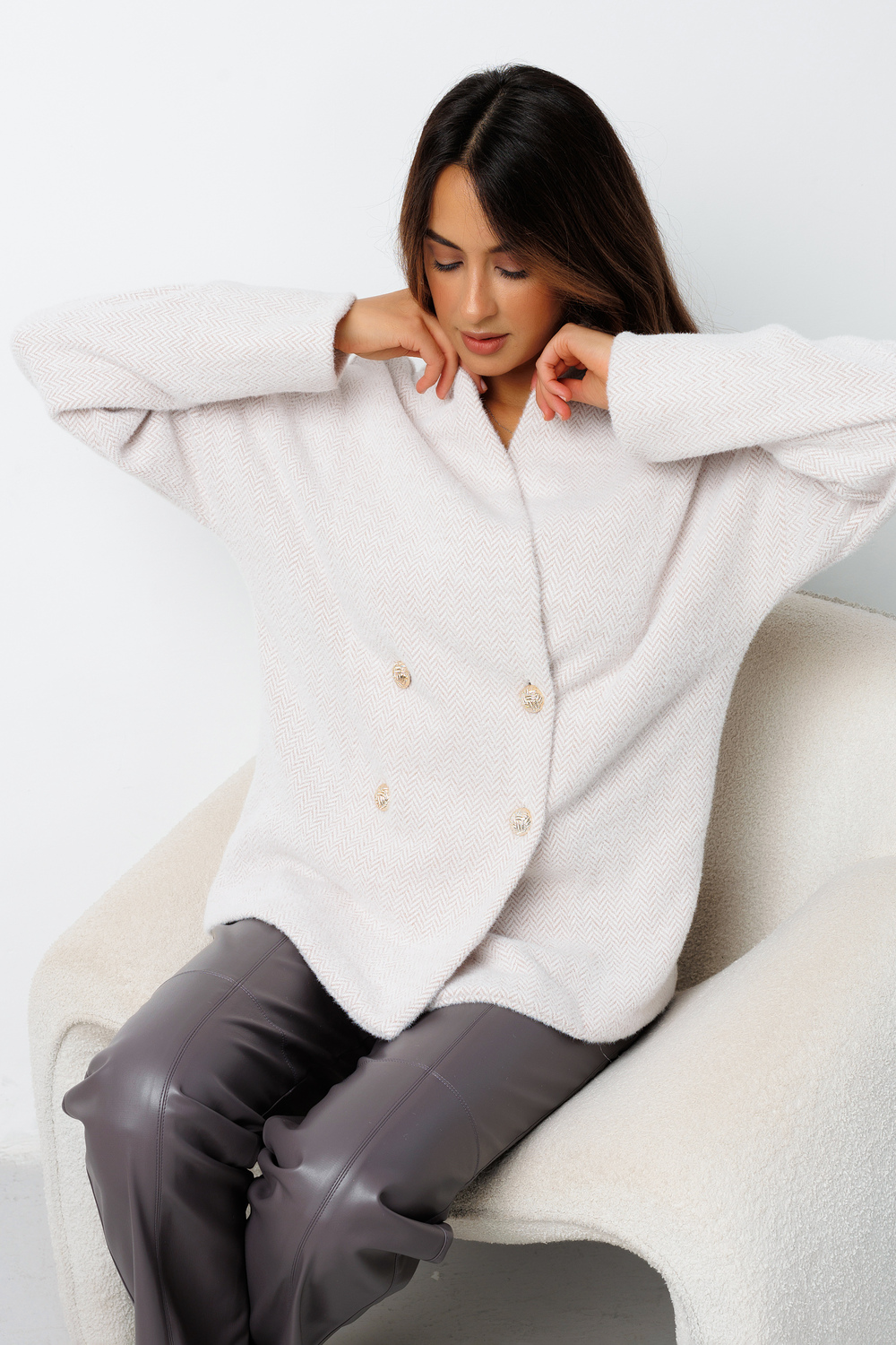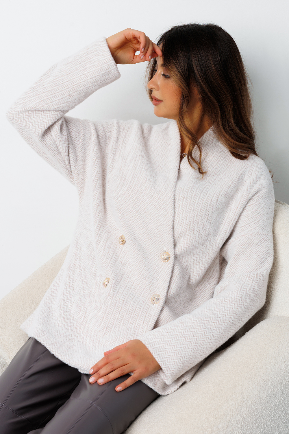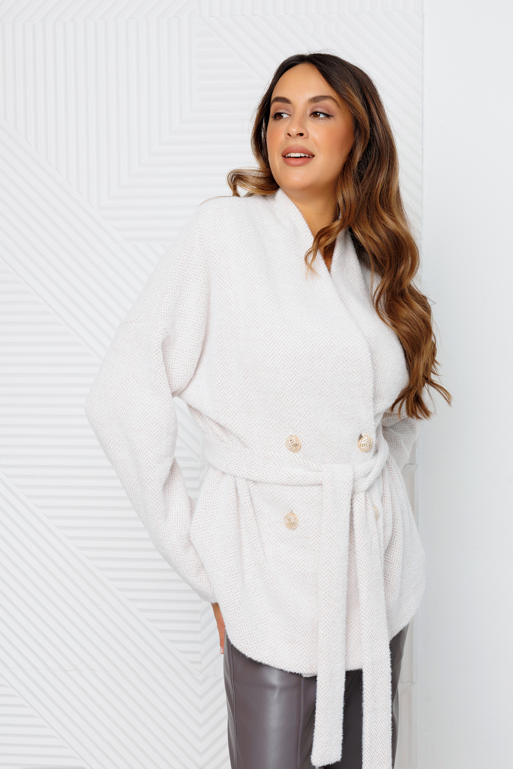 Кардиган женский Raposa - это трендовое и комфортное решение для прохладной осенней погоды. Удлиненный крой оверсайз в сочетании с мягким, пушистым материалом из евро ангоры и вискозы создает ощущение тепла и уюта. Серый кардиган двубортный на запах с поясом и на пуговицах подчеркивает женственную фигуру, выстраивает приталенный силуэт и позволяет регулировать посадку по фигуре. Акцентный воротник кимоно придает кардигану олд мани old money элегантный вид, а золотые пуговицы добавляют изюминку. Благодаря универсальному бежевому цвету и лаконичному рисунку кардиган легко впишется в любой гардероб. Кардиган плюшевый подойдет как офисный вариант, так и для повседневных образов, а благодаря своей универсальности, может быть использован как кофта с длинным рукавом, пиджак, жакет или даже легкое пальто. Кардиган осенний трикотажный можно комбинировать с любыми вещами Вашего гардероба, создавая как классические, так и более смелые кэжуал casual образы. Кардиган теплый уютный в елочку на осень – зиму  2025 – 2026 идеально подойдет для высоких и невысоких, для девочки подростка в школу, а также для беременных будущих мам и полных женщин больших размеров плюс сайз plus size до 56 и 58 размера. Кардиган шерсть ангора стильный достойно представляет российское производство и создает визуальный эффект кардиган из альпаки. Кофточка Raposa станет незаменимой для модных аутфитов как накидка на платье.