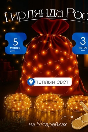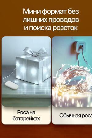 Представляем Вам новогодние ниточки росы — это не просто маленькие гирлянды, а настоящий элемент волшебства для вашего дома! Эти мини огоньки в форме капли будут светить ярко и весело, создавая уют и теплую атмосферу праздника. Гибкая, но прочная проволока даёт вам полную свободу в декорировании. Украсьте ёлку, обвяжите полки или придайте необычный вид даже обычным предметам интерьера — светящиеся гирлянды могут превратить ваш диван в предмет искусства! А если захотите добавить немного магии в подарки — легко украшайте коробки, букеты и упаковки, ведь эти маленькие элементы освещения подойдут и для самого креативного декора. А главное — никаких проводов! Эти светодиодные гирлянды работают на батарейках, которые прослужат Вам долго, так что вы можете разместить их где угодно, даже если до ближайшей розетки — как до Луны. Просто включите и наслаждайтесь: интерьерные беспроводные гирлянды дарят свет, а ещё — отличное настроение.