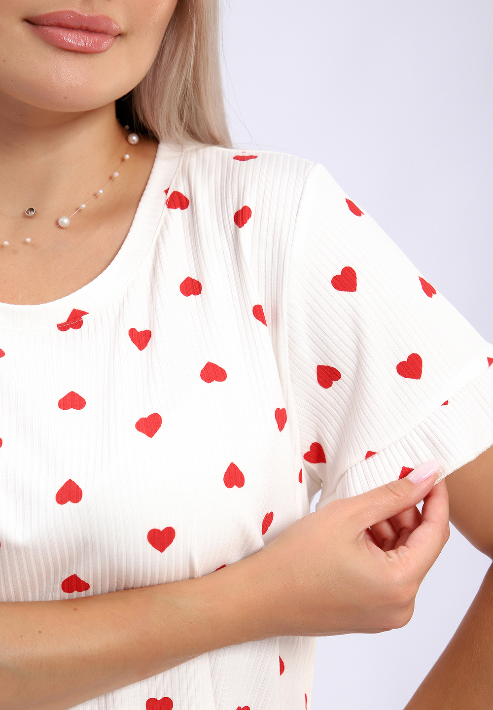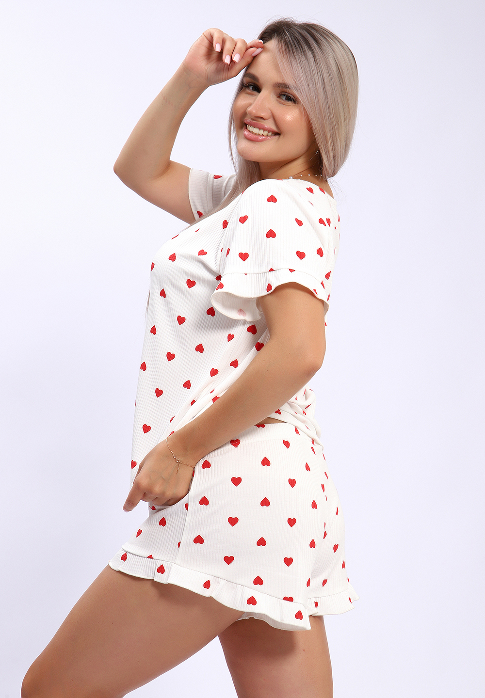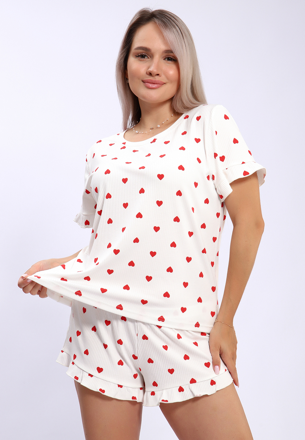 Эта уютная пижама состоит из мягкой футболки и шортов, выполненных из необычного материала, напоминающего лапшу. На принте изображены яркие красные и черные сердечки, создающие игривый и романтичный образ. Дополняет дизайн коричневый леопардовый узор, придающий комплекту стильный и дерзкий вид. Идеальный выбор для комфортных ночных и домашних образов, сочетая оригинальность и уют.