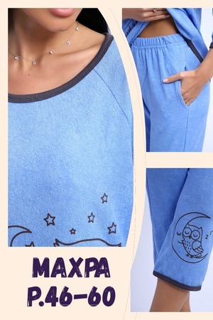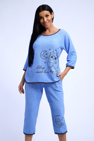 Симпатичный махровый костюм из футболки и бриджей. Футболка с рукавом-реглан длиной 3/4, на полочке изображение совы на фоне луны и звезд. Бриджи свободные, на резинке, с боковыми кармашками, на одной половинке - изображение маленькой совы.
