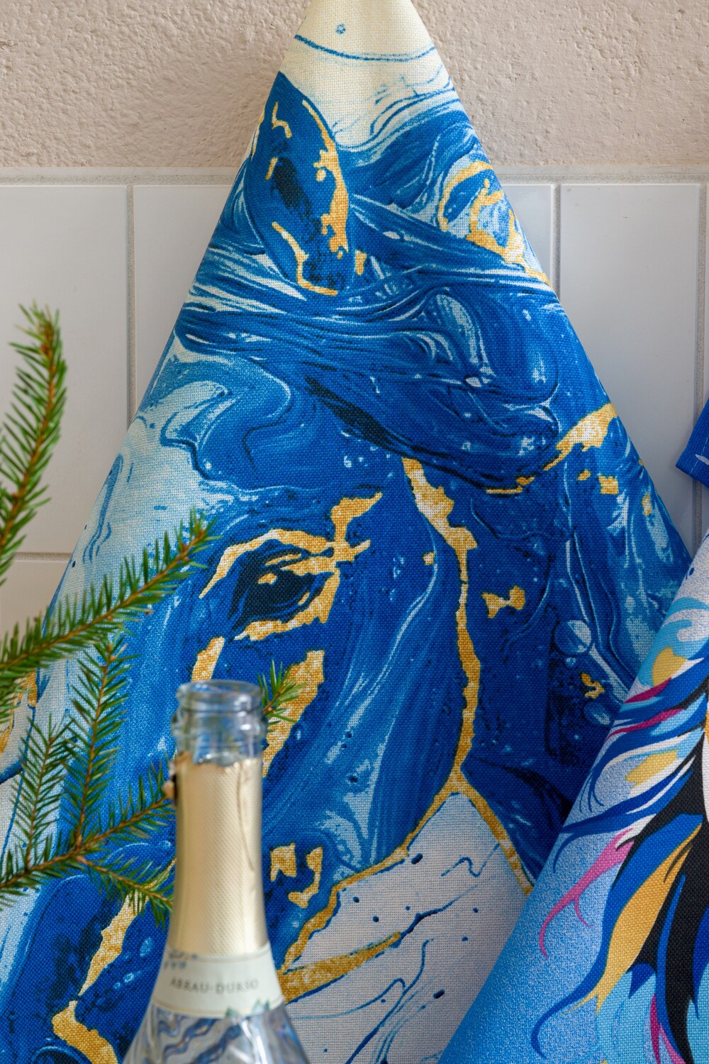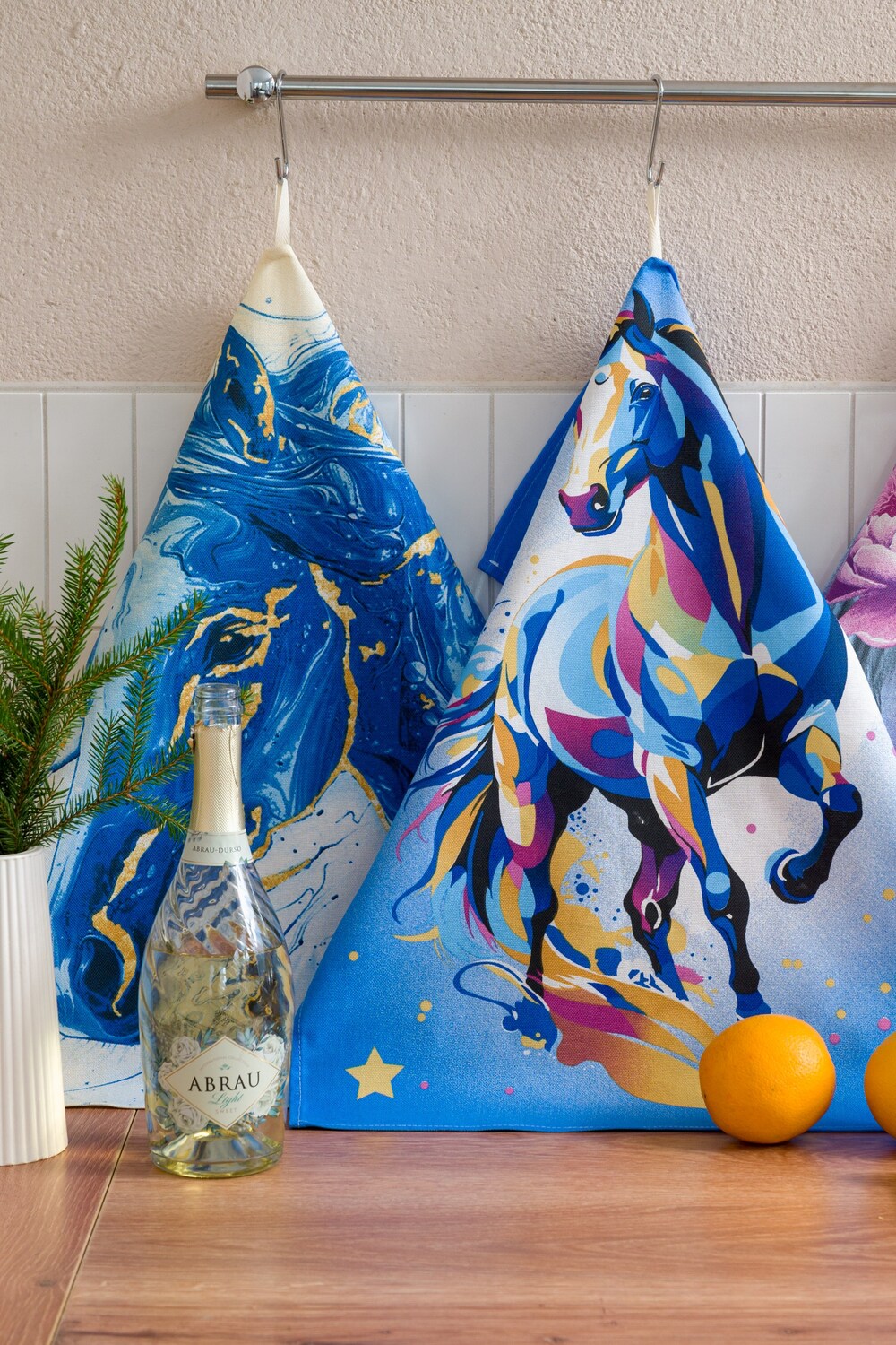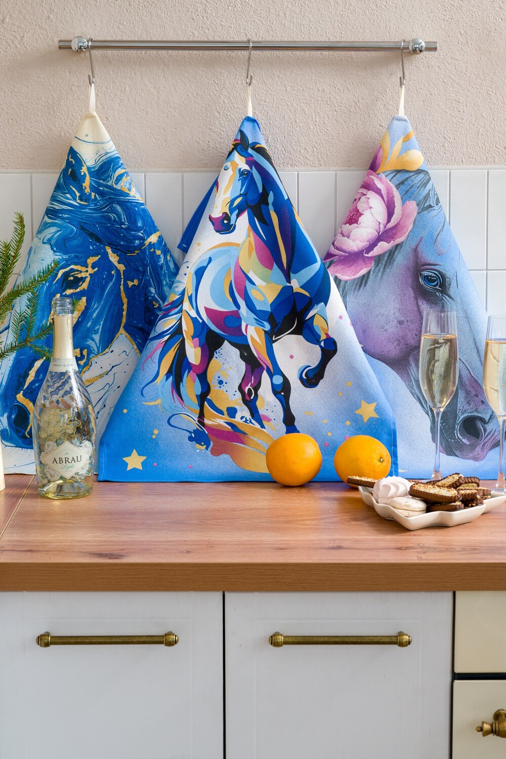 Дизайн: Выполненные в нежных голубых тонах, полотенца украшены изящными изображениями лошадей и зимней атрибутики. Этот дизайн делает набор не только красивым, но и символичным, ведь лошадь - символ 2026 года! Подарите удачу и процветание своим близким с этим особенным подарком.