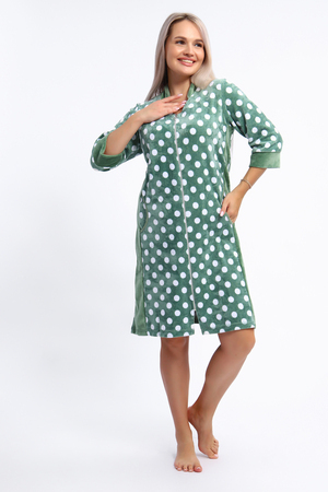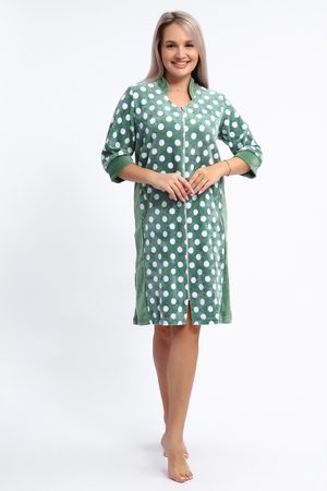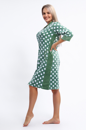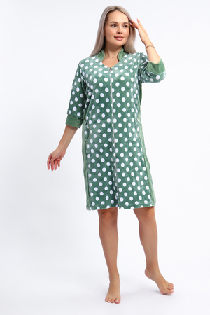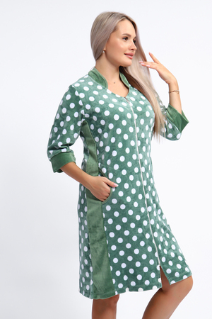 Халат велюровый на молнии в горошек. Воротник-стойка, рукава 3/4 на манжете, по бокам однотонная вставка, с карманами. Ткань велюр, качество отличное, после стирки цвет не теряет, не деформируется, приятное к телу. Для дома и отдыха.