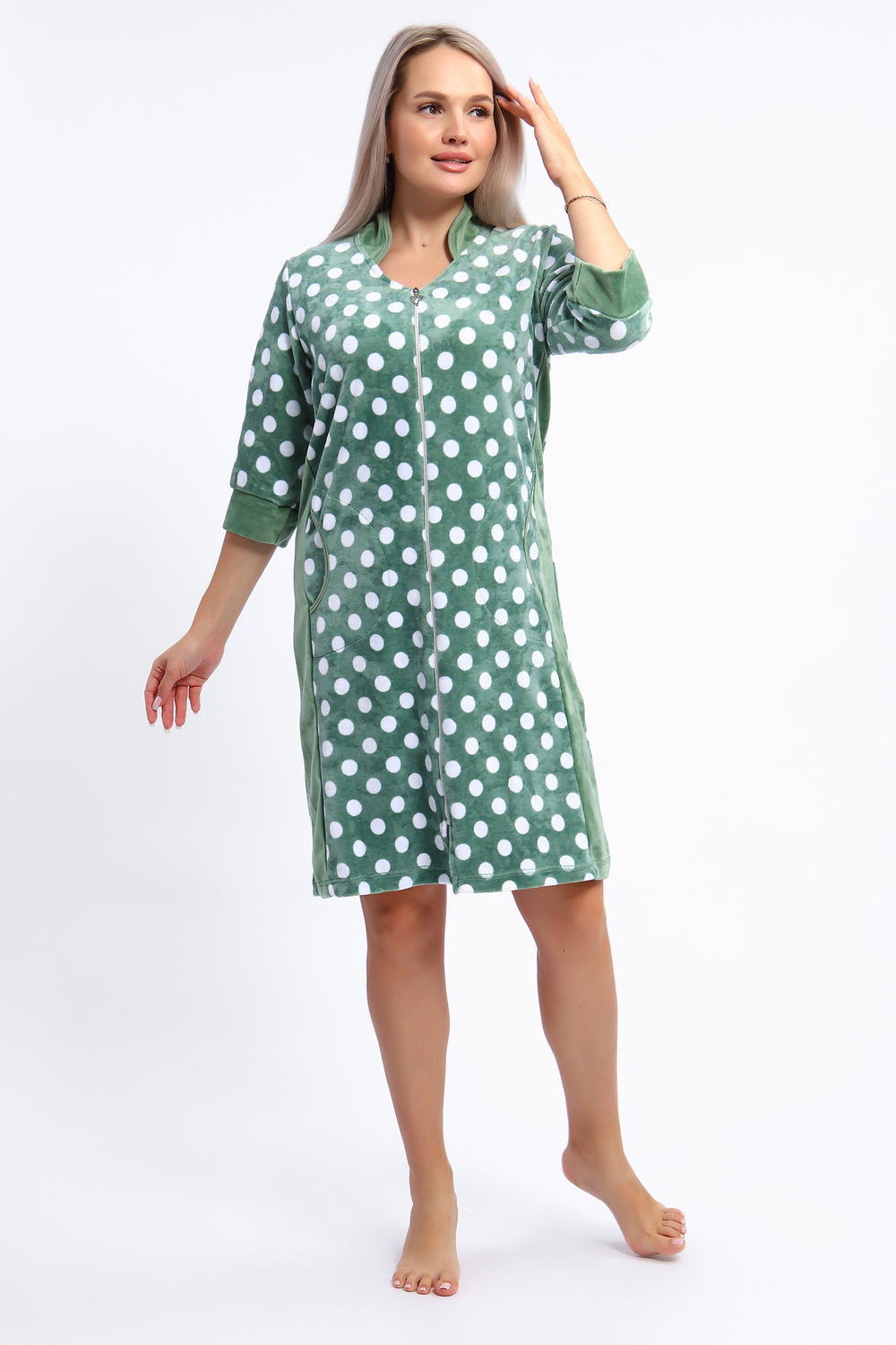 Халат велюровый на молнии в горошек. Воротник-стойка, рукава 3/4 на манжете, по бокам однотонная вставка, с карманами. Ткань велюр, качество отличное, после стирки цвет не теряет, не деформируется, приятное к телу. Для дома и отдыха.