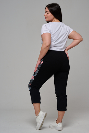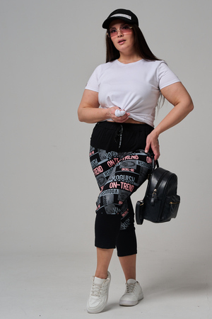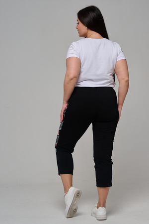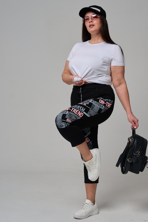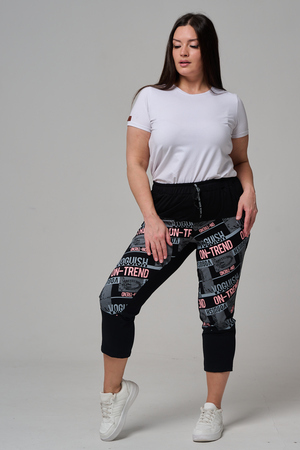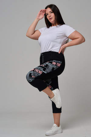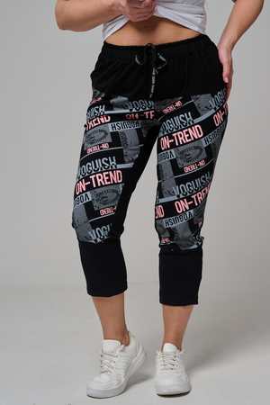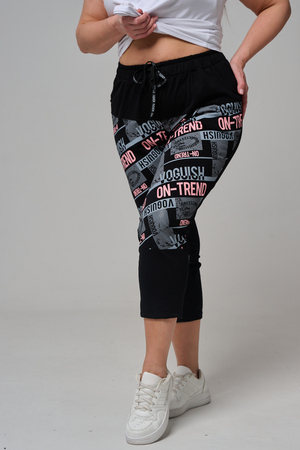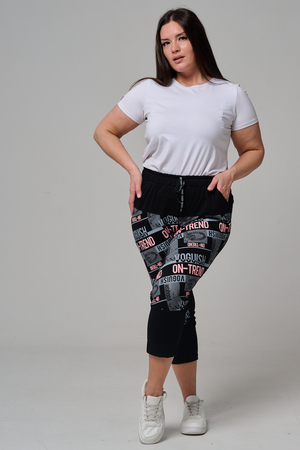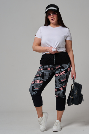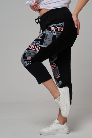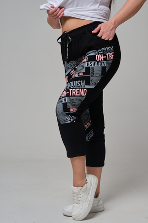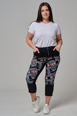 Брюки женские, свободные по бедрам, зауженные к низу. Спереди внутренние карманы, пояс эластичный со шнуром. На передних половинках брюк принт. Идеальны для повседневной носки.