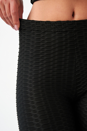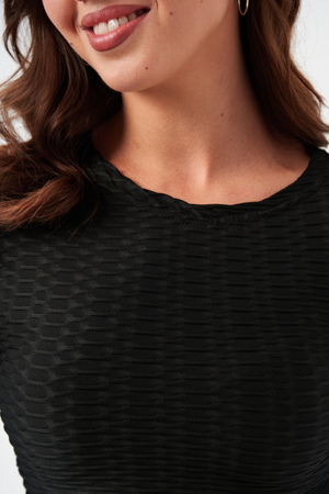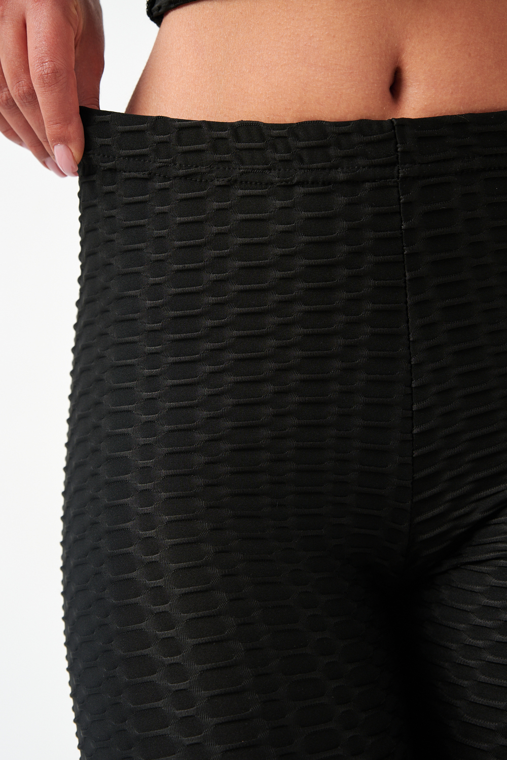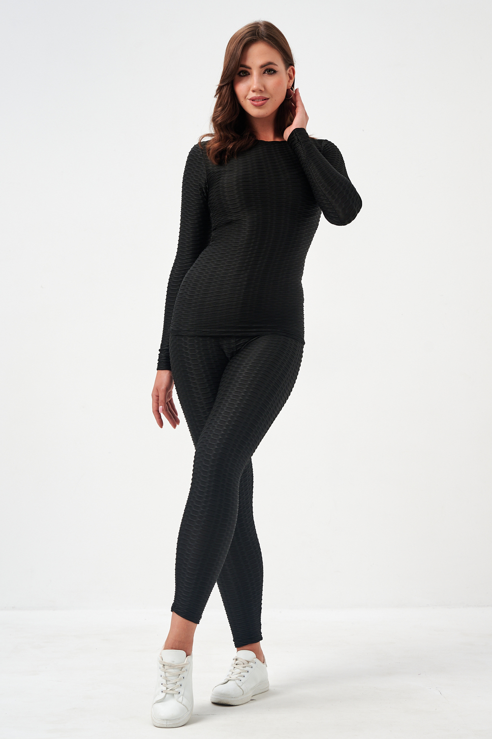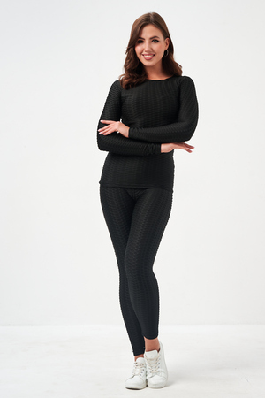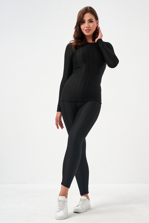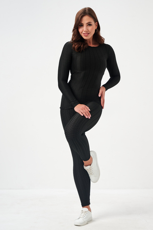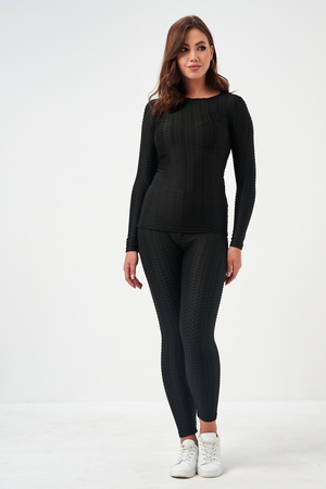Лосины, входящие в комплект, имеют высокую посадку, которая обеспечивает поддержку и формирует силуэт. Плоские швы предотвращают натирание и дискомфорт даже во время самых активных движений. Эластичный пояс надежно фиксирует лосины на талии, не сковывая движений.