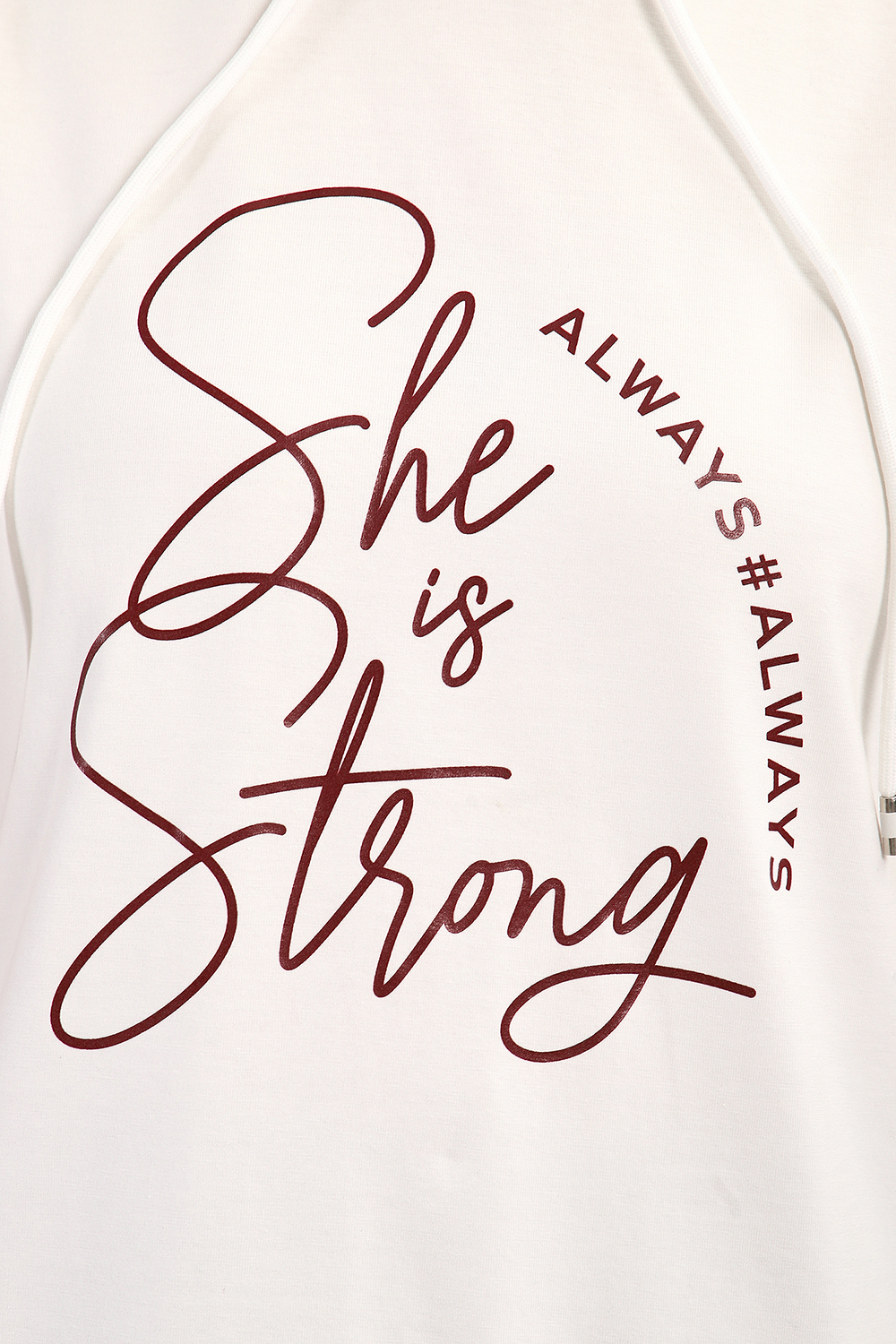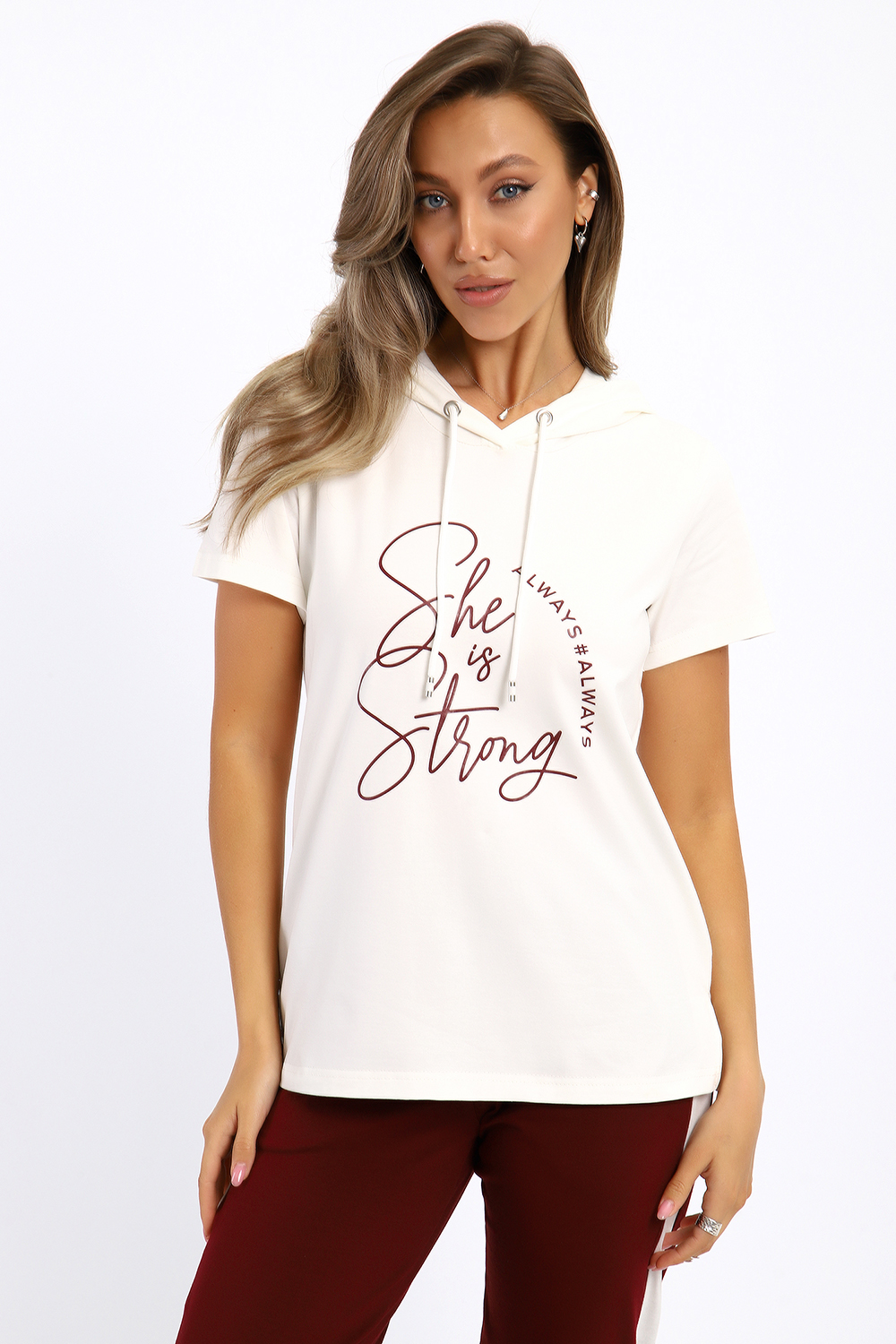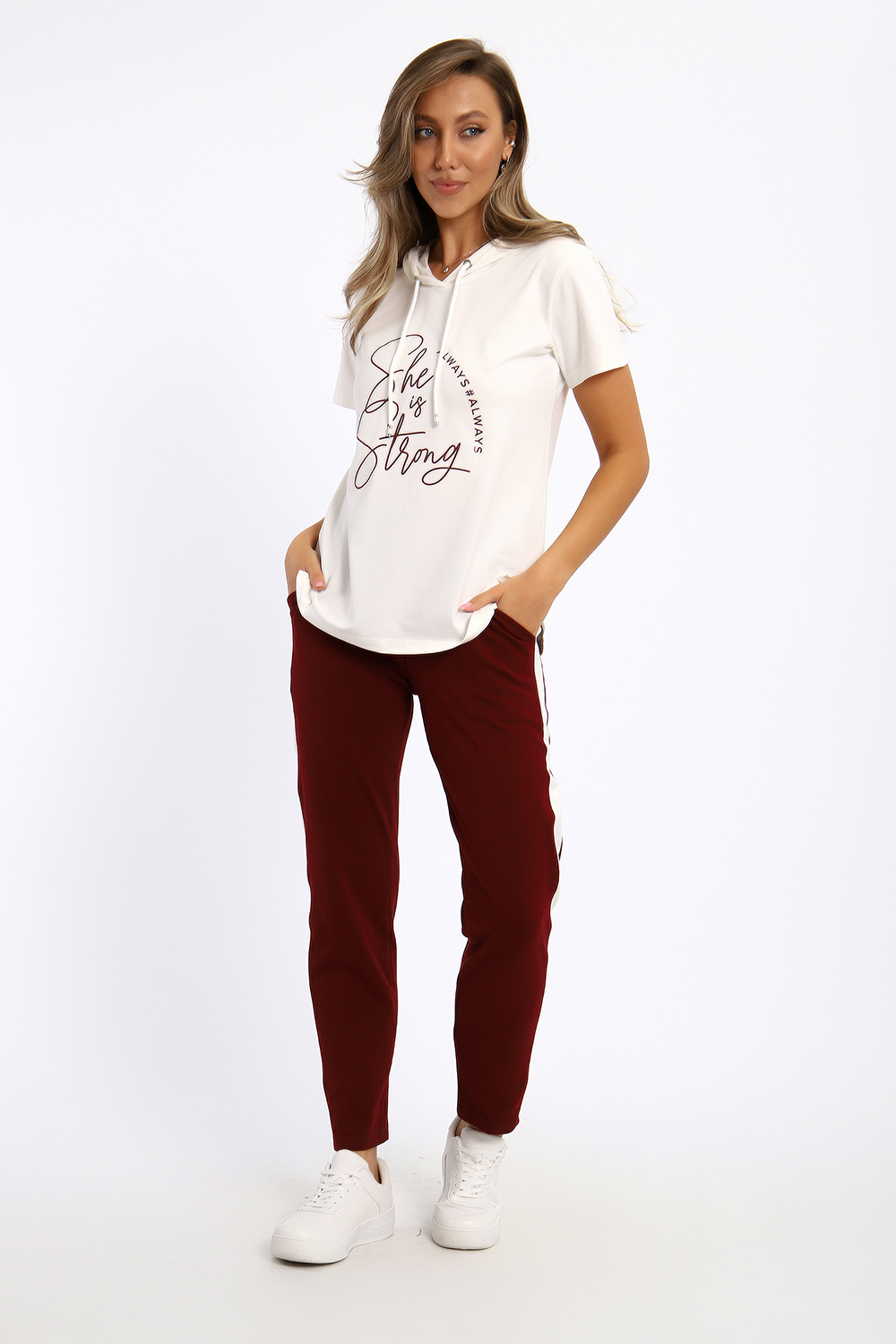 Удобный, женственный трикотажный костюм со спортивной ноткой подарит вам чувство комфорта  и позволит выглядеть сногсшибательно в любой ситуации! Костюм прекрасно подойдет для занятий спортом, пробежек или прогулок! Кофта белого цвета, с надписью латинскими буквами в цвет брюк,  имеет капюшон, способный защитить волосы от солнечных лучей, ветра или дождя. Объем капюшона регулирует изящный шнурок. На брюках имеются лампасы белого цвета, гармонирующие с цветом кофты.