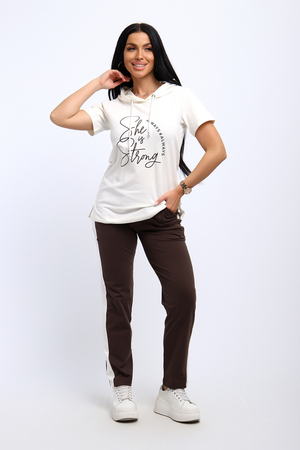 Удобный, женственный трикотажный костюм со спортивной ноткой подарит вам чувство комфорта и позволит выглядеть сногсшибательно в любой ситуации! Костюм прекрасно подойдет для занятий спортом, пробежек или прогулок! Кофта белого цвета, с надписью латинскими буквами в цвет брюк, имеет капюшон, способный защитить волосы от солнечных лучей, ветра или дождя. Объем капюшона регулирует изящный шнурок. На брюках имеются лампасы белого цвета, гармонирующие с цветом кофты.
