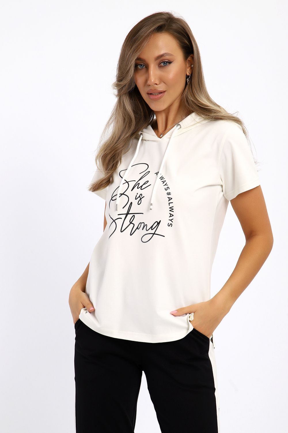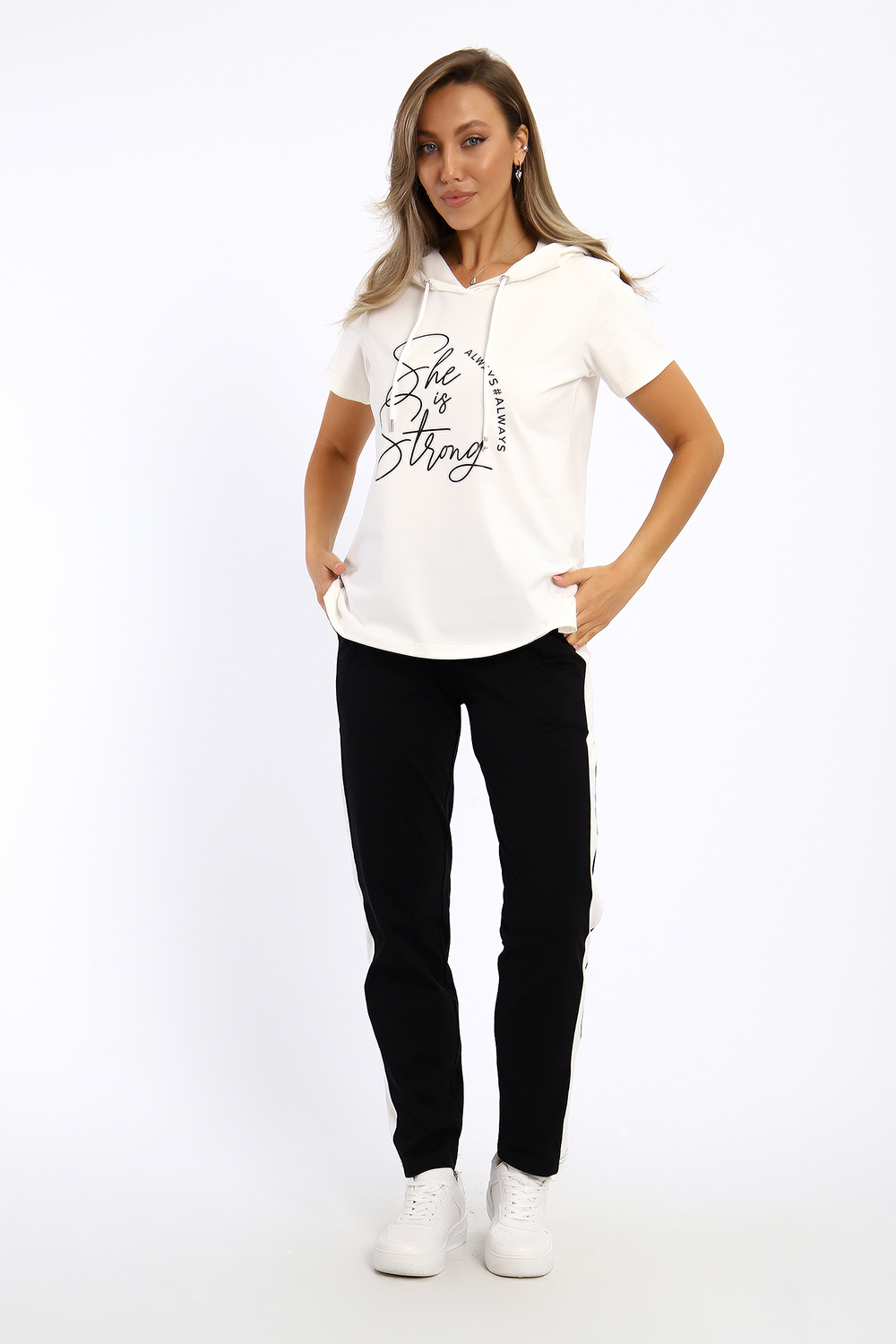 Удобный, женственный трикотажный костюм со спортивной ноткой подарит вам чувство комфорта и позволит выглядеть сногсшибательно в любой ситуации! Костюм прекрасно подойдет для занятий спортом, пробежек или прогулок! Кофта белого цвета, с надписью латинскими буквами в цвет брюк, имеет капюшон, способный защитить волосы от солнечных лучей, ветра или дождя. Объем капюшона регулирует изящный шнурок. На брюках имеются лампасы белого цвета, гармонирующие с цветом кофты.