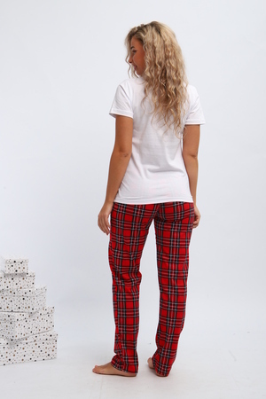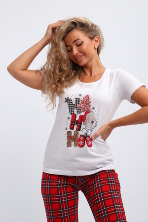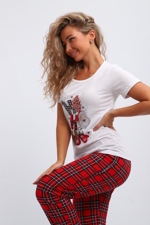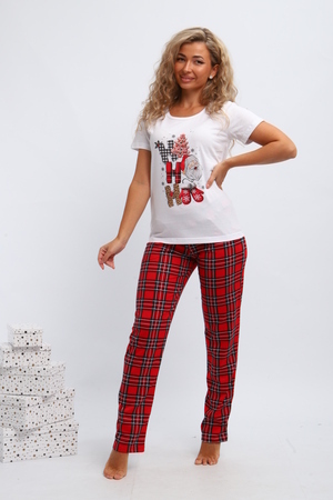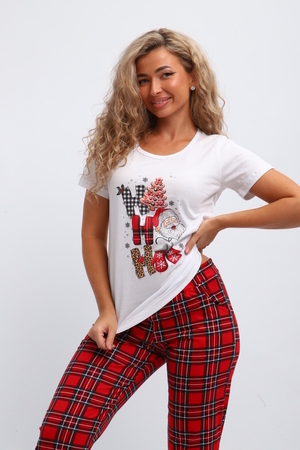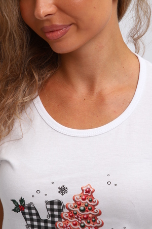 Стильный и модный набор для дома, который станет отличным выбором для девушек и женщин. Этот комплект создан с учетом всех современных тенденций, обеспечивая комфорт и удобство повседневной носки. Трикотажный материал приятно ощущается на коже, благодаря чему костюм идеально подходит для отдыха и сна. Этот красивый пижамный комплект включает в себя уютную футболку и брюки на резинке. Мягкий трикотаж обеспечивает свободу движений и комфорт в любое время суток. Одежда выполнена в ярком стиле, чтобы вы чувствовали себя привлекательно даже дома. Особенным украшением комплекта является оригинальный новогодний принт, создающий милый и игривый образ.