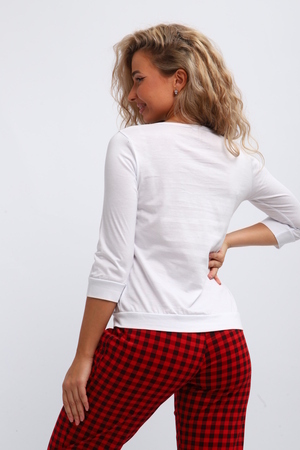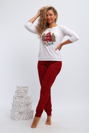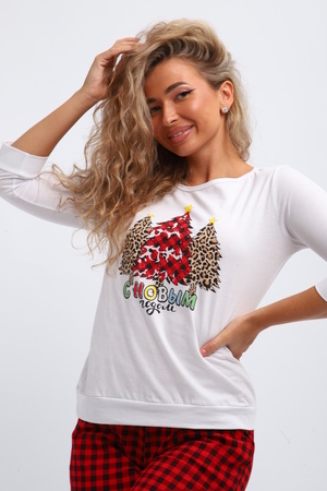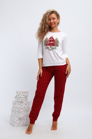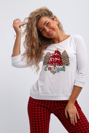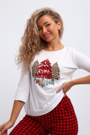 Стильный и модный набор для дома, который станет отличным выбором для девушек и женщин. Этот комплект создан с учетом всех современных тенденций, обеспечивая комфорт и удобство повседневной носки. Трикотажный материал приятно ощущается на коже, благодаря чему костюм идеально подходит для отдыха и сна. Этот красивый пижамный комплект включает в себя уютную кофту с рукавами ¾ и брюками на резинке. Мягкий трикотаж обеспечивает свободу движений и комфорт в любое время суток. Одежда выполнена в ярком стиле, чтобы вы чувствовали себя привлекательно даже дома. Особенным украшением комплекта является оригинальный новогодний принт, создающий милый и игривый образ.