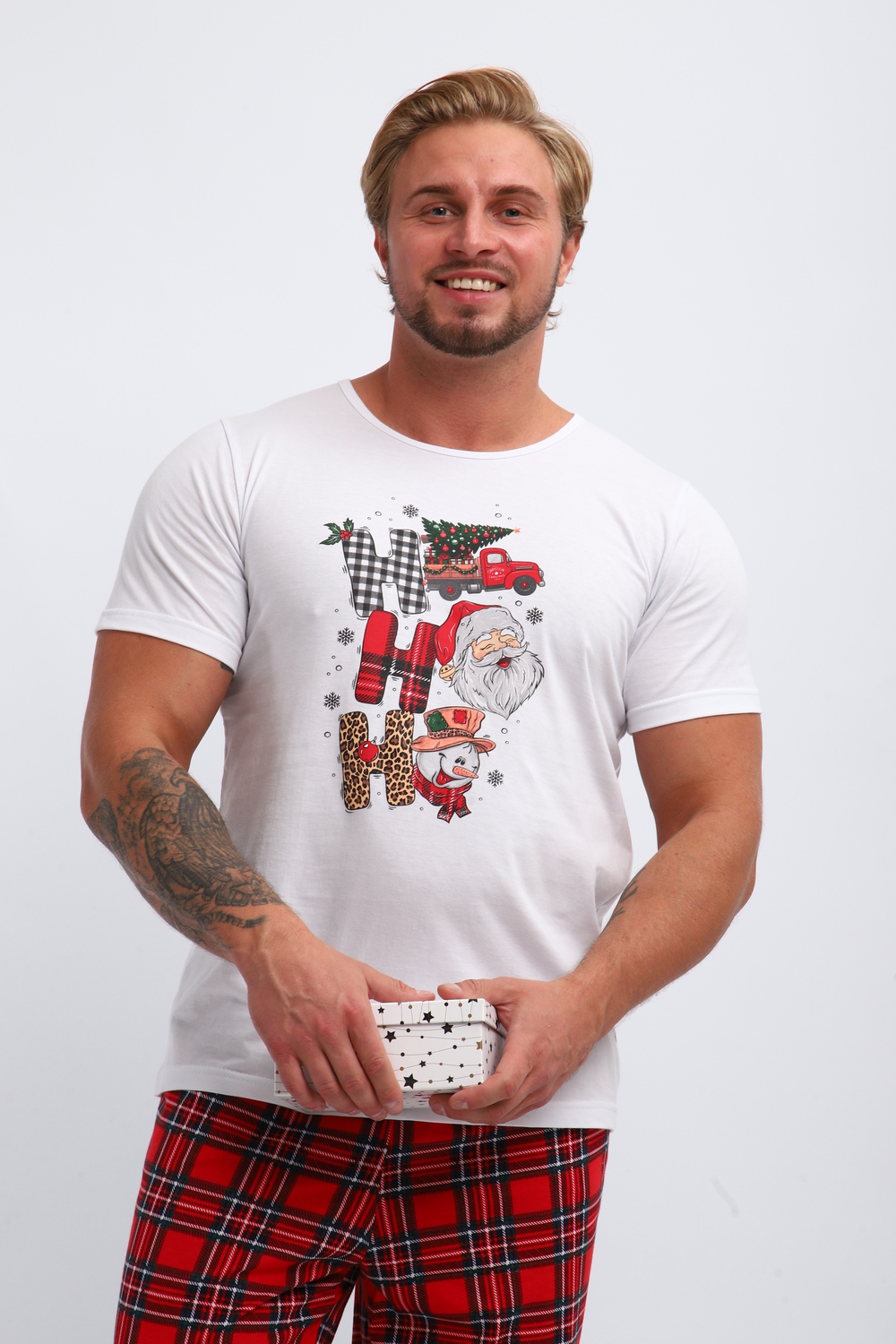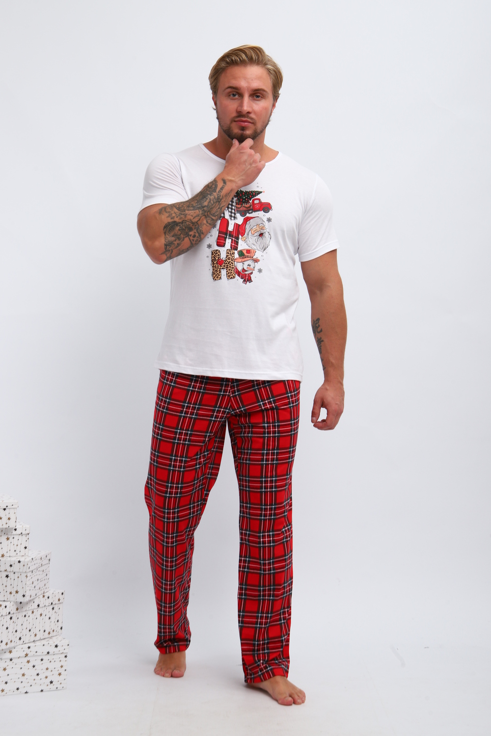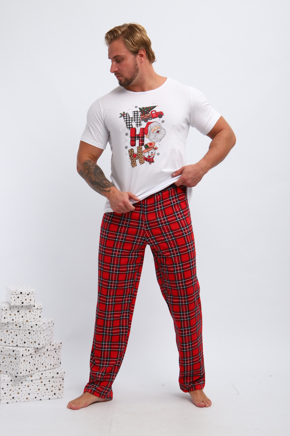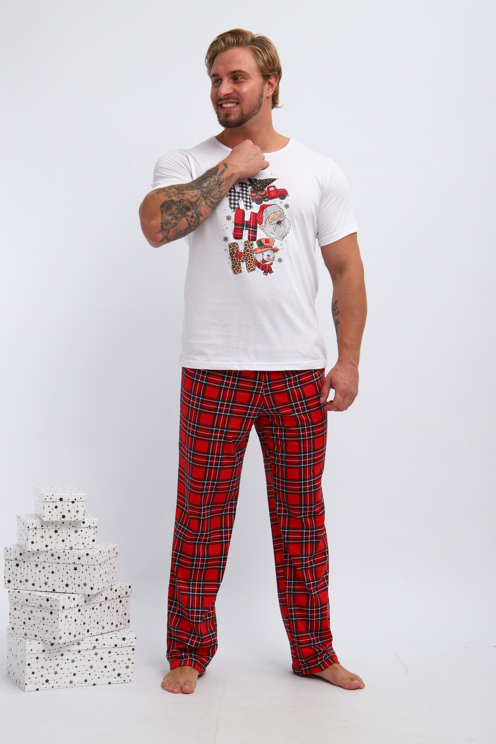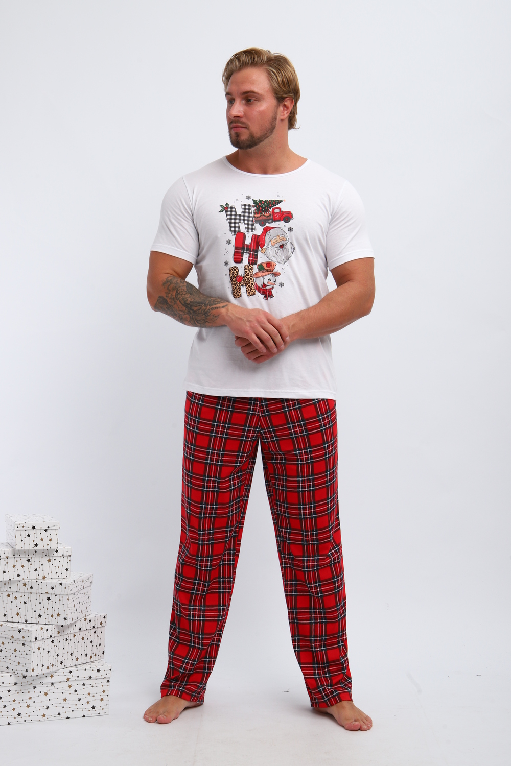 Стильный и модный набор для дома, который станет отличным выбором для мужчин. Этот комплект создан с учетом всех современных тенденций, обеспечивая комфорт и удобство повседневной носки. Трикотажный материал приятно ощущается на коже, благодаря чему костюм идеально подходит для отдыха и сна. Этот красивый пижамный комплект включает в себя уютную футболку и брюки. Мягкий трикотаж обеспечивает свободу движений и комфорт в любое время суток. Одежда выполнена в ярком стиле, чтобы вы чувствовали себя привлекательно даже дома. Особенным украшением комплекта является оригинальный новогодний принт, создающий милый и игривый образ.