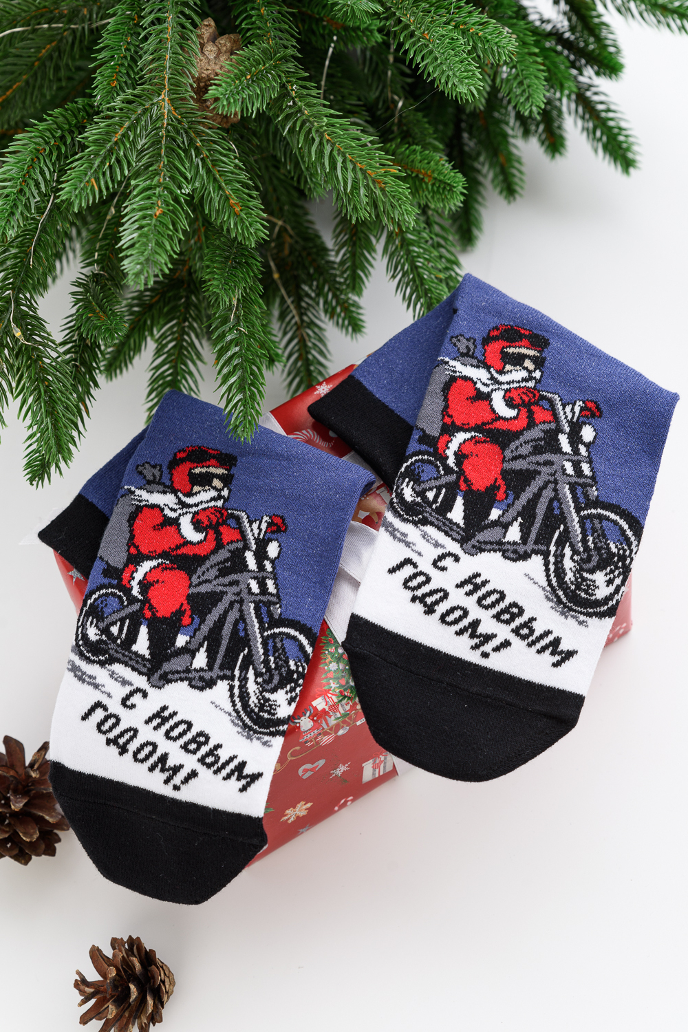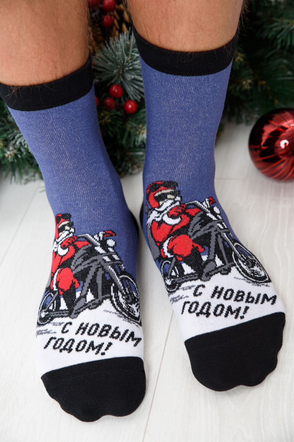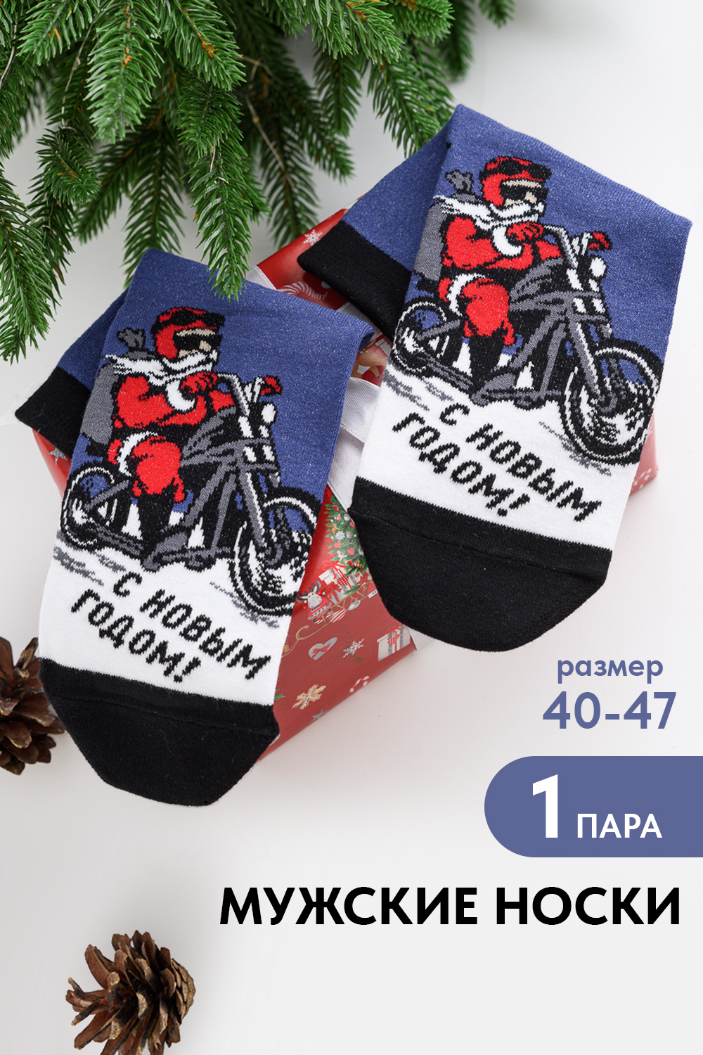 Оригинальные мужские новогодние носки. В комплекте 1 пара. На основной части носка изображение Санта Клауса и надпись "С новый годом".